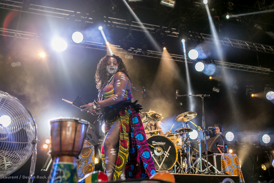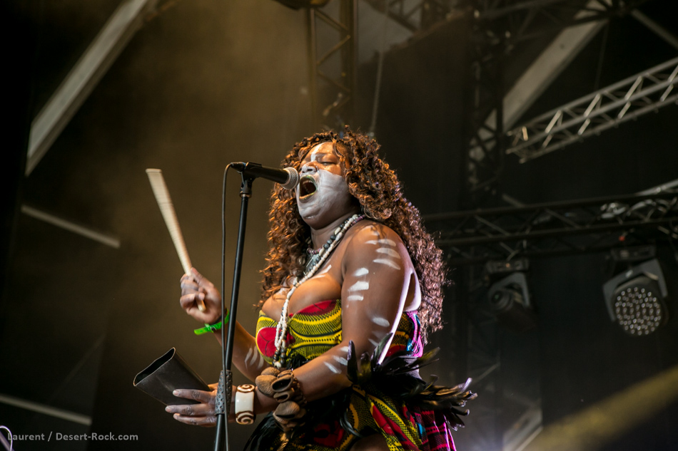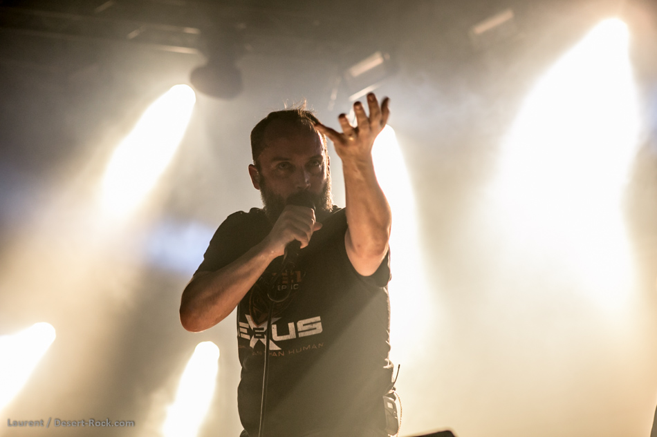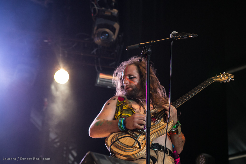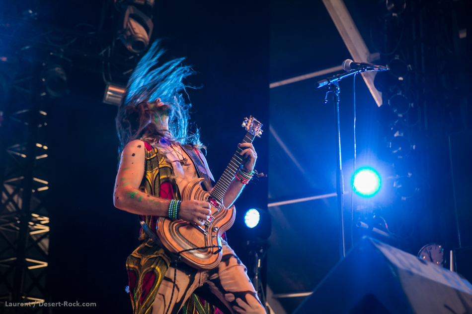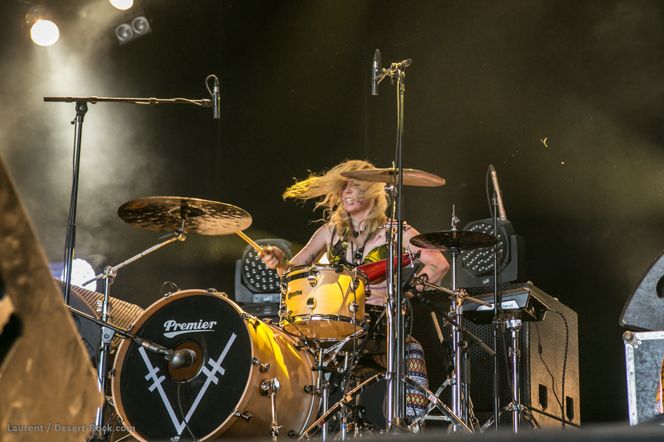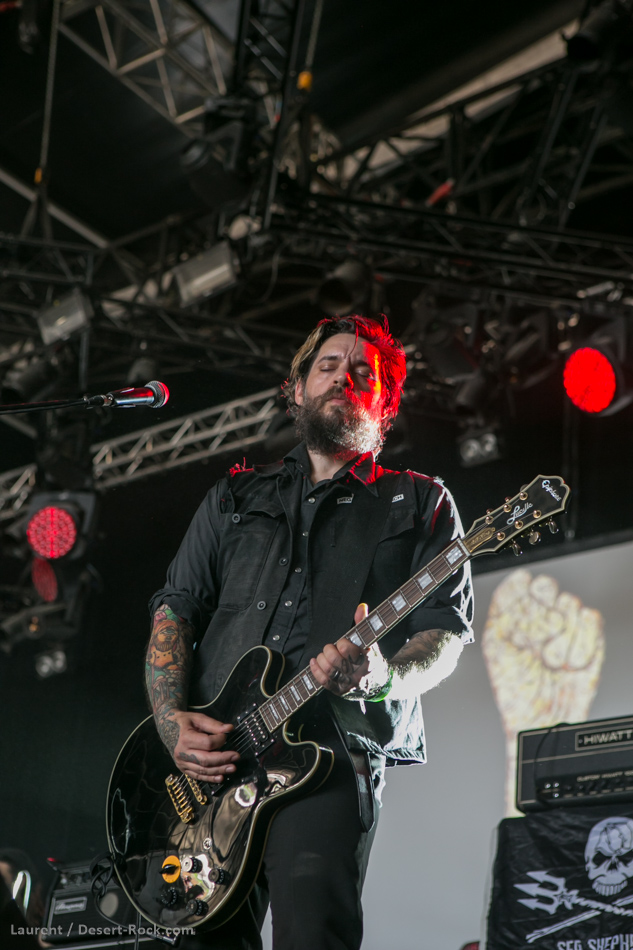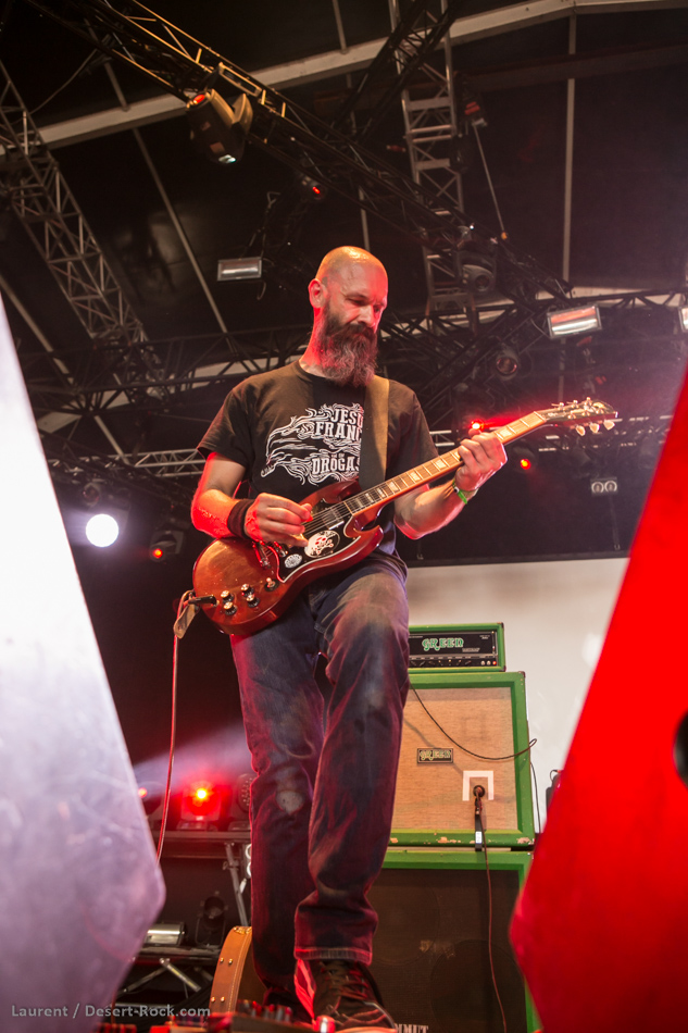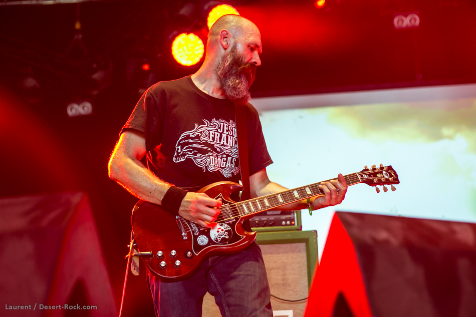 Ce n’est pas uniquement jour d’élection en ce troisième jour, c’est aussi l’anniversaire de Jonas l’un des trois (trois !!!) guitaristes de la formation britannique qui déploie son œuvre hors du contexte purement stoner. Pour la photo de famille, les photographes présents dans la place ont misé sur un objectif à l’angle XXL afin de faire rentrer les 8 protagonistes de cette chose sur un seul et même cliché. Si ça a sacrément de la gueule autant de monde aligné comme ça sur scène, si côté dégaine le groupe envoie – et se réfère à du – lourd et si la présence féminine fait toujours plaisir dans ce monde de brutes épaisses avinées par la bière, c’était un peu light quand-même question gros son. Si Crippled Black Phoenix est capable de prouesses envoûtantes, le groupe a aussi tout le potentiel de ramollir le public de la Valley (un peu comme celui de l’abus de Muscadet sur la bite des festivaliers de Clisson). Malheureusement, les Anglais ont opté pour un setlist très axé sur la partie calme de leur répertoire et leur show déployé sous une chaleur à la limite du supportable ne restera pas dans les annales comme la meilleure prestation de cette formation – nous les avons connus nettement plus énervés sur scène et ce registre leur sied plutôt vachement bien. La torpeur gagnant les âmes errant depuis trois jours sous la chaleur et dans la poussière en accumulant les courtes nuits de sommeil n’est certainement pas étrangère à notre ressenti ; tant pis pour nos gueules !