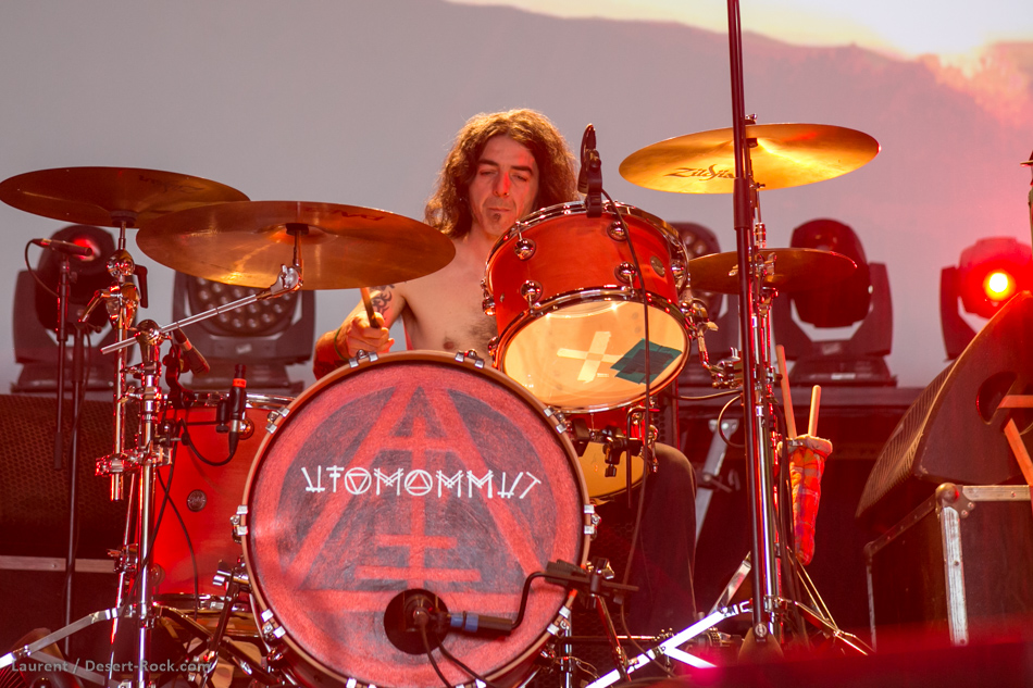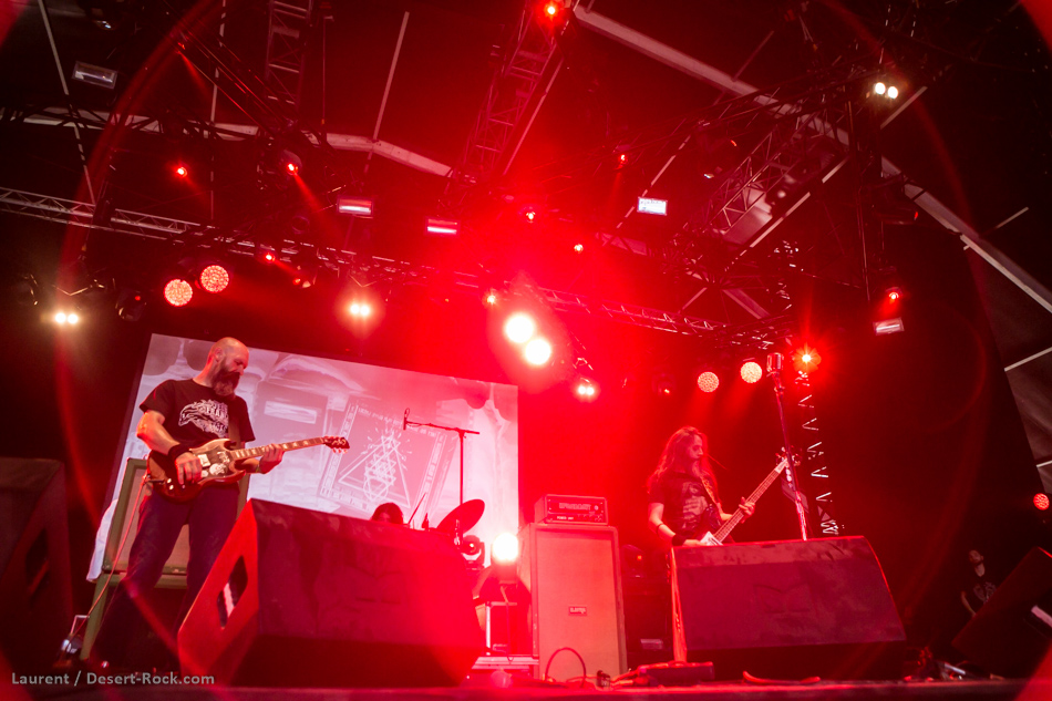 Sans parler d’heureuse surprise, l’on est content de retrouver le trio transalpin aussi haut sur l’affiche, bénéficiant d’un slot « charnière » de fin d’après-midi intéressant. Un signe aussi de reconnaissance qu’il leur faut maintenant valider ; on n’attend donc rien moins qu’un coup de massue pour les 40 minutes à venir. Et coup de massue il y eut. Voire plutôt bulldozer, tant le matraquage en règle appliqué au public fut long, répétitif et ininterrompu. Chaque titre défilant sur la set list « taylorisée » du groupe labourait un peu plus le sillon d’un doom désormais estampillé « Ufomammut » : riffs pachydermiques, rythmique massue, assénée de manière répétitive et lancinante, éructation vocales… La combinaison est désormais reconnaissable entre mille et fait montre d’une efficacité live simplement époustouflante. Par ailleurs, dégagés de tout impératif « promo », le trio nous gratifie d’une set list impeccable, piochant un peu partout dans sa discographie, et incluant au passage deux nouveaux titres, extraits de son album à venir (et on vous rassure, en première écoute, ils semblent bien tabasser). Clairement, on est écrasés au sol pendant tout le set, et on finit les yeux grands ouverts, sans trop comprendre ce qui s’est réellement passé. Ufomammut atteint un statut indétrônable, maîtrisant l’exercice à la perfection. S’ils arrivent encore à se renouveler (à voir avec leur prochain album studio, imminent) sans dégrader leur performance scénique, on tient sous nos yeux un des rares groupes de doom capables d’élever le genre sur des scènes plus exposées, vers des publics plus variés.