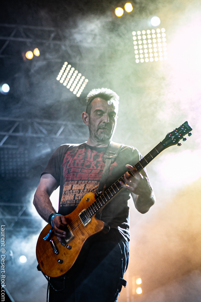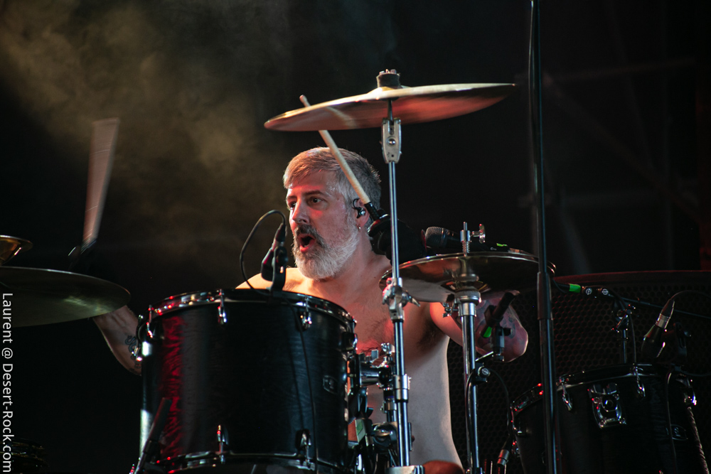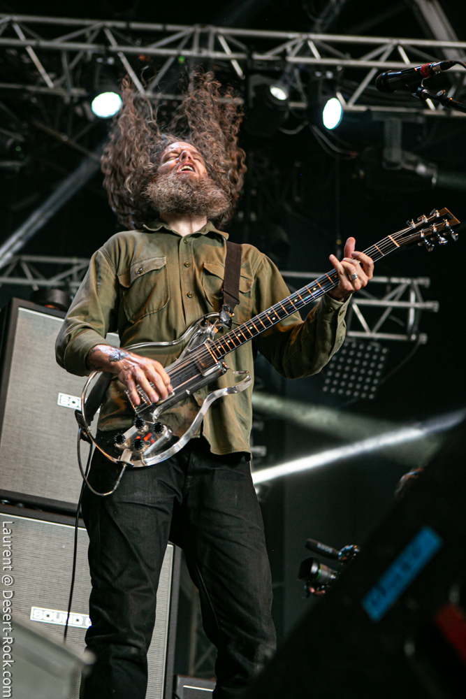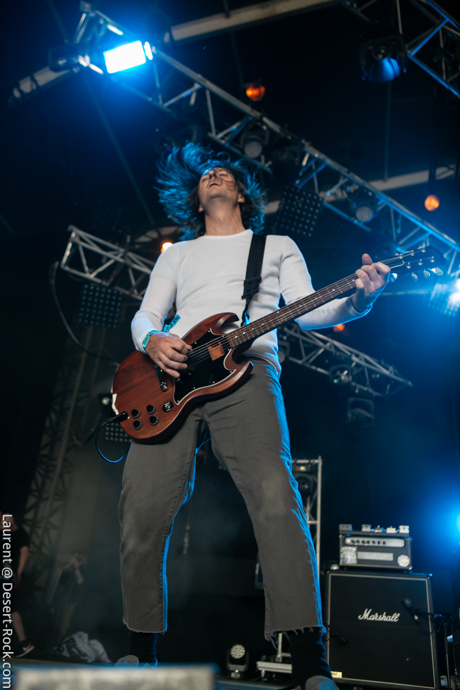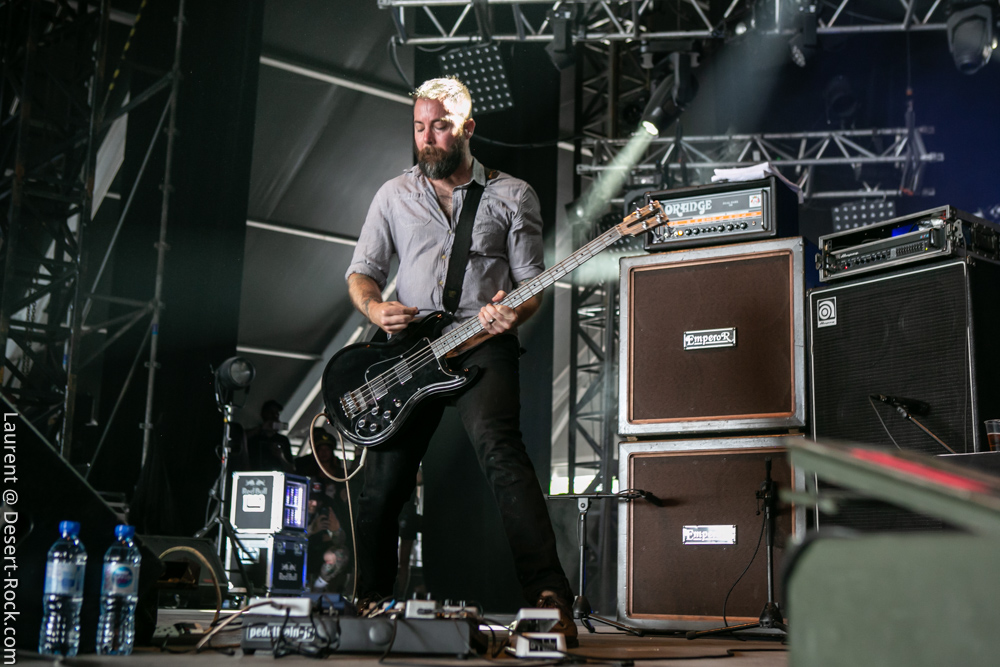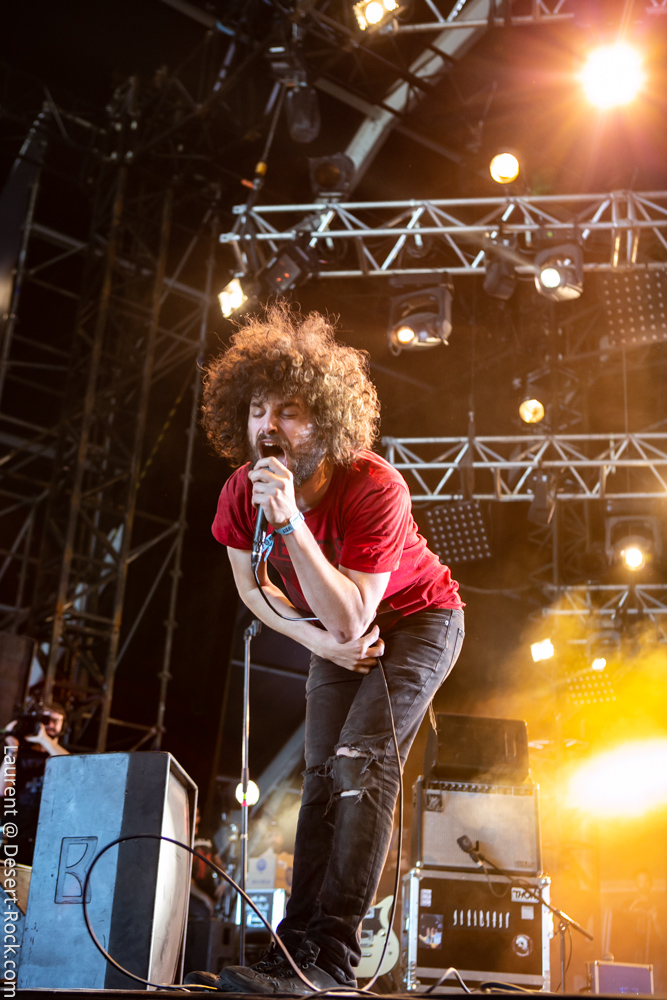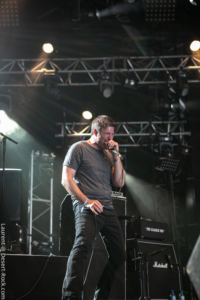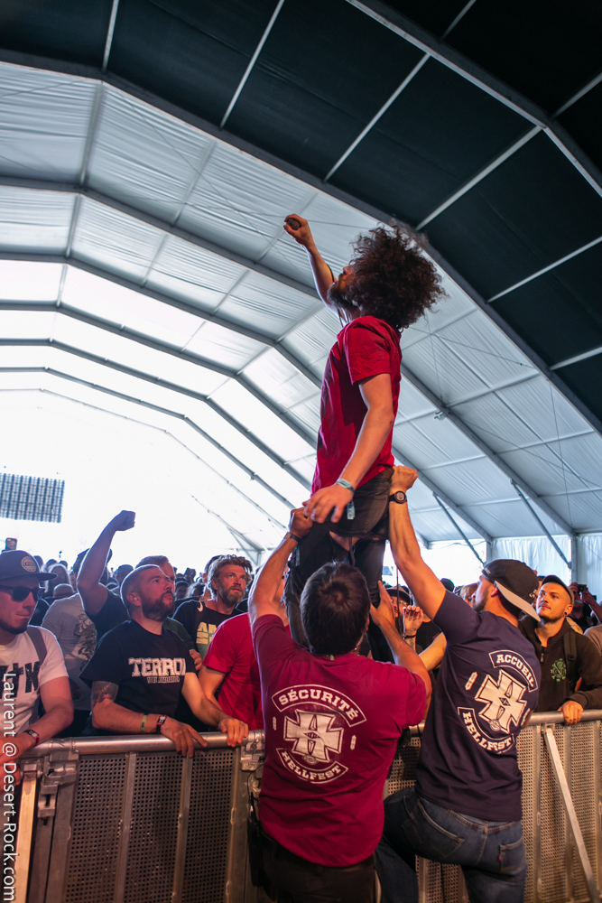 Début de deuxième jour pimenté avec Coilguns et son mélange de Post-Core, Sludge aux influences brutales. Ça décrasse les cages à miel et réveille en un rien de temps. Alors oui c’est brutal, mais le quartet Suisse n’aura pas manqué d’attention pour son public en commençant avec une distribution de croissants. On sent bien que pour eux, c’est la chance de leur vie d’être convié sur une scène si reconnue et le chanteur Louis d’expliquer : « on joue devant des personnes différentes dans des petites salles toute l’année et si j’ai bien compris ici c’est toutes ces mêmes personnes réunies… ». Sauts sur scène, roulades épileptiques, ce dernier va jusqu’à finir un morceau en slammant jusqu’au milieu de la fosse. Si le style n’est pas toujours des plus Desert-Rock-compatible cette ouverture prédit une journée riche en émotions comme l’annoncent les câlins faits au public et le jet de CD dans la fosse en fin de set. Un samedi en enfer commence.
