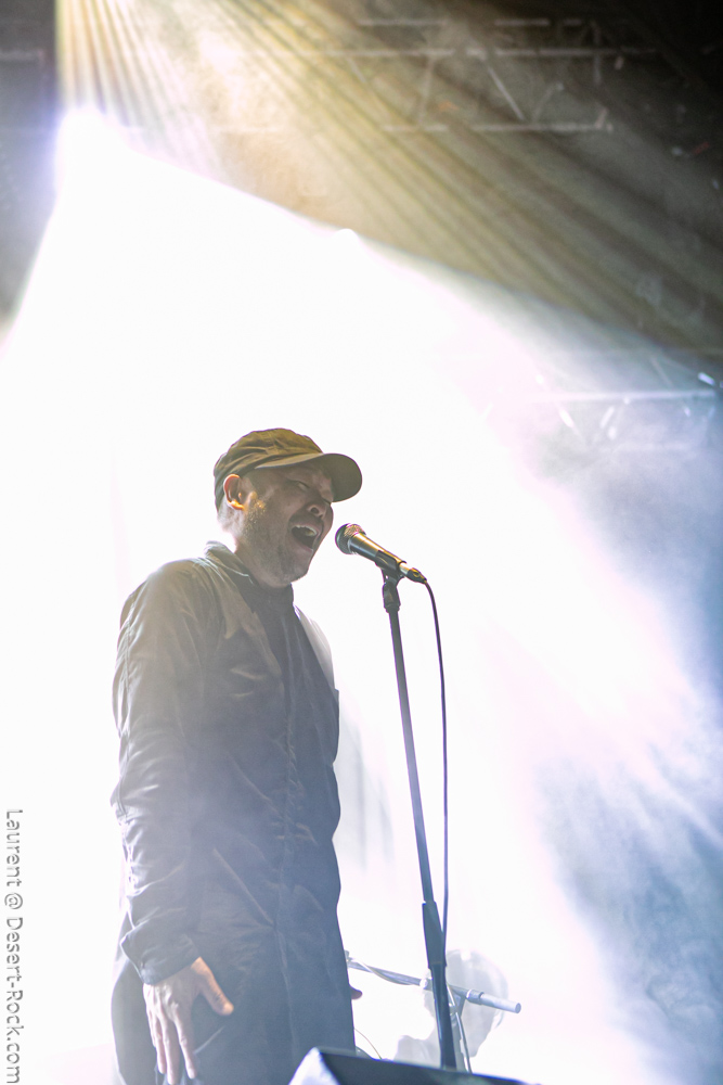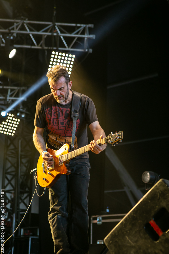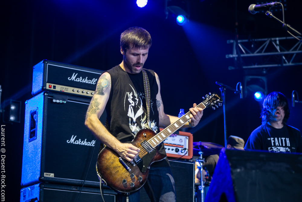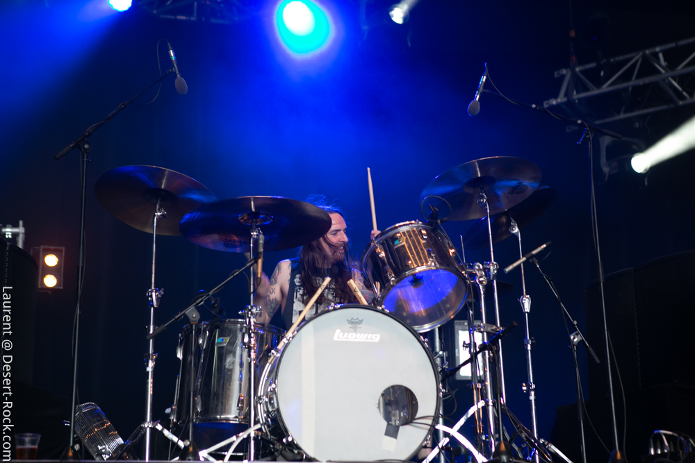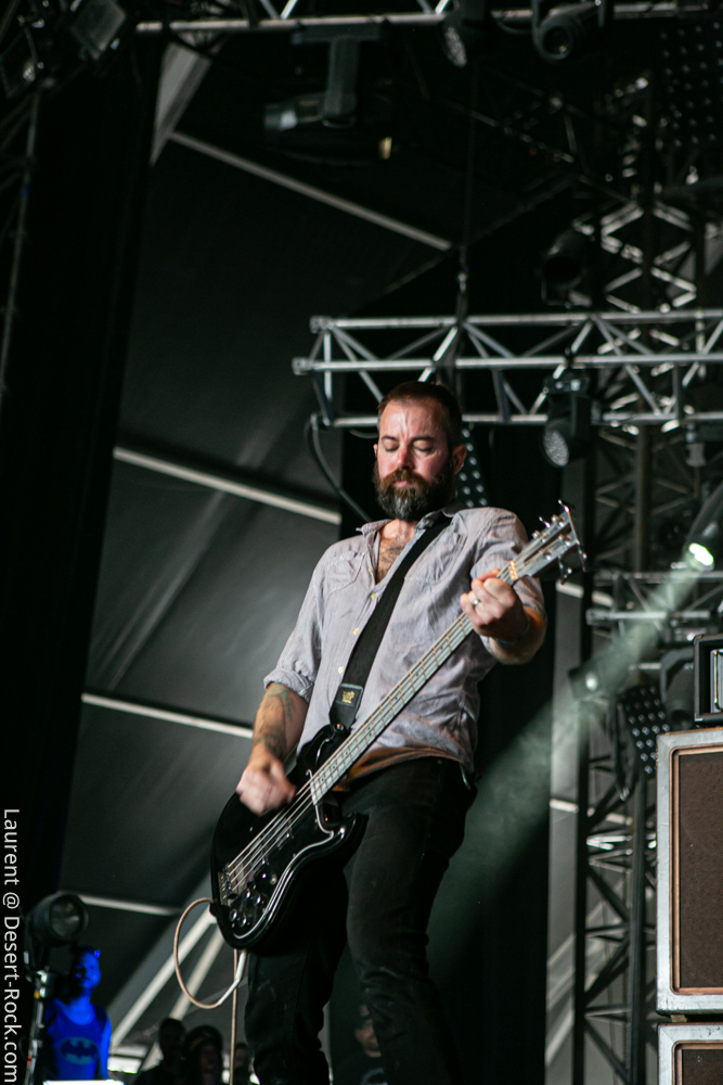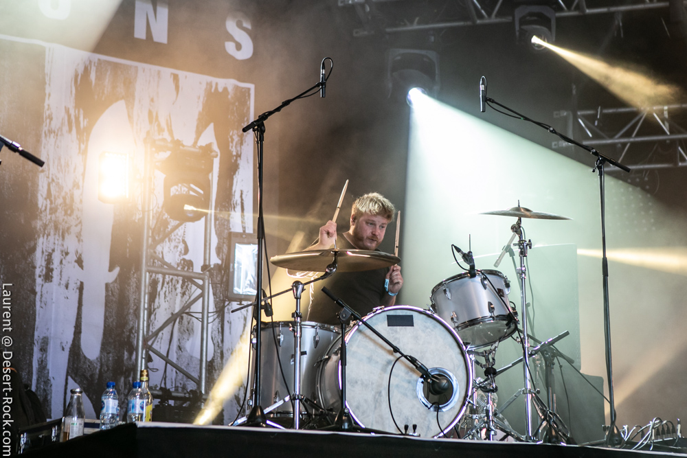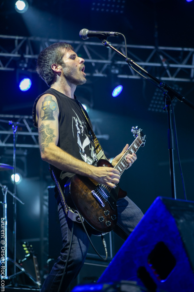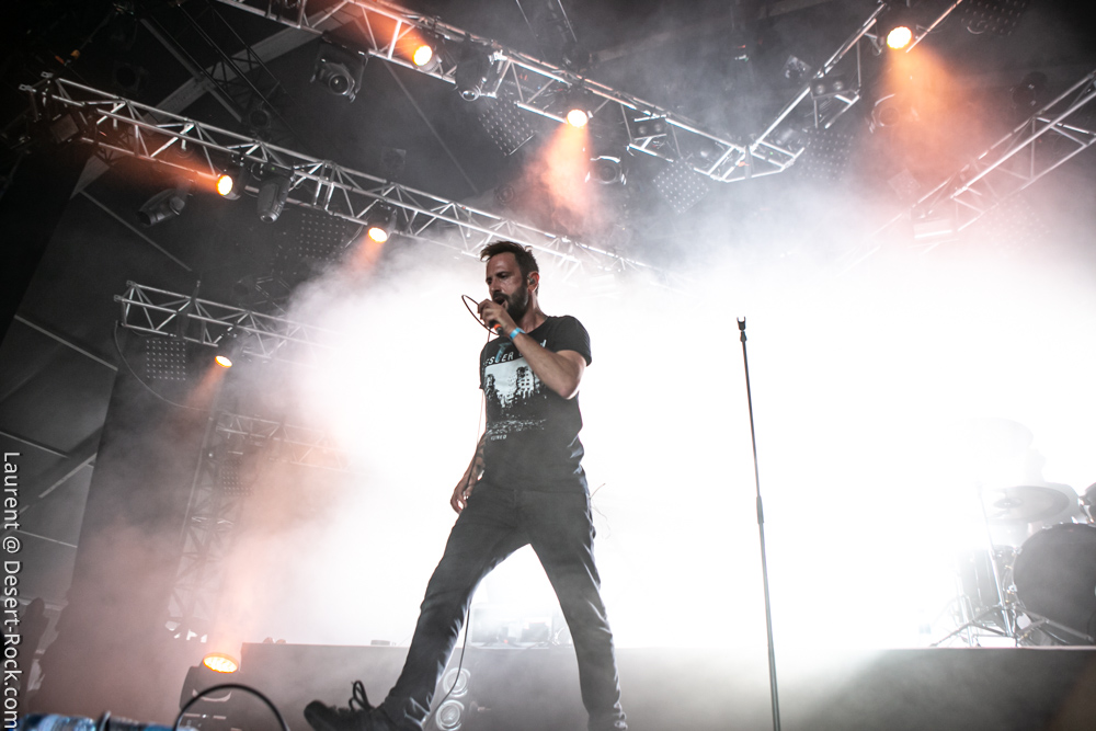 Début de deuxième jour pimenté avec Coilguns et son mélange de Post-Core, Sludge aux influences brutales. Ça décrasse les cages à miel et réveille en un rien de temps. Alors oui c’est brutal, mais le quartet Suisse n’aura pas manqué d’attention pour son public en commençant avec une distribution de croissants. On sent bien que pour eux, c’est la chance de leur vie d’être convié sur une scène si reconnue et le chanteur Louis d’expliquer : « on joue devant des personnes différentes dans des petites salles toute l’année et si j’ai bien compris ici c’est toutes ces mêmes personnes réunies… ». Sauts sur scène, roulades épileptiques, ce dernier va jusqu’à finir un morceau en slammant jusqu’au milieu de la fosse. Si le style n’est pas toujours des plus Desert-Rock-compatible cette ouverture prédit une journée riche en émotions comme l’annoncent les câlins faits au public et le jet de CD dans la fosse en fin de set. Un samedi en enfer commence.