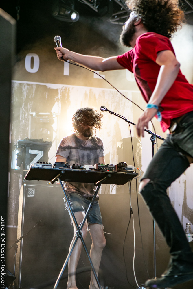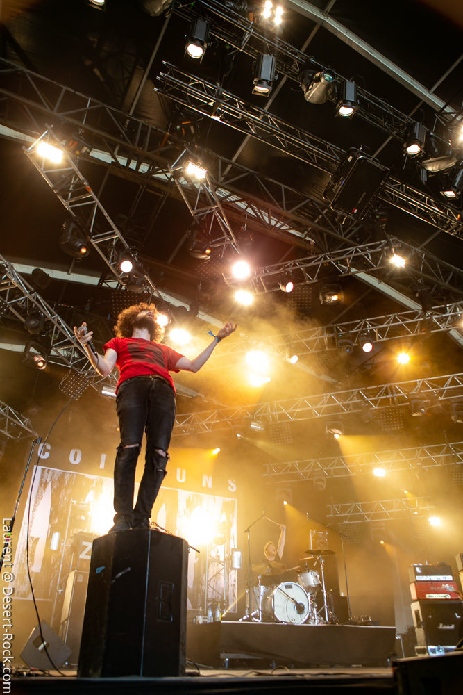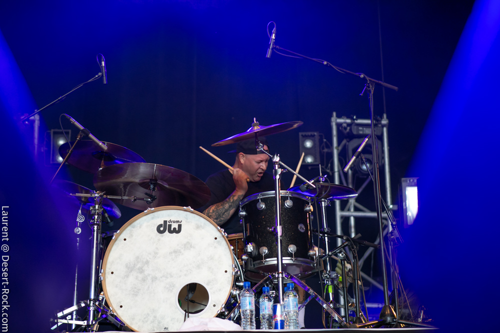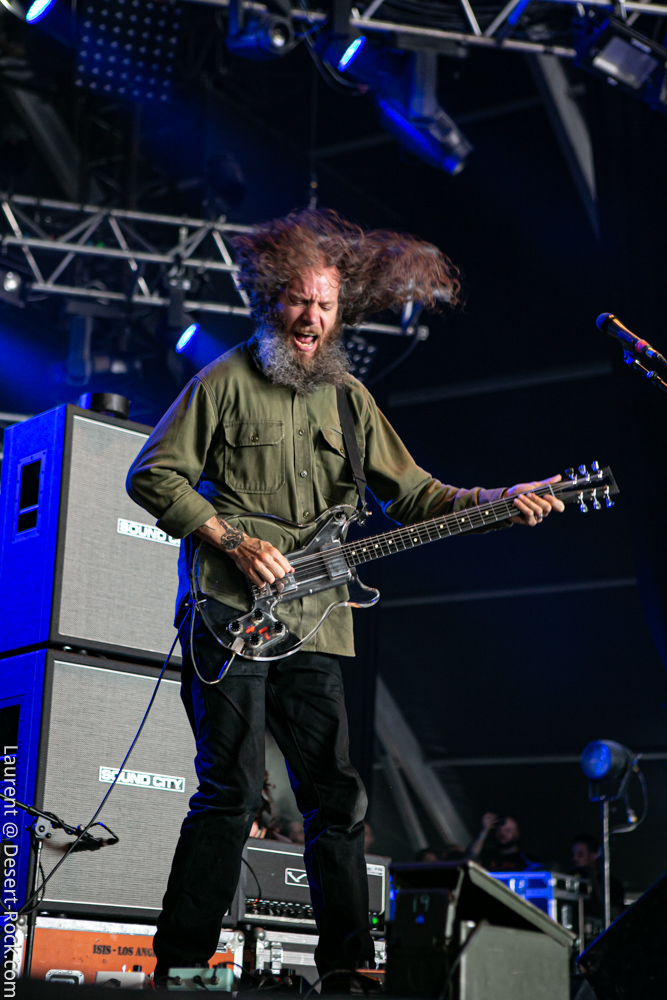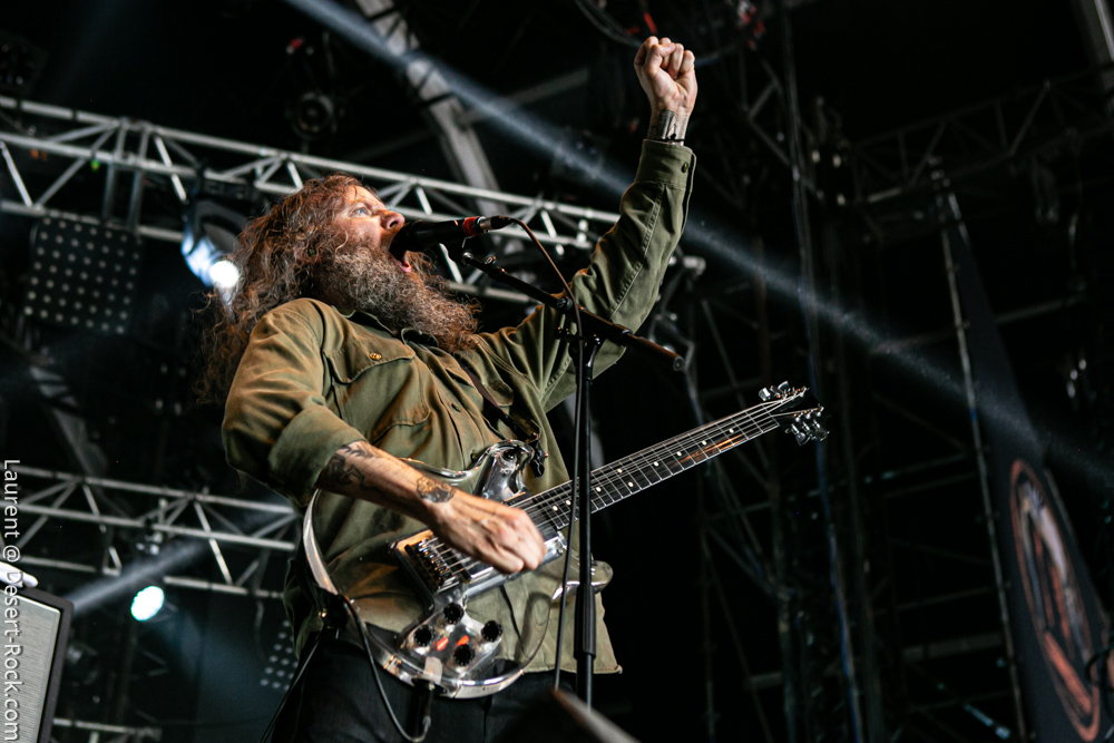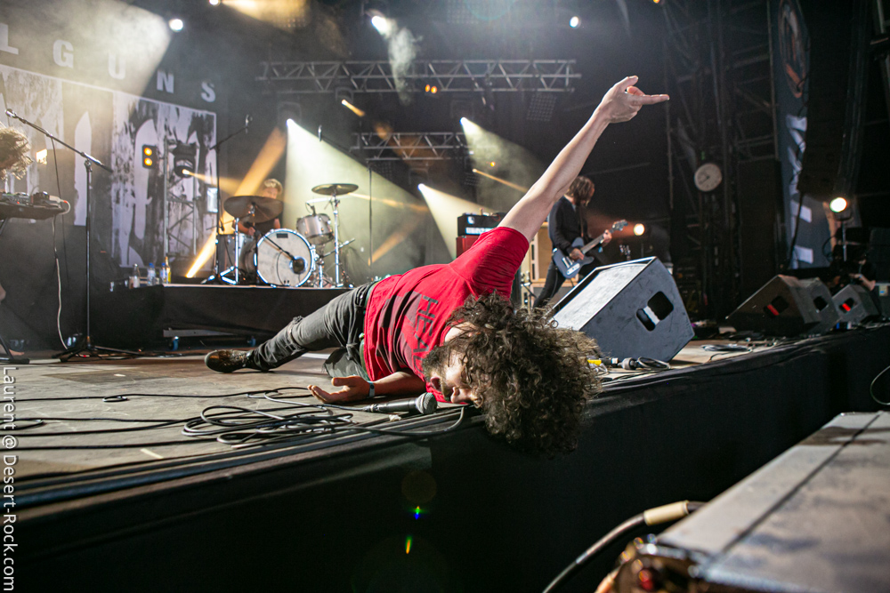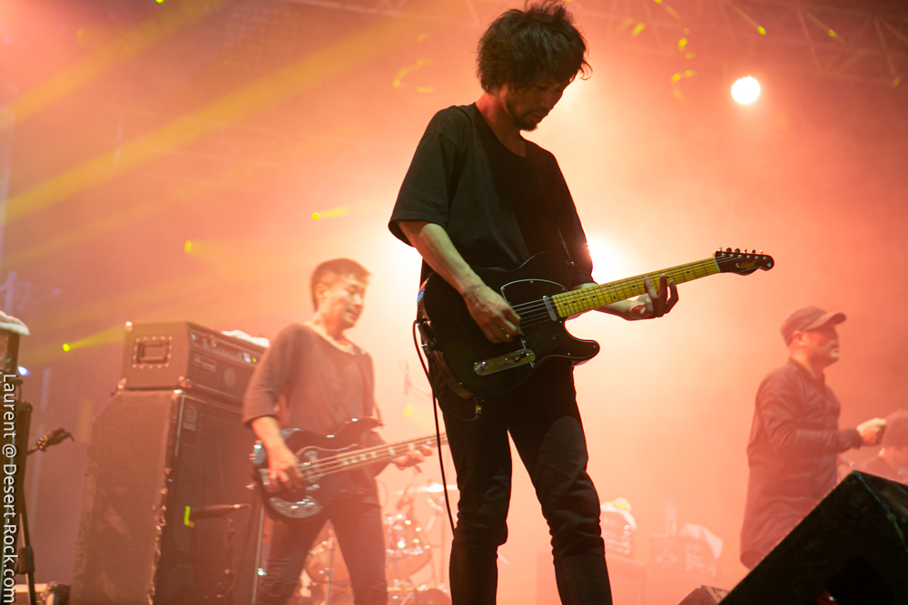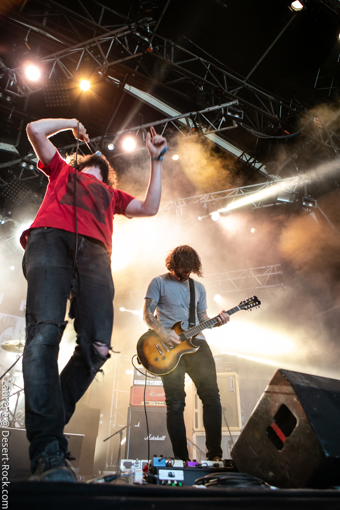 Début de deuxième jour pimenté avec Coilguns et son mélange de Post-Core, Sludge aux influences brutales. Ça décrasse les cages à miel et réveille en un rien de temps. Alors oui c’est brutal, mais le quartet Suisse n’aura pas manqué d’attention pour son public en commençant avec une distribution de croissants. On sent bien que pour eux, c’est la chance de leur vie d’être convié sur une scène si reconnue et le chanteur Louis d’expliquer : « on joue devant des personnes différentes dans des petites salles toute l’année et si j’ai bien compris ici c’est toutes ces mêmes personnes réunies… ». Sauts sur scène, roulades épileptiques, ce dernier va jusqu’à finir un morceau en slammant jusqu’au milieu de la fosse. Si le style n’est pas toujours des plus Desert-Rock-compatible cette ouverture prédit une journée riche en émotions comme l’annoncent les câlins faits au public et le jet de CD dans la fosse en fin de set. Un samedi en enfer commence.