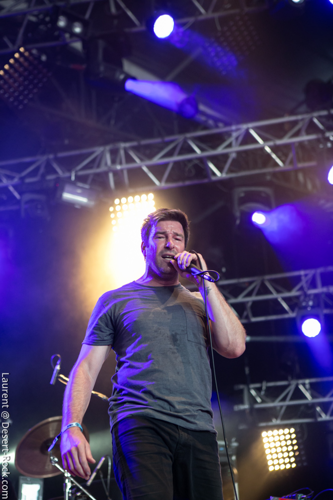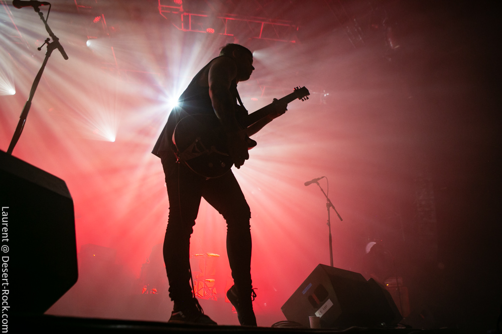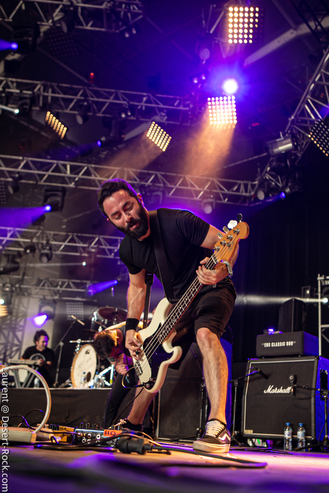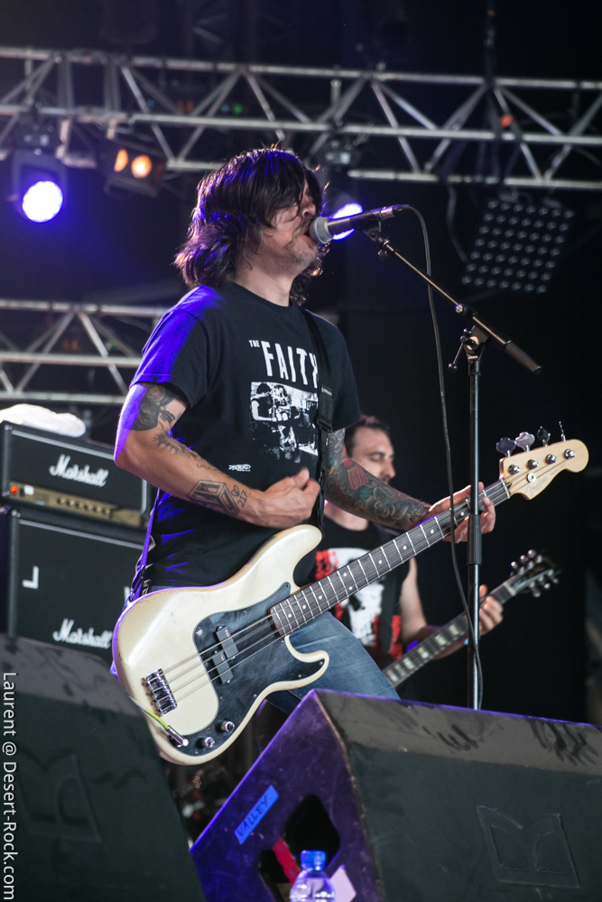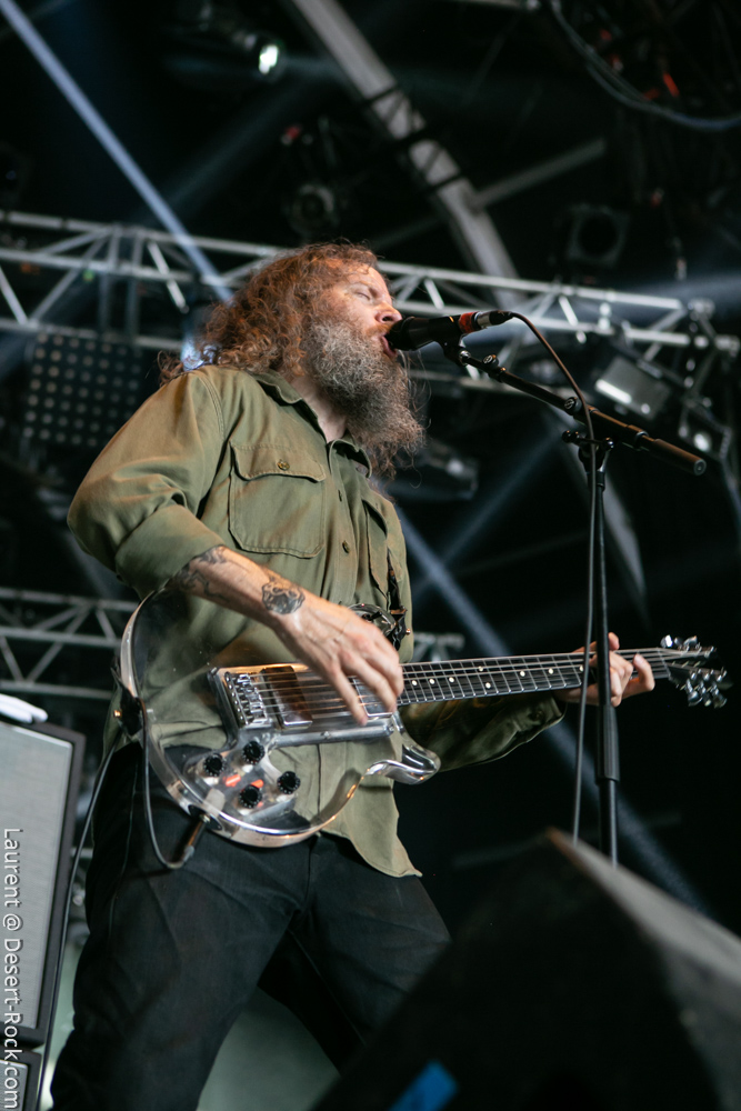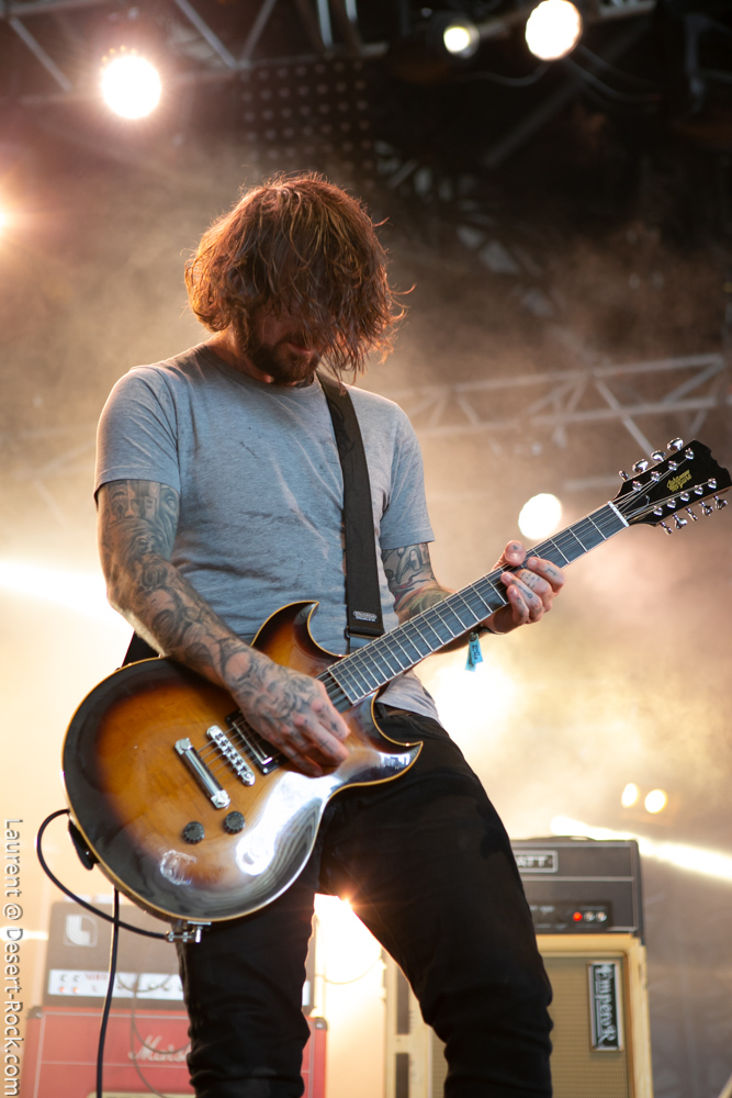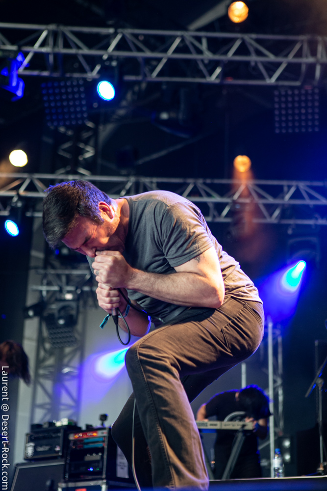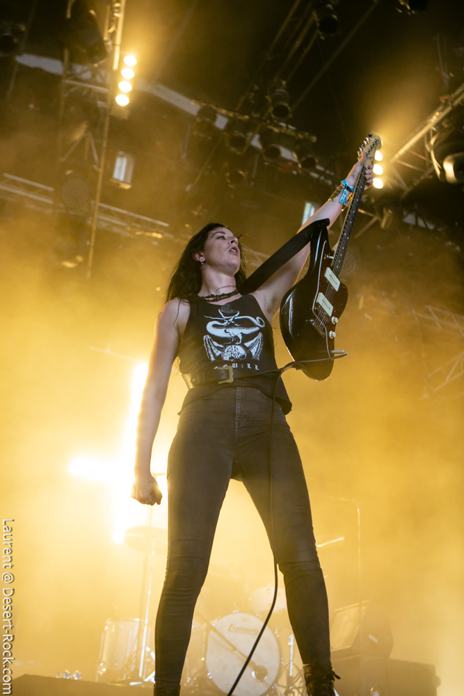 Début de deuxième jour pimenté avec Coilguns et son mélange de Post-Core, Sludge aux influences brutales. Ça décrasse les cages à miel et réveille en un rien de temps. Alors oui c’est brutal, mais le quartet Suisse n’aura pas manqué d’attention pour son public en commençant avec une distribution de croissants. On sent bien que pour eux, c’est la chance de leur vie d’être convié sur une scène si reconnue et le chanteur Louis d’expliquer : « on joue devant des personnes différentes dans des petites salles toute l’année et si j’ai bien compris ici c’est toutes ces mêmes personnes réunies… ». Sauts sur scène, roulades épileptiques, ce dernier va jusqu’à finir un morceau en slammant jusqu’au milieu de la fosse. Si le style n’est pas toujours des plus Desert-Rock-compatible cette ouverture prédit une journée riche en émotions comme l’annoncent les câlins faits au public et le jet de CD dans la fosse en fin de set. Un samedi en enfer commence.