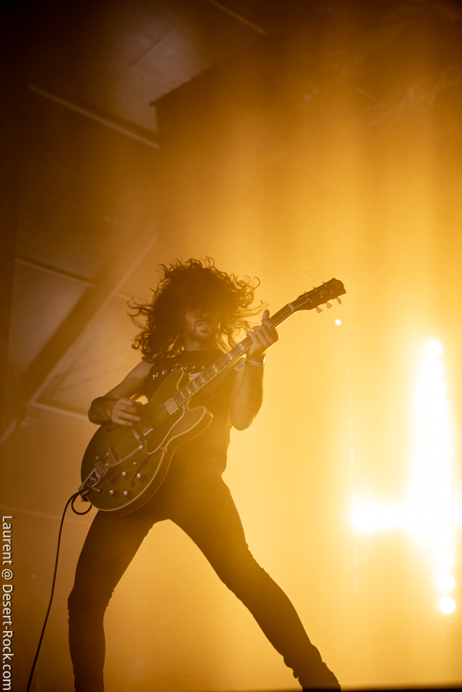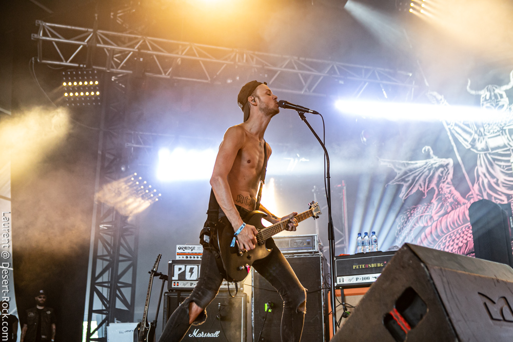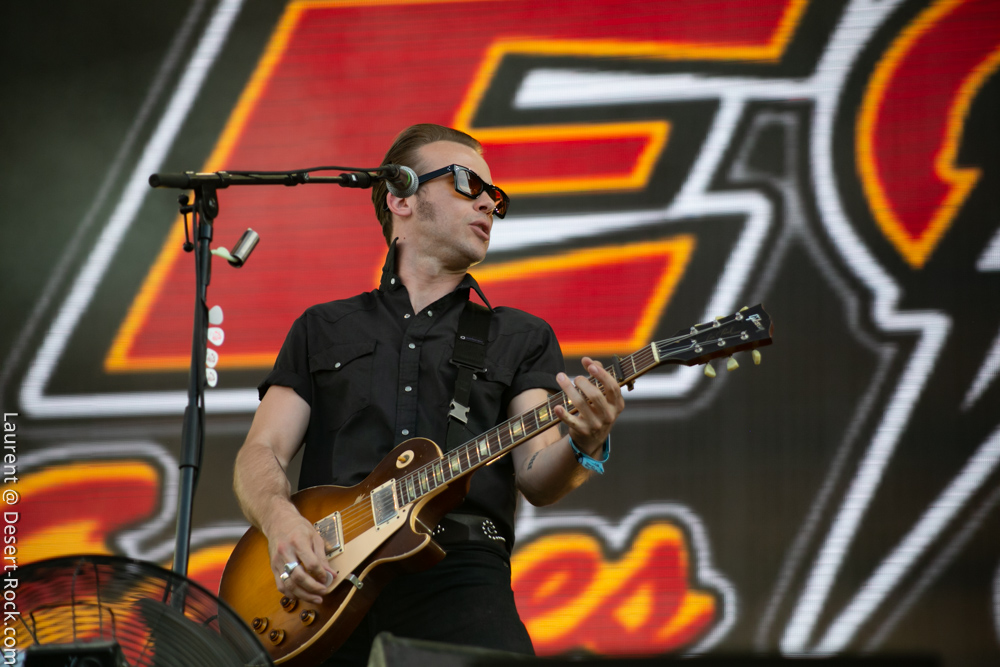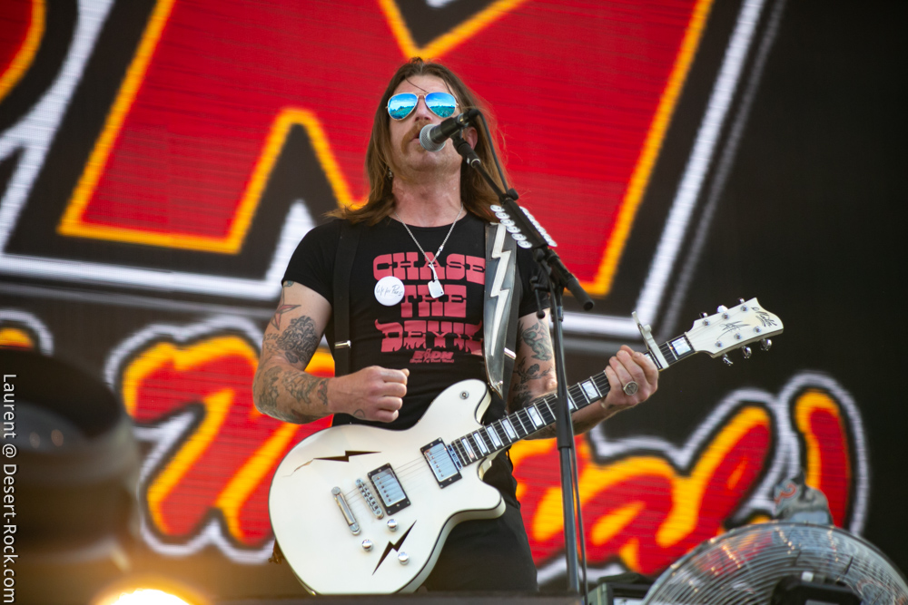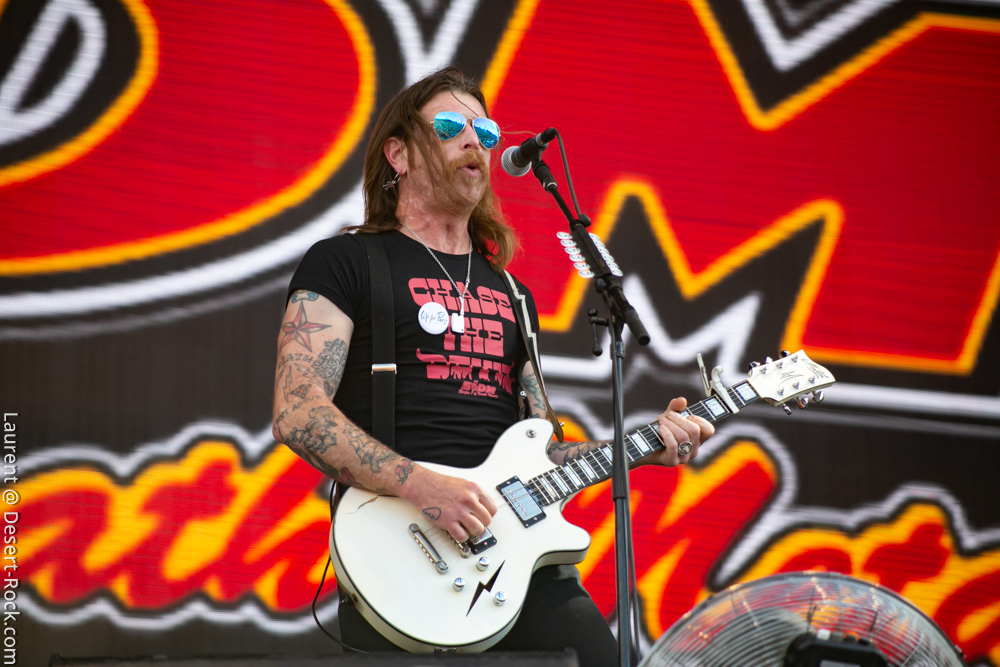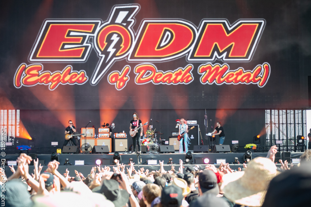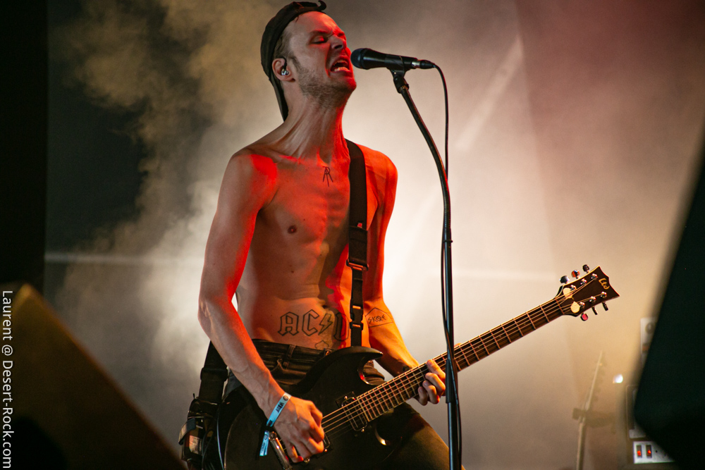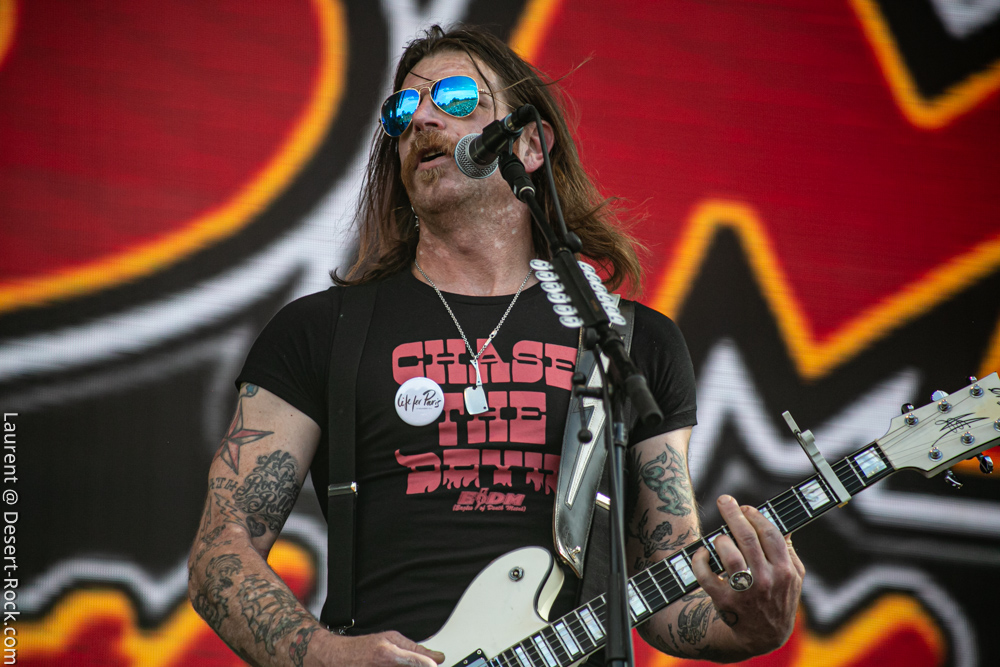 La perspective de rester devant les main stage après ce gênant set de Deadland Ritual, d’affronter encore le soleil (alors que l’accueillante et ombragée Valley nous tend les bras), tout cela pour aller assister au milieu de plusieurs milliers de personnes au concert des Eagles of Death Metal, ne nous paraît plus une aussi bonne idée, tout d’un coup… Pourtant, le groupe est lié à tant de musiciens ou de musiques de la scène desert rock, qu’il était difficile de faire l’impasse (et soyons honnêtes : la disgrâce de son frontman et ses propos lamentables suite au drame du Bataclan l’ont fait tomber très bas dans notre estime). Intègre et dévoué, votre serviteur s’en est donc allé affronter les éléments avec abnégation. Un peu rikiki sous un logo colossal en fond de scène (les main stages proposent des écrans énormes faisant office de backdrop vituels derrière les groupes), nos quatre lascars (Jesse Hughes et qui-que-soient ses trois mercenaires du jour) déroulent avec enthousiasme un set rythmé (évidemment) et sans grosse surprise. Le public de la main stage semble gentiment kiffer cette musique d’apéritif sans prise de tête, d’où émergent évidemment « I Only Want You » en intro, un groovy « Cherry Cola » ou une suave reprise de Bowie (« Moonage Daydream », que le groupe reprend souvent en live, sans grosse valeur ajoutée malheureusement). Hop, sitôt passé, sitôt oublié (si ce n’était ce satané coup de soleil).