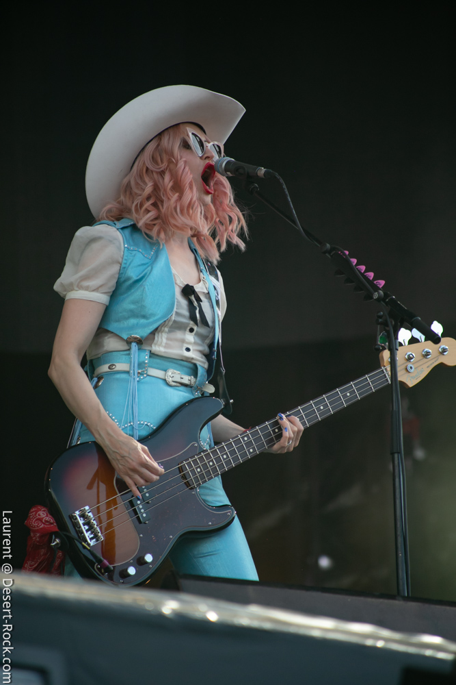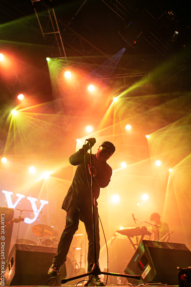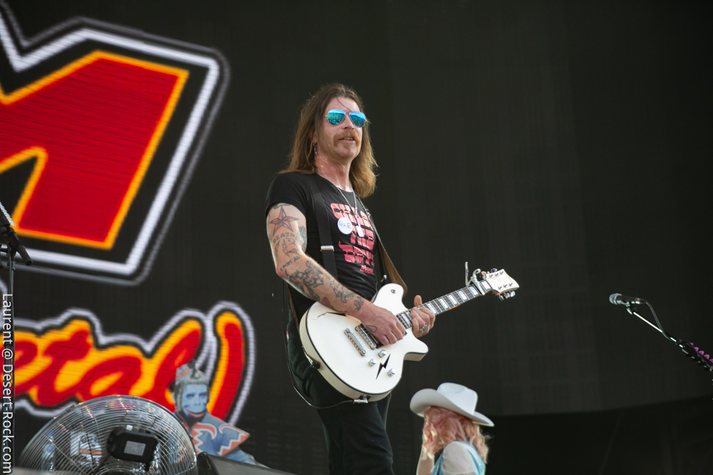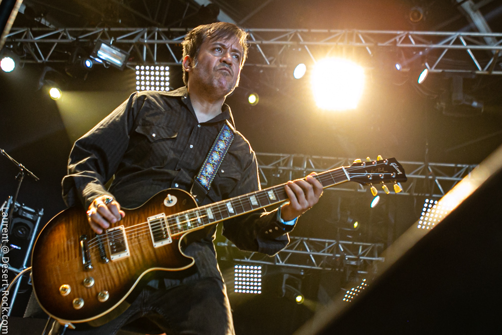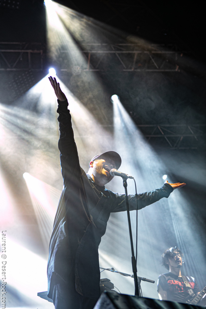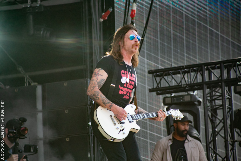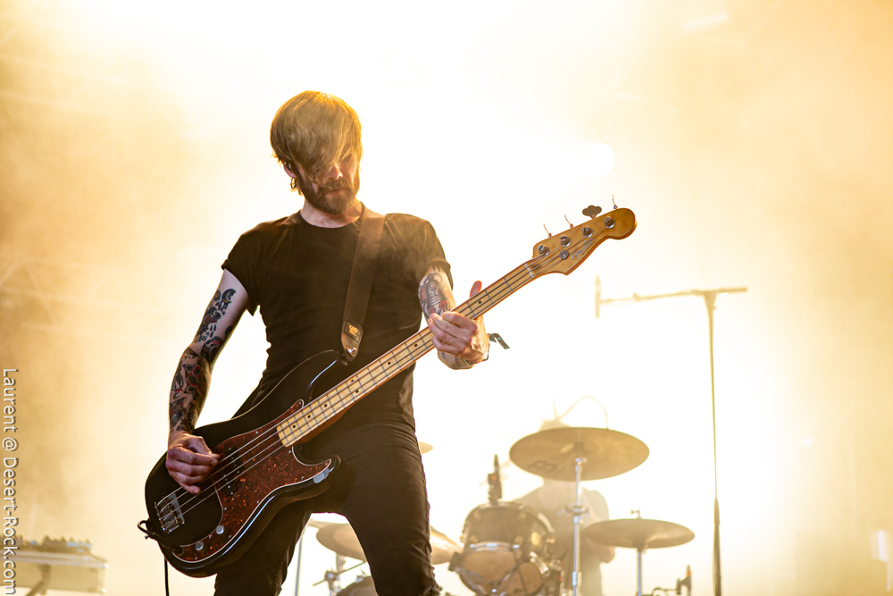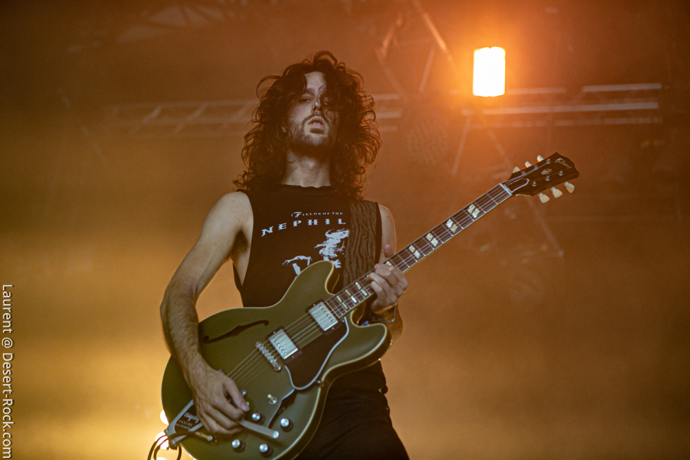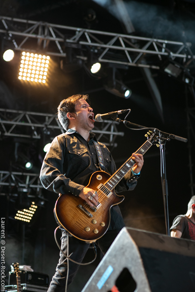 La perspective de rester devant les main stage après ce gênant set de Deadland Ritual, d’affronter encore le soleil (alors que l’accueillante et ombragée Valley nous tend les bras), tout cela pour aller assister au milieu de plusieurs milliers de personnes au concert des Eagles of Death Metal, ne nous paraît plus une aussi bonne idée, tout d’un coup… Pourtant, le groupe est lié à tant de musiciens ou de musiques de la scène desert rock, qu’il était difficile de faire l’impasse (et soyons honnêtes : la disgrâce de son frontman et ses propos lamentables suite au drame du Bataclan l’ont fait tomber très bas dans notre estime). Intègre et dévoué, votre serviteur s’en est donc allé affronter les éléments avec abnégation. Un peu rikiki sous un logo colossal en fond de scène (les main stages proposent des écrans énormes faisant office de backdrop vituels derrière les groupes), nos quatre lascars (Jesse Hughes et qui-que-soient ses trois mercenaires du jour) déroulent avec enthousiasme un set rythmé (évidemment) et sans grosse surprise. Le public de la main stage semble gentiment kiffer cette musique d’apéritif sans prise de tête, d’où émergent évidemment « I Only Want You » en intro, un groovy « Cherry Cola » ou une suave reprise de Bowie (« Moonage Daydream », que le groupe reprend souvent en live, sans grosse valeur ajoutée malheureusement). Hop, sitôt passé, sitôt oublié (si ce n’était ce satané coup de soleil).