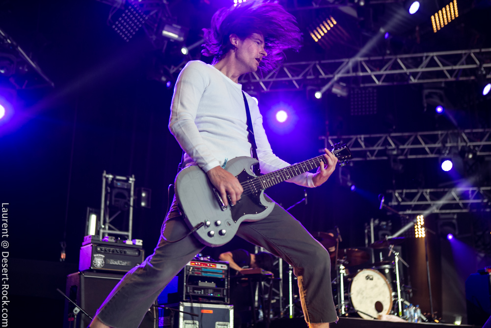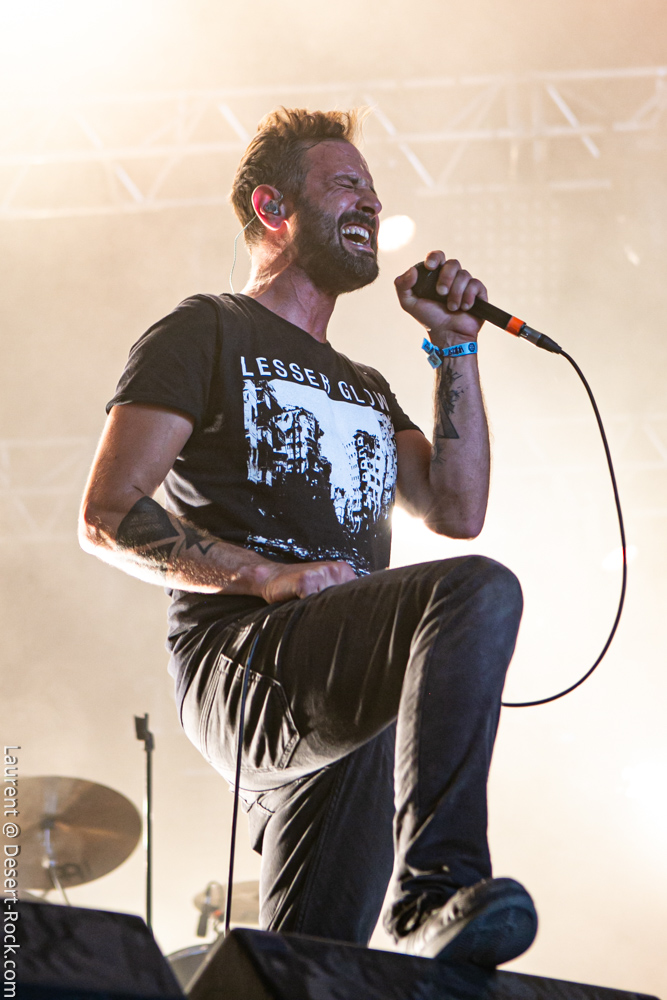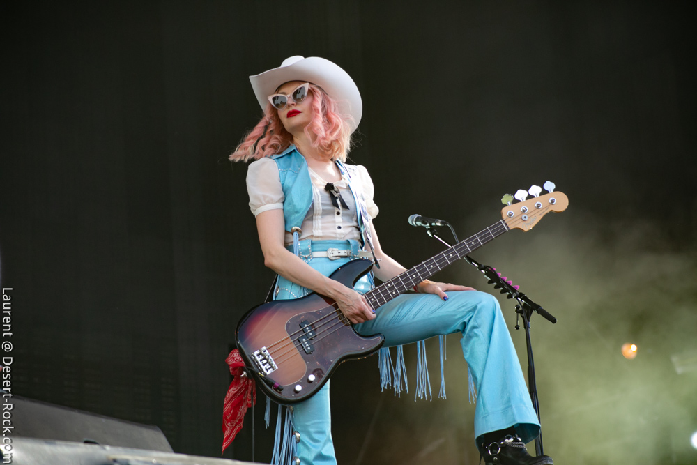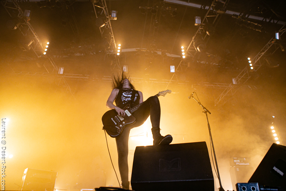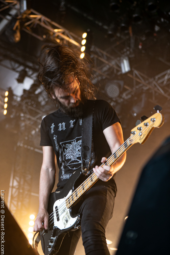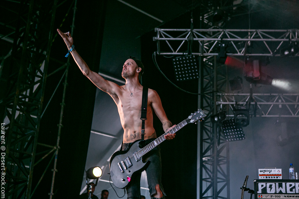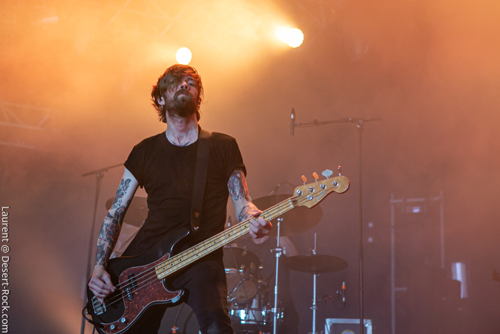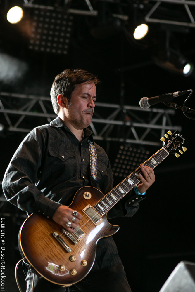 La perspective de rester devant les main stage après ce gênant set de Deadland Ritual, d’affronter encore le soleil (alors que l’accueillante et ombragée Valley nous tend les bras), tout cela pour aller assister au milieu de plusieurs milliers de personnes au concert des Eagles of Death Metal, ne nous paraît plus une aussi bonne idée, tout d’un coup… Pourtant, le groupe est lié à tant de musiciens ou de musiques de la scène desert rock, qu’il était difficile de faire l’impasse (et soyons honnêtes : la disgrâce de son frontman et ses propos lamentables suite au drame du Bataclan l’ont fait tomber très bas dans notre estime). Intègre et dévoué, votre serviteur s’en est donc allé affronter les éléments avec abnégation. Un peu rikiki sous un logo colossal en fond de scène (les main stages proposent des écrans énormes faisant office de backdrop vituels derrière les groupes), nos quatre lascars (Jesse Hughes et qui-que-soient ses trois mercenaires du jour) déroulent avec enthousiasme un set rythmé (évidemment) et sans grosse surprise. Le public de la main stage semble gentiment kiffer cette musique d’apéritif sans prise de tête, d’où émergent évidemment « I Only Want You » en intro, un groovy « Cherry Cola » ou une suave reprise de Bowie (« Moonage Daydream », que le groupe reprend souvent en live, sans grosse valeur ajoutée malheureusement). Hop, sitôt passé, sitôt oublié (si ce n’était ce satané coup de soleil).