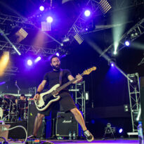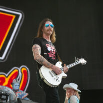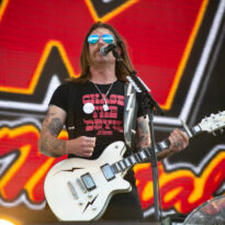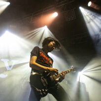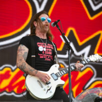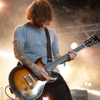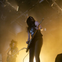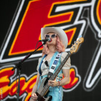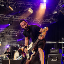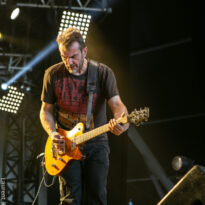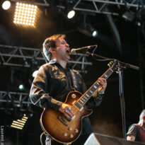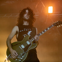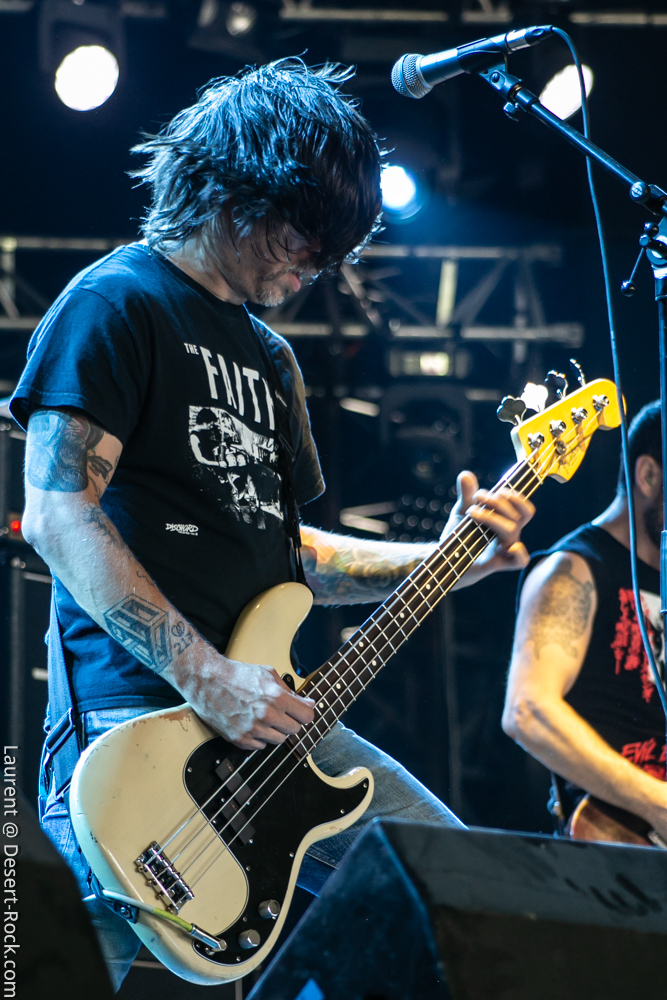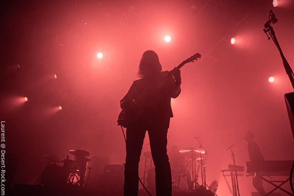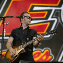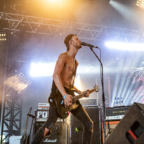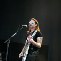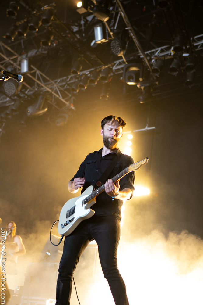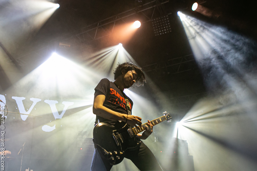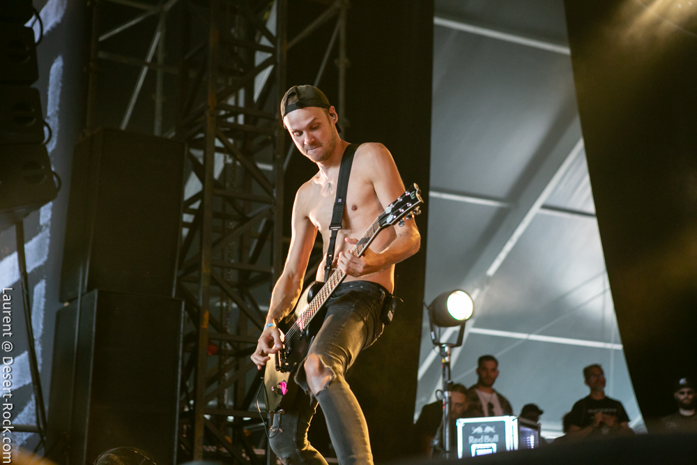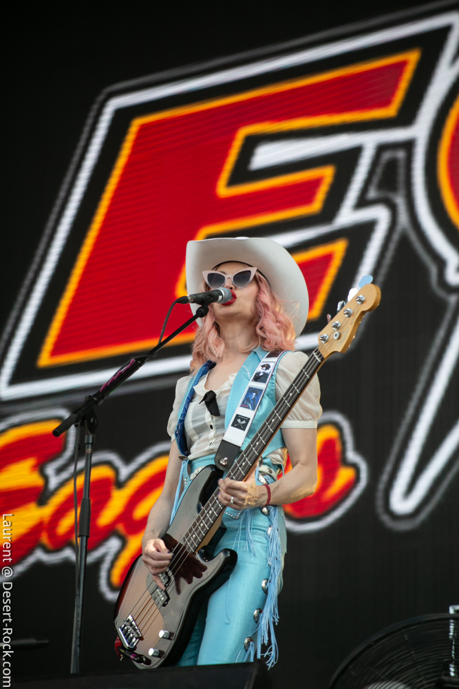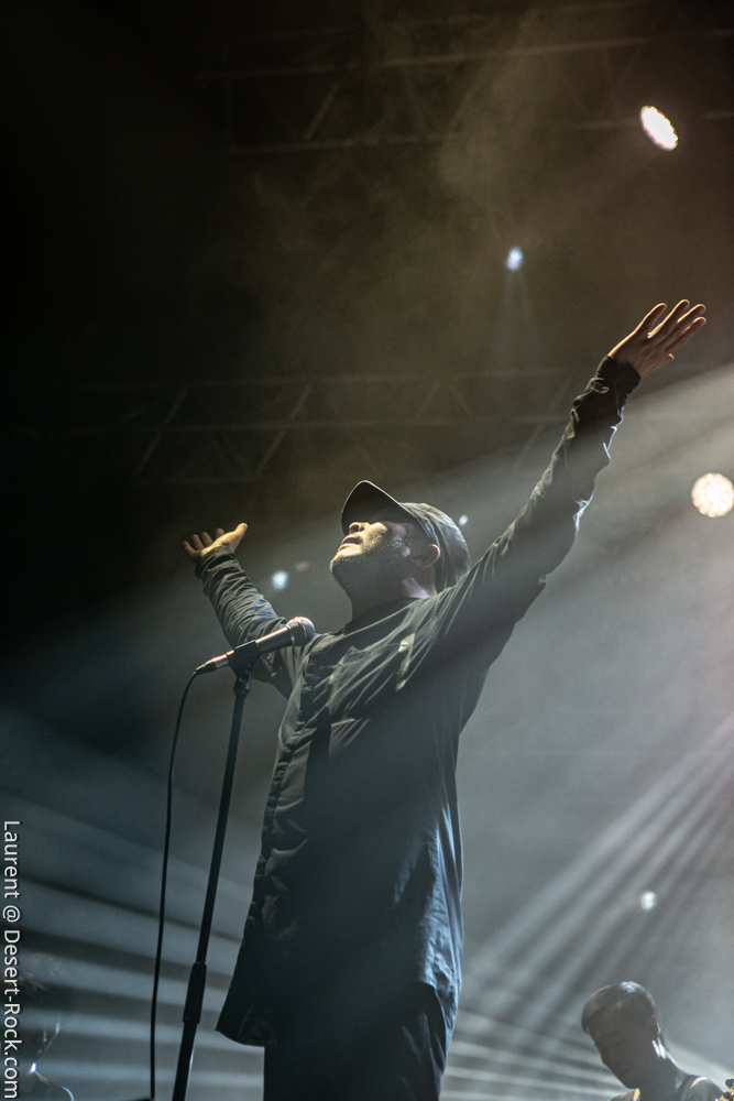 La perspective de rester devant les main stage après ce gênant set de Deadland Ritual, d’affronter encore le soleil (alors que l’accueillante et ombragée Valley nous tend les bras), tout cela pour aller assister au milieu de plusieurs milliers de personnes au concert des Eagles of Death Metal, ne nous paraît plus une aussi bonne idée, tout d’un coup… Pourtant, le groupe est lié à tant de musiciens ou de musiques de la scène desert rock, qu’il était difficile de faire l’impasse (et soyons honnêtes : la disgrâce de son frontman et ses propos lamentables suite au drame du Bataclan l’ont fait tomber très bas dans notre estime). Intègre et dévoué, votre serviteur s’en est donc allé affronter les éléments avec abnégation. Un peu rikiki sous un logo colossal en fond de scène (les main stages proposent des écrans énormes faisant office de backdrop vituels derrière les groupes), nos quatre lascars (Jesse Hughes et qui-que-soient ses trois mercenaires du jour) déroulent avec enthousiasme un set rythmé (évidemment) et sans grosse surprise. Le public de la main stage semble gentiment kiffer cette musique d’apéritif sans prise de tête, d’où émergent évidemment « I Only Want You » en intro, un groovy « Cherry Cola » ou une suave reprise de Bowie (« Moonage Daydream », que le groupe reprend souvent en live, sans grosse valeur ajoutée malheureusement). Hop, sitôt passé, sitôt oublié (si ce n’était ce satané coup de soleil).