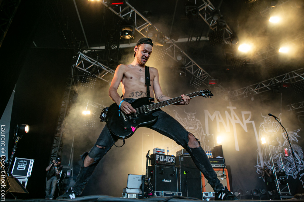 Les amateurs de Hambourgeois cuits saignants sont nombreux à être venus le pantalon baissé pour venir se faire fesser par Mantar. Il suffit de regarder le Pit pour s’en convaincre alors que débute le carnage sur “The Age of Absurd” puis “Taurus”. Ceci n’est qu’une mise en bouche, les flammes de l’enfer chauffent les culs, et plus d’un va se mettre à tourner dans le Pit sous le commandement de Hanno. L’attitude change et le jeu de scène du groupe qui occupait cette place il y a quelques trois ans a bien évolué. Le chanteur hurleur accroché à son micro prend désormais la pose de face et s’adresse au public, il clame “We are Manowar and we are late” tournant en dérision les headliners qui ont décommandé leur concert. Les mimiques gagnent en agressivité, “Spit”, “Into the Golden Abyss’, “Cross the cross” s’enchaînent. Tout le monde prend sa Mantarte dans la gueule. Ceux qui ont regretté une accalmie sur leur dernier album auront été rassurés dès les premières notes de “Seek + Forget” qui met tout le monde d’accord dans une bagarre générale. Pogo, Circle Pit, le public s’est totalement abandonné et se laisse dominer par le duo alors que s’ensuit “Teeth of the Sea”. En sueur, nos deux allemands maîtres es-Sludge concluent la séance sur l’essentiel “Era Borealis” qui clôture le set de façon très logique. C’est une belle leçon de domination que Mantar nous a offert là et nous ne serions pas loin de dire qu’il s’agit du concert de la journée si ce n’est celui du weekend.