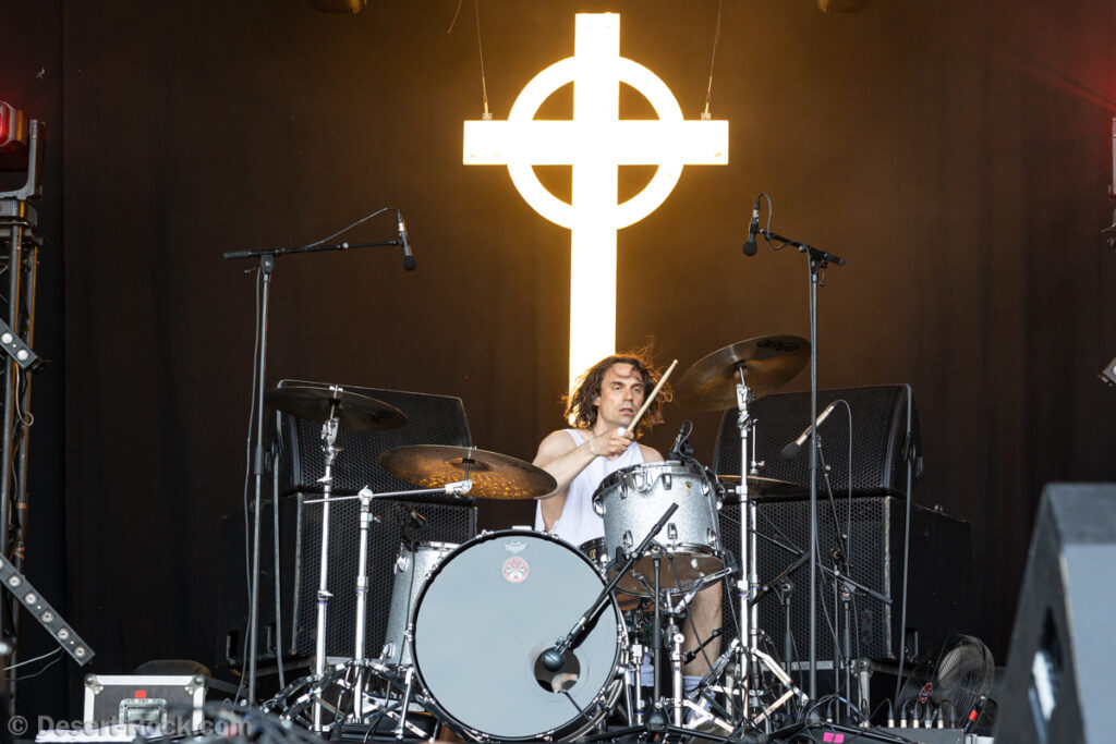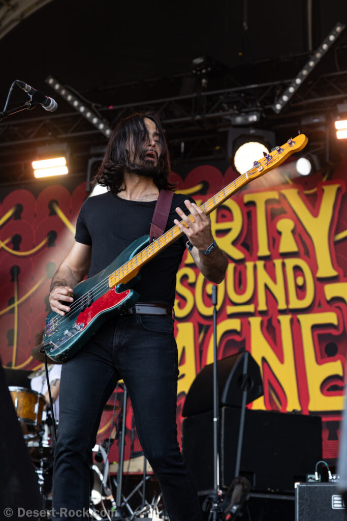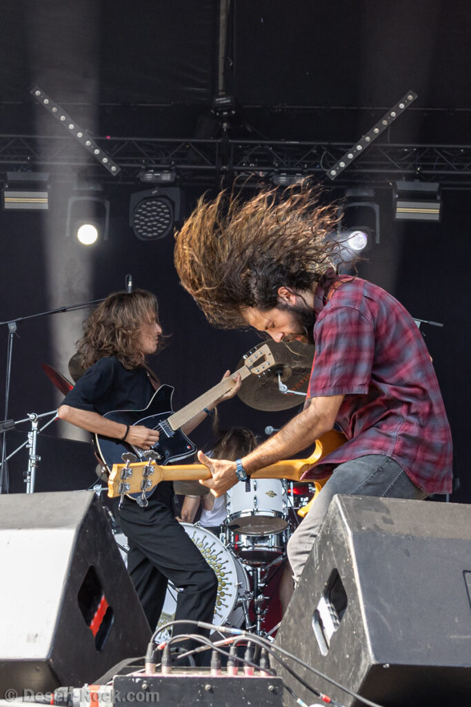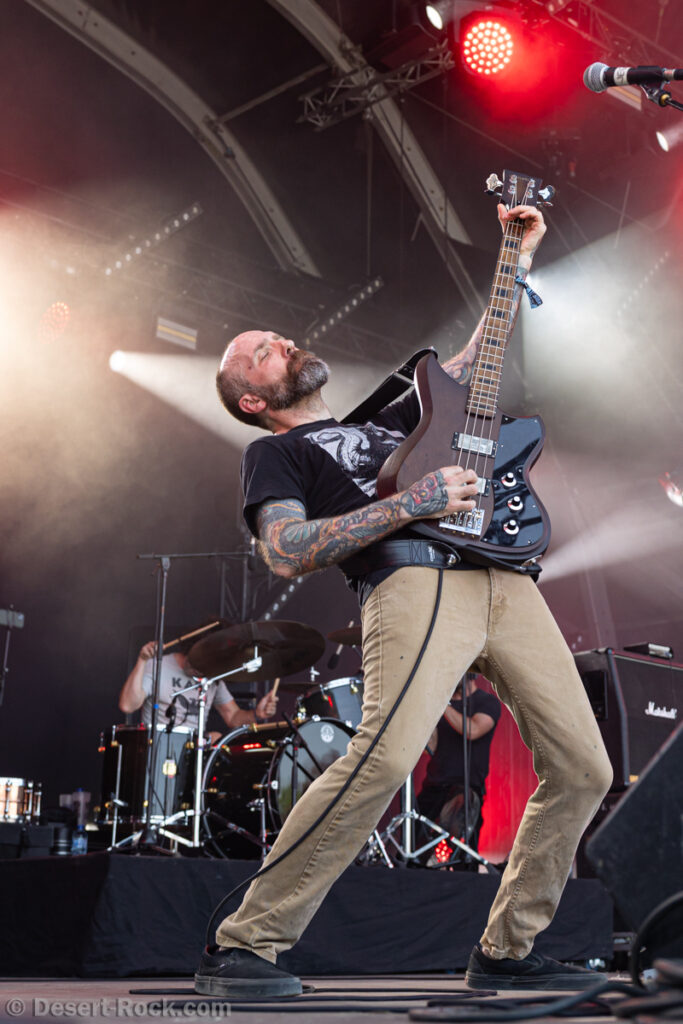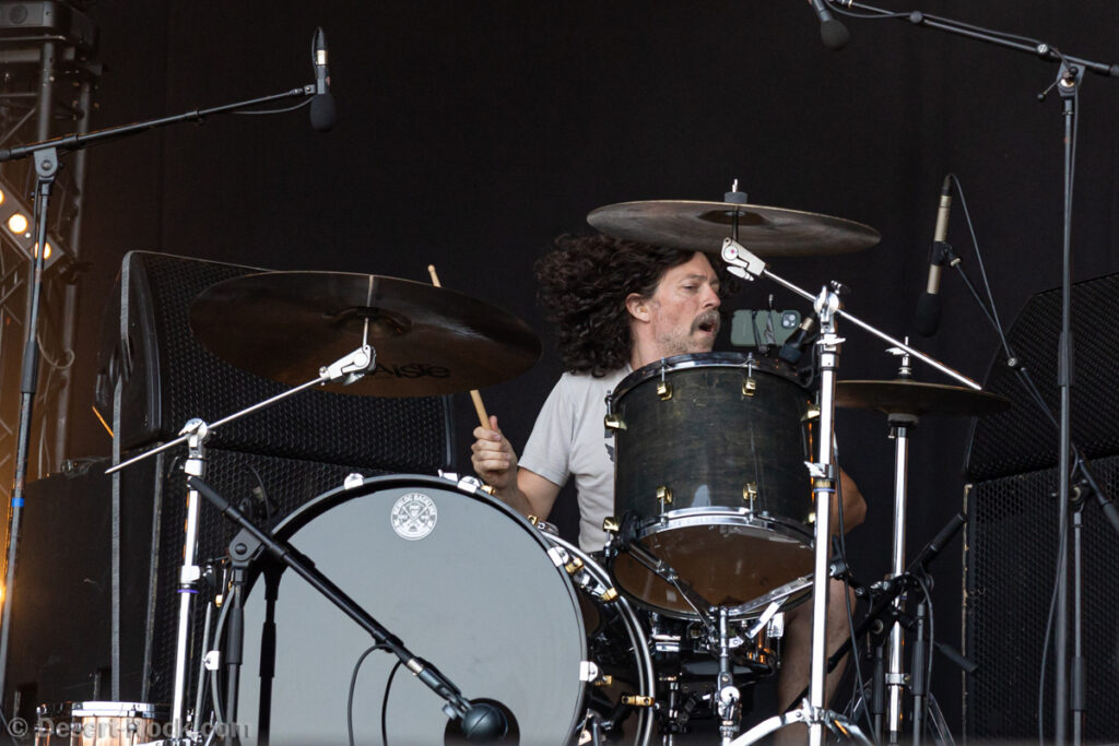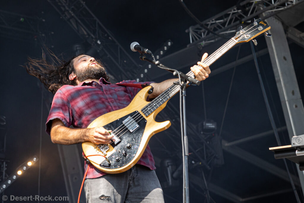 Premier constat : cette chaleur rend toute chose difficile, en particulier le fait de se tenir face à la Valley avec le soleil qui cogne sans zone d’ombre nulle part. Bravo au groupe dans ce contexte, en milieu de journée, au pic du soleil, d’avoir déplacé un public loin d’être ridicule… Il faut dire que leur style musical et leur enthousiasme sont probablement la recette parfaite à cette heure de la journée. Le trio helvète a établi une set list intelligente, piochant du côté le plus énergique de sa discographie, pour proposer une collection de petites pépites stoner psych au groove décadent. Tandis que la paire rythmique de la formation Marco Mottolini /Maxime Cosandey tisse une trame rythmico-mélodique irrésistible, le fantasque guitariste/chanteur Stavros, outillé d’un énorme pedal board, empile les soli et leads flamboyants pour élever un peu plus chaque titre. Il serait plus que temps de voir ce groupe atteindre le niveau de notoriété qu’il mérite.