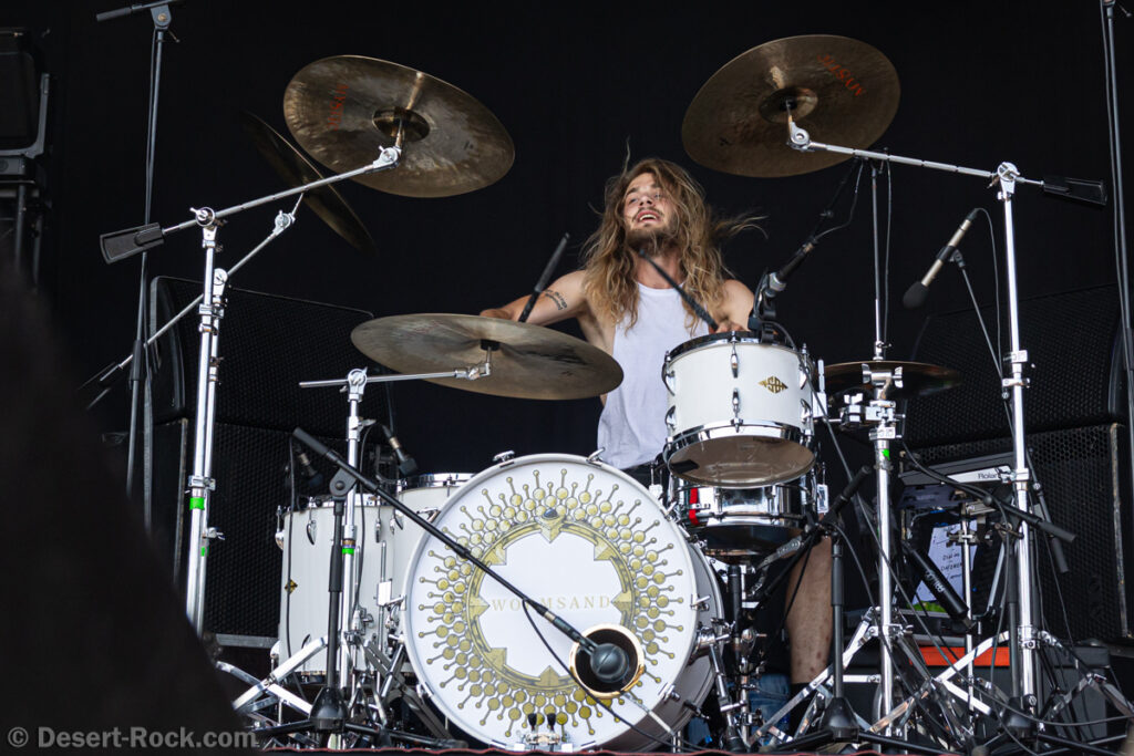 On a beaucoup vu Wormsand sur les planches ces derniers mois, soutenir son formidable dernier album, You, The King, avec toujours la même impression d’une énergie jamais prise en défaut, et d’une maîtrise scénique toujours impeccable, permettant de transcender ses compos. L’enjeu d’aujourd’hui sera de valider l’homothétique transition de ce jeune trio, de scènes plus modestes vers la gigantesque Valley. Comme à leur habitude, la formation sudiste attaque bille en tête, et choisit le heavy et complexe « Digging Deep » pour capter l’attention de l’auditoire du jour. La bonne réputation scénique du groupe s’est bien répandue apparemment, si l’on en juge par la taille très respectable du public devant la scène – à cette heure et par cette chaleur c’est une belle performance. Le concert se déroule sans jamais que les musiciens ne s’apaisent, virevoltant, chantant ou criant, sautant, transpirant, frappant sur les futs comme une mule… Le set évolue avec des compos progressivement plus lourdes et moins « nerveuses » (« Drown », « To Die Alone »), ce qui est plutôt malin, une fois le public « ferré ». Les puristes regretteront l’absence de titres plus anciens, mais c’est un peu vite oublier la qualité de cet enchaînement, qui tire bien profit de ce court créneau horaire, parfaitement géré.