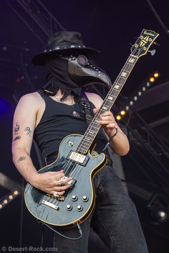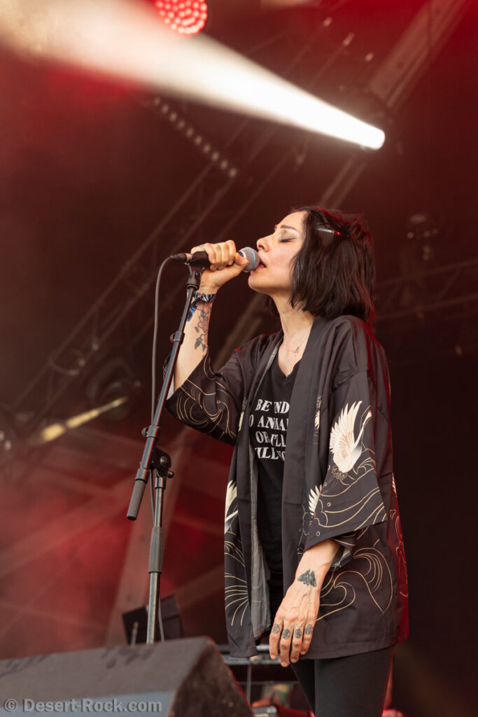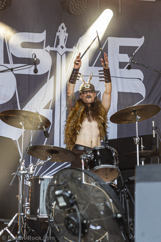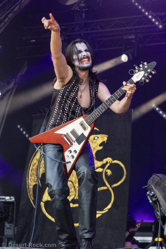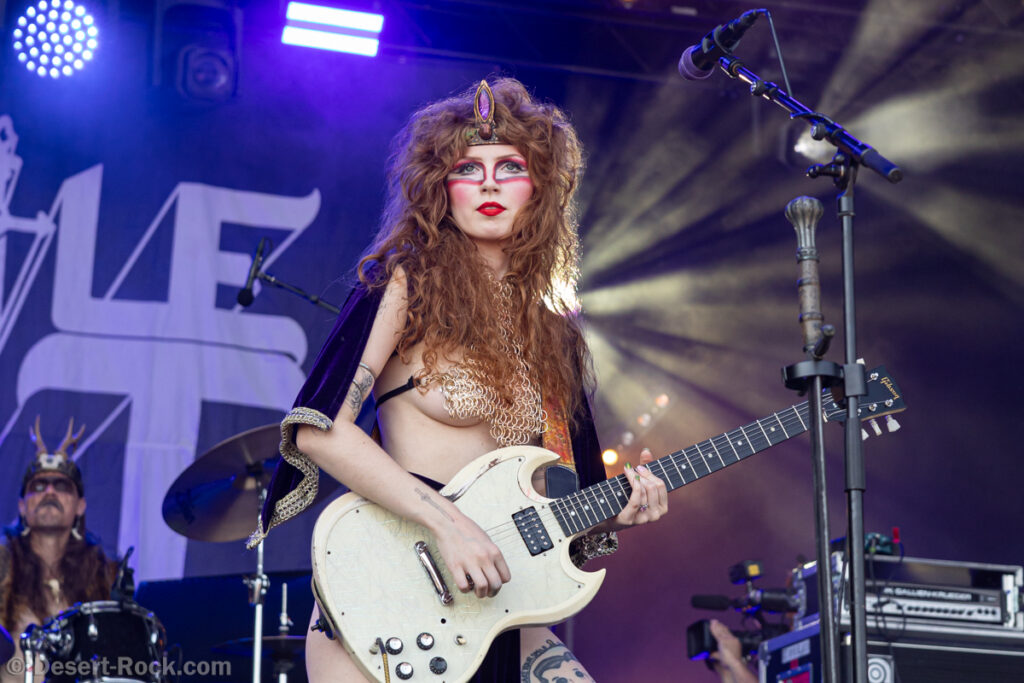 Bientôt midi, le soleil tape fort sur la tête, et même si la Valley ne fait pas salle comble, le public s’est déplacé en nombre très raisonnable pour assister au set de la nouvelle petite sensation doom rock américaine. On comprend assez vite que le groupe n’est pas venu pour enfiler des perles, résolu à mettre les petits plats dans les grands. Musicalement, la set list se concentre sur ses morceaux les plus efficaces, essentiellement issus de sa récente production Into the Realm. C’est maîtrisé, varié, et on n’a pas le temps de s’ennuyer. Côté decorum, les musiciens sont tous déguisés et maquillés (mention spéciale au guitariste vampire et au bassiste qui a joué avec un masque intégral sous un soleil à 35° pendant 45 minutes), sans parler évidemment de Riley Pinkerton. La frontwoman, énergique et charismatique, légèrement vêtue de son haut en côtés de maille, anime avec fougue et conviction le spectacle épico-comico-fantasy, avec juste la bonne dose de cheesy pour ne jamais s’éloigner de l’aspect fun. Au final, un très bon set, qui n’a jamais basculé dans le ridicule et aura largement contenté les amateurs de musique heavy doom old school… et de spectacle !