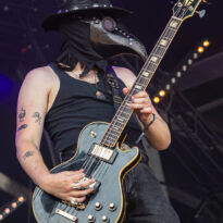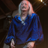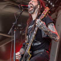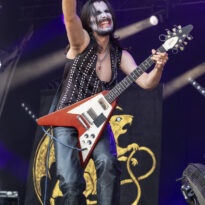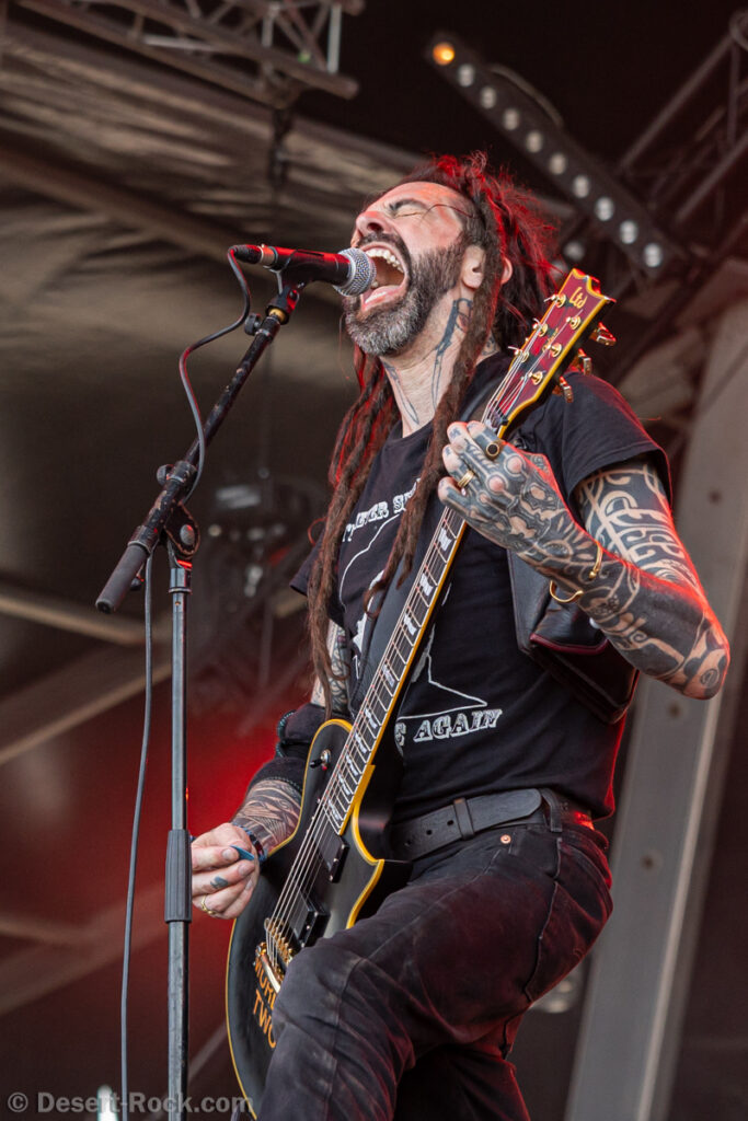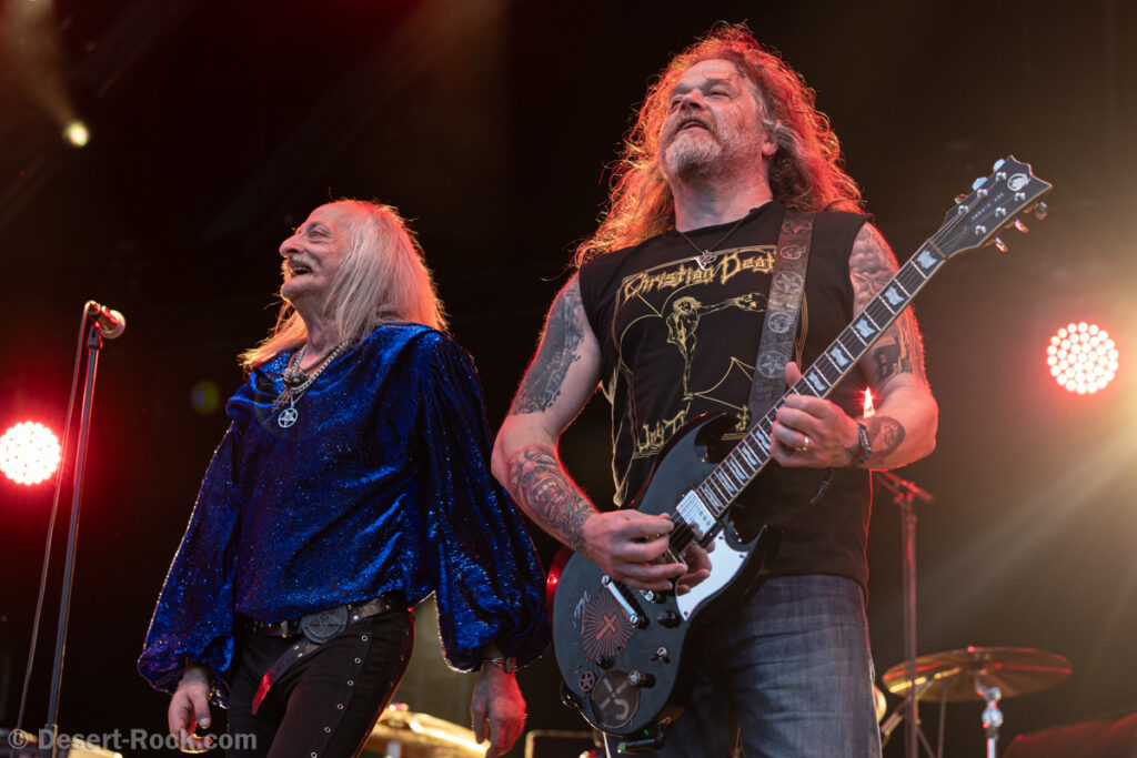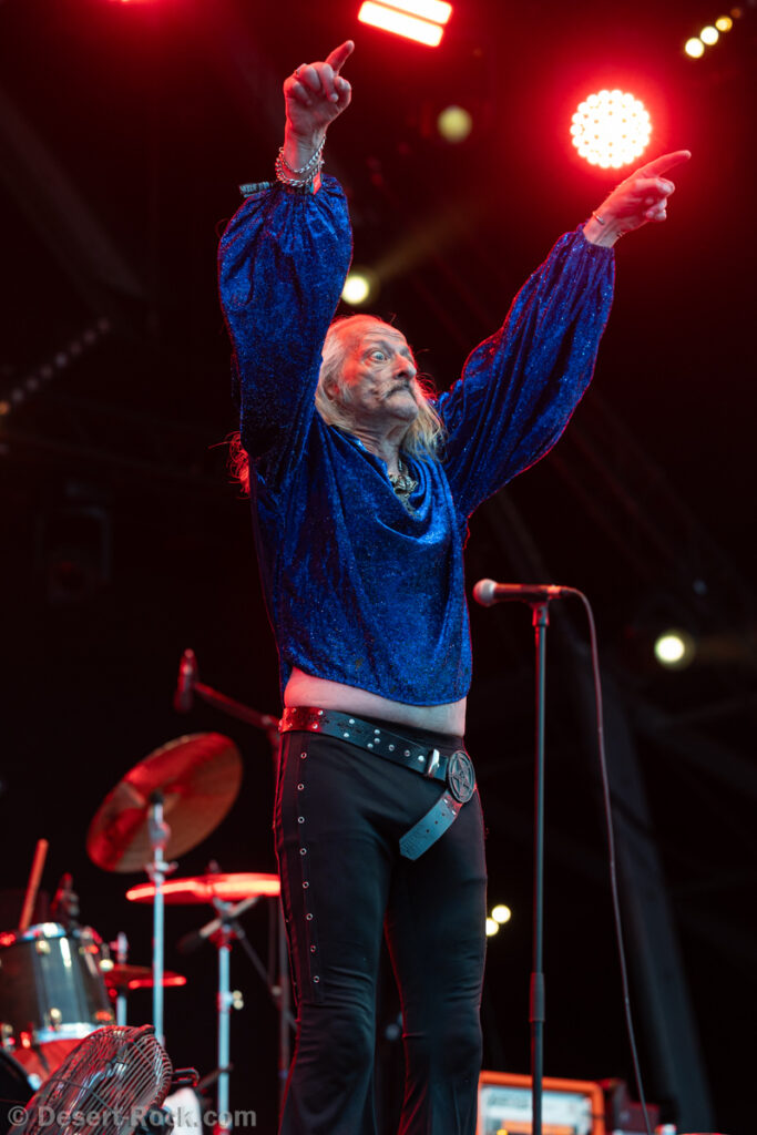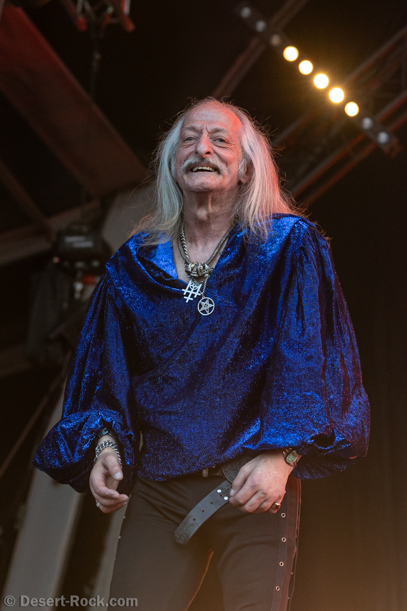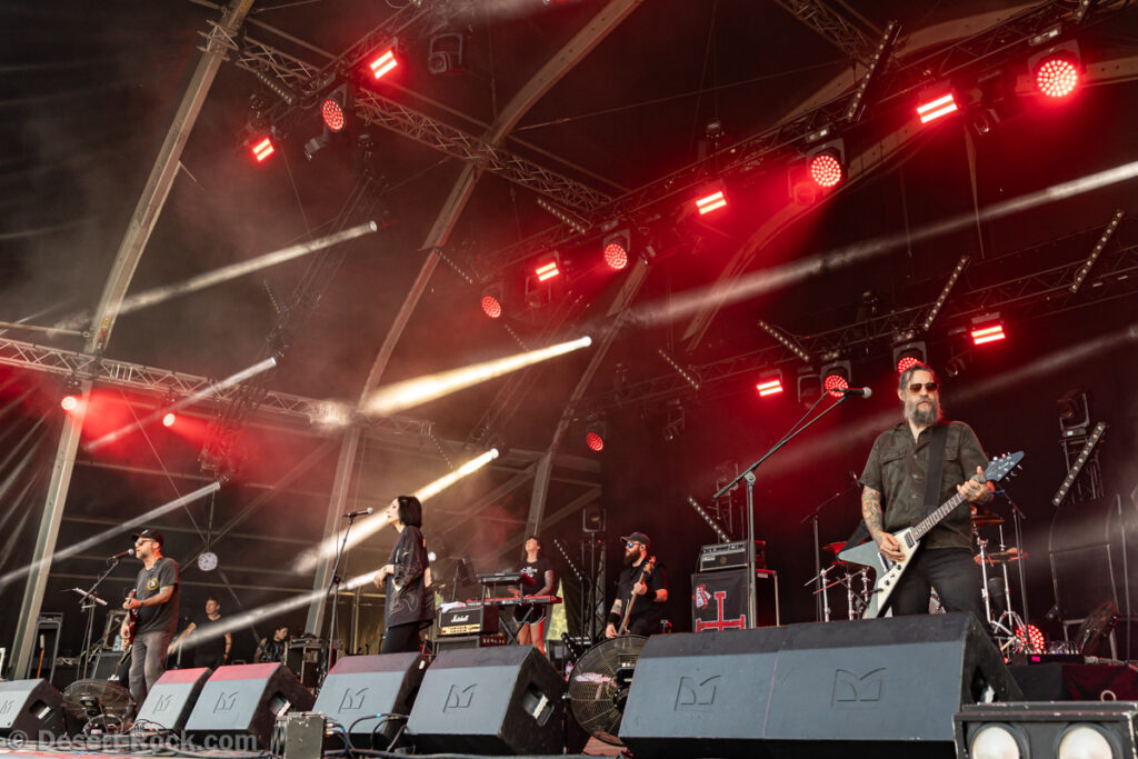 Bientôt midi, le soleil tape fort sur la tête, et même si la Valley ne fait pas salle comble, le public s’est déplacé en nombre très raisonnable pour assister au set de la nouvelle petite sensation doom rock américaine. On comprend assez vite que le groupe n’est pas venu pour enfiler des perles, résolu à mettre les petits plats dans les grands. Musicalement, la set list se concentre sur ses morceaux les plus efficaces, essentiellement issus de sa récente production Into the Realm. C’est maîtrisé, varié, et on n’a pas le temps de s’ennuyer. Côté decorum, les musiciens sont tous déguisés et maquillés (mention spéciale au guitariste vampire et au bassiste qui a joué avec un masque intégral sous un soleil à 35° pendant 45 minutes), sans parler évidemment de Riley Pinkerton. La frontwoman, énergique et charismatique, légèrement vêtue de son haut en côtés de maille, anime avec fougue et conviction le spectacle épico-comico-fantasy, avec juste la bonne dose de cheesy pour ne jamais s’éloigner de l’aspect fun. Au final, un très bon set, qui n’a jamais basculé dans le ridicule et aura largement contenté les amateurs de musique heavy doom old school… et de spectacle !
