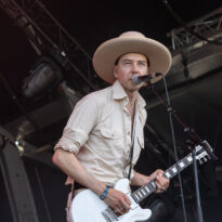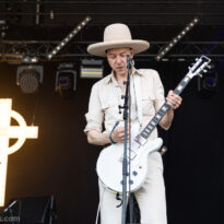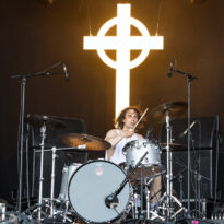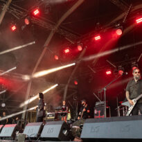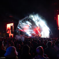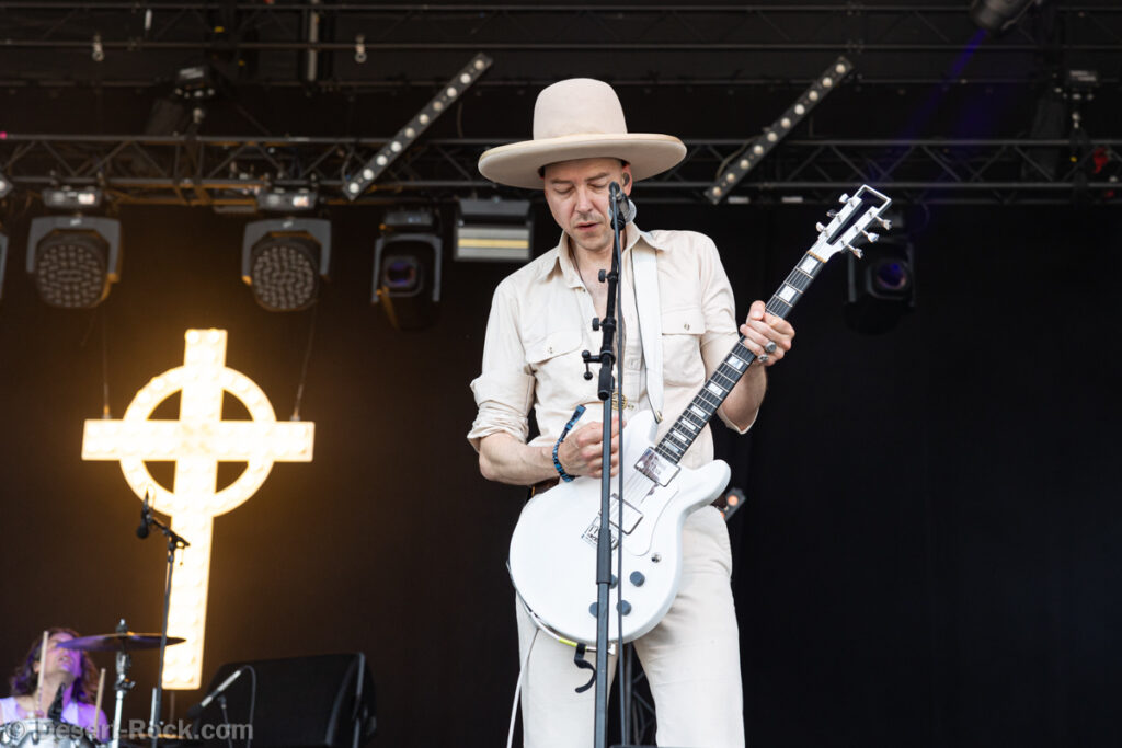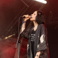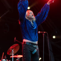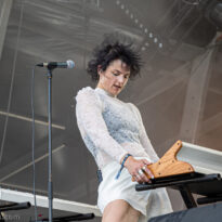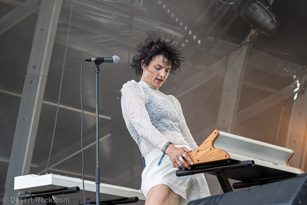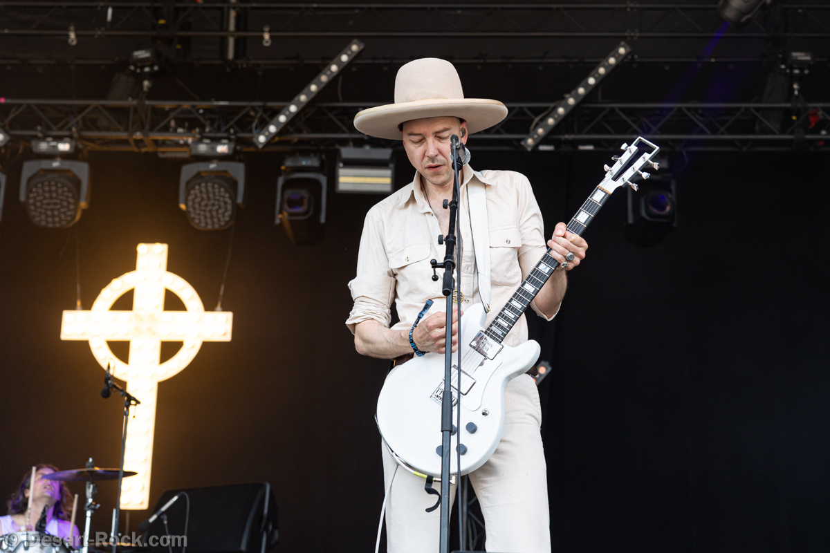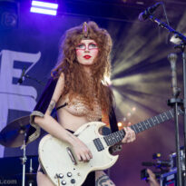 L’assistance s’est encore un peu amoindrie en face de la vaste scène. Il faut dire que l’on est probablement en ce cœur de l’après-midi au pire de la vague caniculaire : le public présent n’est pas simplement curieux ou amateur du groupe, il est avant tout courageux, tout simplement. Ce set de la formation norvégienne s’annonçait pour le moins excitant, proposant d’interpréter son nouvel album Rite of Dionysus… qui ne sortira que dans quelques mois ! On aborde donc le concert les oreilles grandes ouvertes, curieux et disponible à toute surprise… de la part d’un groupe qui n’en a jamais manqué dans sa carrière. On ne pourra donc pas citer les chansons jouées, mais on peut assurément dire que le groupe revient avec un ensemble de compos costaudes et mélodiques – en tout cas dans leur forme live. Le set s’avère assez enthousiasmant à suivre, emmené par le désormais assumé duo composé du fondateur Kjetil à la guitare et au chant, et de madame à la ville, Karin Park, uniquement accompagnés d’un batteur. La densité musicale est pourtant bien au rendez-vous, renflouée au besoin par les diverses nappes et plans de synthé amenés par Park (il faut la voir, se tenant droite et défiant le public, une main sur chaque clavier à sa gauche et à sa droite !). Les deux se partagent l’animation scénique, avec une certaine austérité pour monsieur, et une réelle fougue pour madame. Si jamais l’on s’ennuyait, le groupe a mandaté une trouve de danseuses de blanc vêtues pour animer plusieurs titres, et elles reviendront à la fin pour le (prévisible, au vu du titre du disque) banquet final, avec une tablée rapidement mise en place, décorée de quelques victuailles ! Un vrai bon set, mélant humblement spectacle et musique, de la part d’un groupe dont on s’était progressivement un peu détaché, probablement à tort.