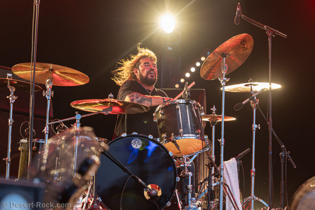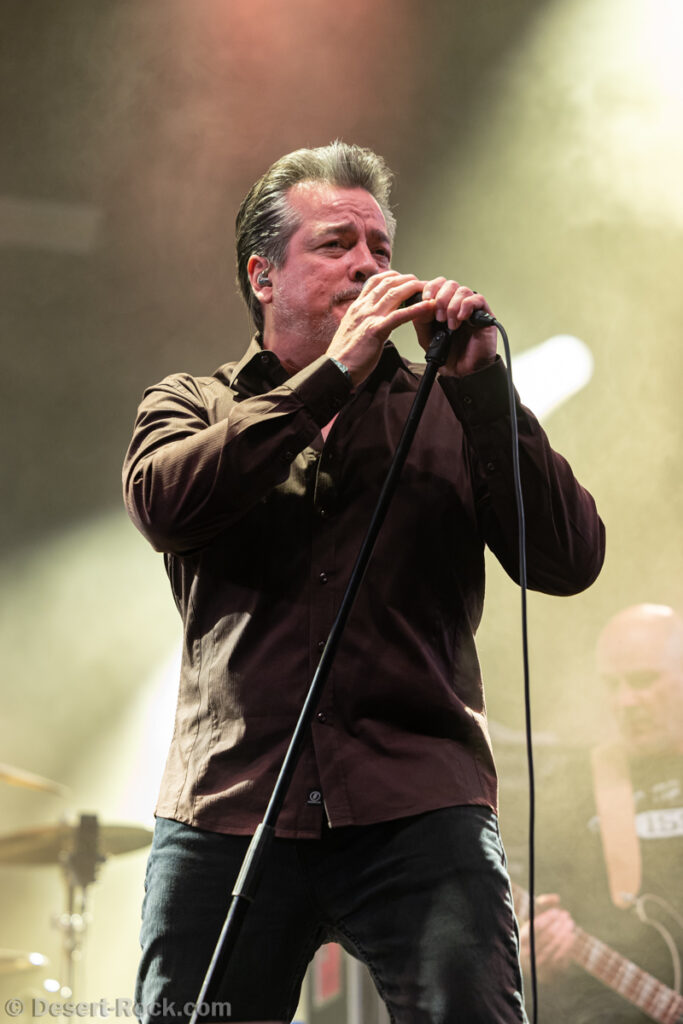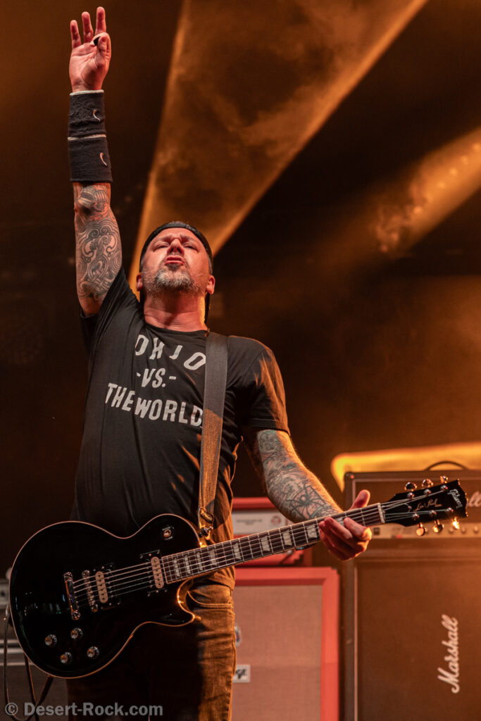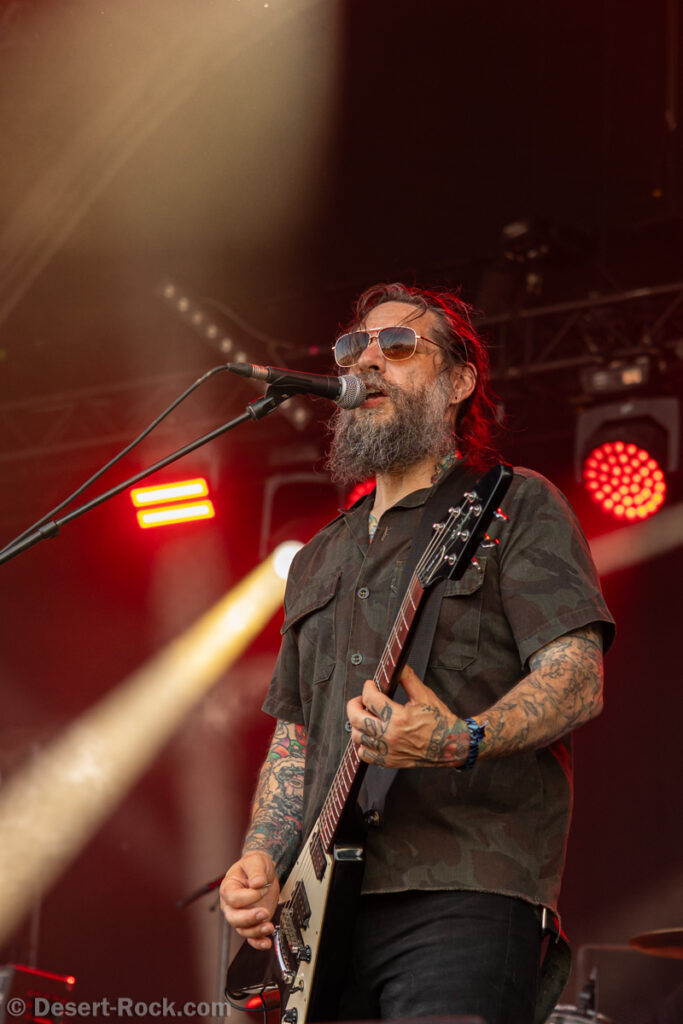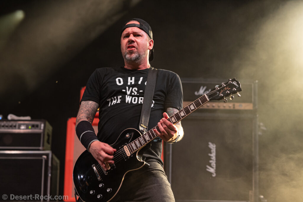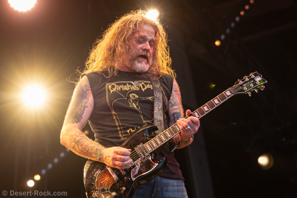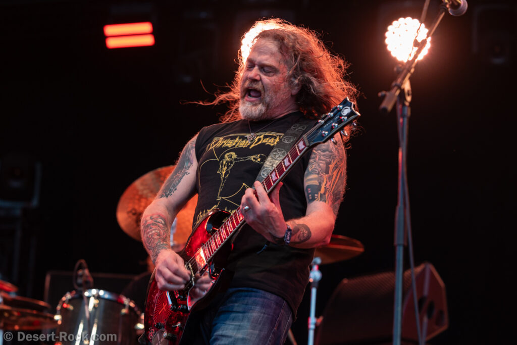 Même si tous les yeux sont (anormalement) rivés sur Garcia, tous les musiciens de la formation apportent une contribution dantesque à l’exercice, à commencer par cette section rythmique redoutable, avec un Chris Leathers sans faille derrière les futs, segondé par Dandy Brown, discret leader du groupe, distillant des trames mélodiques au groove implacable à la basse. Par-dessus, Mike Callahan débite des riffs énormes, associé à Dave Angstrom et ses leads impeccables, atypiques, imprévisibles parfois, en prolongation directe de sa personnalité. L’alchimie naît là, à travers ces quatre musiciens avec lesquels John Garcia délivre ce soir une prestation plus que solide (soyons honnête, on l’a déjà vu moins impliqué et/ou moins efficace dans d’autres contextes parfois). La set list n’apporte pas grande surprise, reposant sur les principaux hits du quintette, agrémentés de « Love » (déjà jouée en 2016, inédite à l’époque) et « Breathe » (proposée dans le mini album « fourre-tout » sorti par le groupe il y a quelques mois). Les mid tempo charpentés sont alternés avec les titres plus nerveux (les premiers pogos dans le pit interviennent au milieu du set sur le rageur « Angry American »), pour le plus grand ravissement d’un public qui n’en perd pas une miette, ondulant et headbanguant à l’unisson, en symbiose avec le groupe. L’attente fut tellement longue que l’on râle un peu de voir le groupe ne pas tirer profit de la moindre seconde du créneau qui lui est alloué (ils finissent 5 minutes plus tôt, ce qui aurait permis d’interpréter un titre supplémentaire). Mais ce constat se volatilise bien vite en regard de l’expérience globale, de ce moment quasi-magique qui vient de se dérouler sous nos yeux.