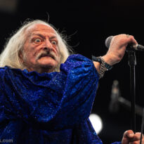 Le Pentagram nouvelle version a désormais quasiment un an d’existence, avec plusieurs dates live dans les pattes désormais, et un nouvel album studio (Lightning in a Bottle, certes moyen) révélé au public il y a quelques mois. La dernière fois que nous les avions vu, le backing band choisi par Liebling était efficace (on parle de 2/3 de Mos Generator, un groupe pour le moins compétent) mais peu rodé dans l’exercice Pentagram. Très vite ce soir l’on s’aperçoit que la situation est toute autre : l’aisance scénique de la troupe est décuplée, à l’image de Scooter à la basse qui… bouge et regarde ailleurs que ses pieds ! Concernant Bobby, il est toujours le même boute-en-train (ce qui est quand même un constat auquel on ne devrait pas s’habituer, le poids des ans tarde à se faire sentir…), avec ses blagues douteuses (parfois sous la ceinture) et ses mimiques et regards torves… Ces derniers nous font nous interroger : quelle est la part du public (qui remplit fort bien la fosse) qui vient par admiration ou respect pour ce groupe culte, et quelle part vient pour voir le « phénomène » chanteur aux yeux globuleux qui a fait le bonheur des réseaux sociaux il y a quelques semaines, via de nombreux memes autour d’un trend incongru ? Ne boudons pas notre plaisir, la prestation de ce soir est de haut vol, Bobby est en voix, et les musiciens sont rodés et à l’aise. En outre, les quelques mois en commun ont suffi à une complète appropriation des titres, aboutissant pour certains à des arrangements particuliers, et surtout des réaménagements pour introduire ou développer tel ou tel solo de Tony Reed souvent (sur les nouveaux titres en particulier, étant plus facile de remodeler ses propres compos, les plus anciennes étant quelque peu sacralisées – voir en particulier sur « Dull Pain », « Walk the Sociopath »…). Une prise de liberté la plupart du temps réussie, participant là aussi à montrer la bonne incorporation et appropriation de ce nouveau line up sur « l’entité Pentagram », qui de fait se façonne peu à peu en fonction de leur identité. Si quasiment la moitié du set repose sur ces compos récentes, la plupart des classiques sont quand même présents (et « 20 Buck Spin » joué en entier). Point de surprise majeure, ni de facteur exceptionnel, mais une prestation plus qu’honnête, qui fait honneur au groupe.