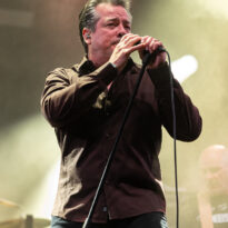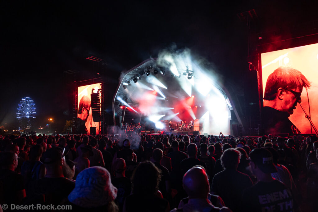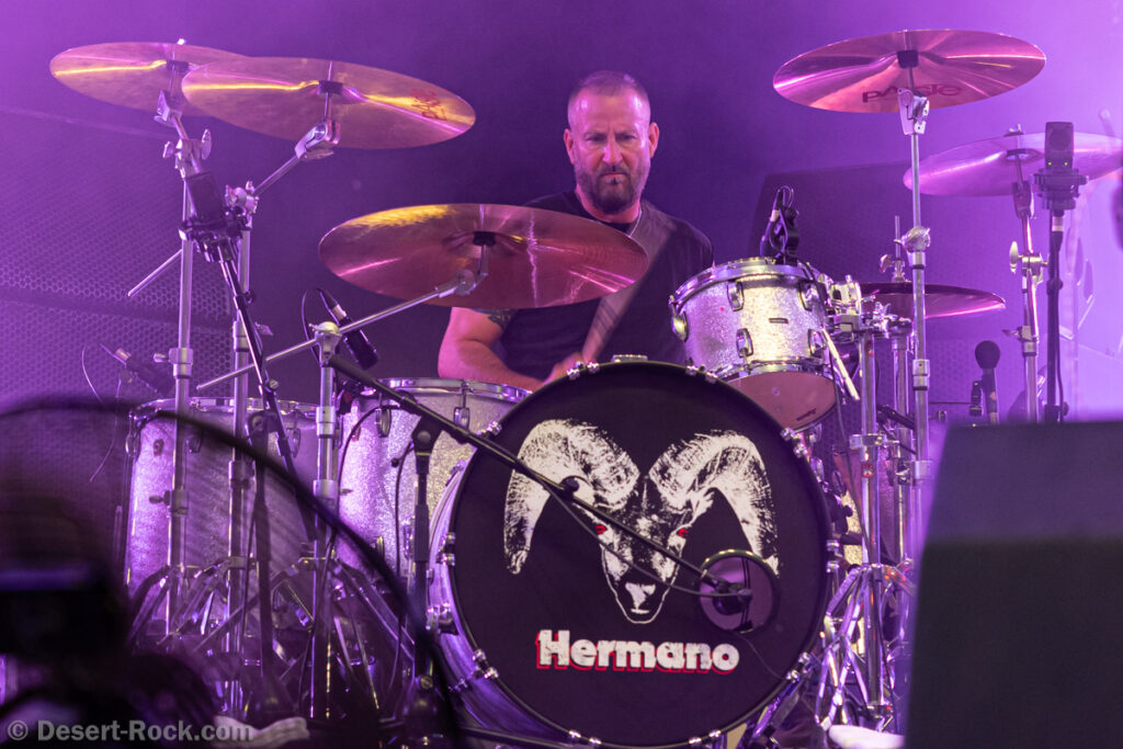 La nuit est bien installée, et la chaleur bel et bien disparue quand vient l’heure de début du set du groupe culte américain. Est-ce la raison qui explique l’affluence inédite du public qui se masse devant la scène ? Ou bien est-ce cette sorte de tension que l’on sent grésiller dans l’atmosphère avant la montée sur les planches du sieur Garcia ? Quelques éléments de contexte pour mettre en perspective ce concert de Hermano : tous ses musiciens vivent désormais à plusieurs centaines voire milliers de kilomètres les uns des autres, l’entité n’a pas enregistré de véritable album depuis 18 ans, et n’a joué qu’un seul concert en 17 ans… au Hellfest, en 2016 ! Vous le sentez monter, le facteur événementiel ? S’il y a un concert à ne pas rater sur ces quatre jours, c’est celui-ci. Même si chaque musicien reste (plus ou moins) actif au sein d‘autres formations, le groupe a mis à profit les quelques jours précédents pour une sorte de résidence (dans les locaux de la prod du Hellfest), afin de finir de mettre en place ce set, et retrouver les bonnes interactions entre copains/musiciens. Le résultat ne tarde pas à se faire sentir : dès le nerveux « Cowboys Suck » délivré en intro, le groupe apparaît solide et parfaitement en place… et ce constat ne sera finalement jamais questionné sur tout le concert.