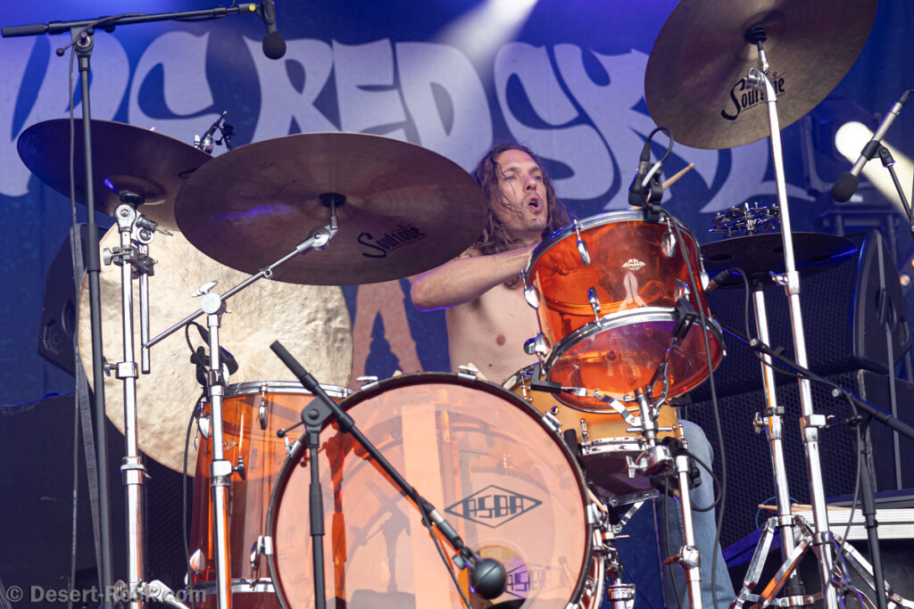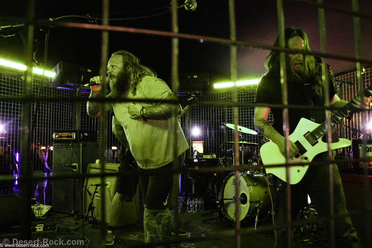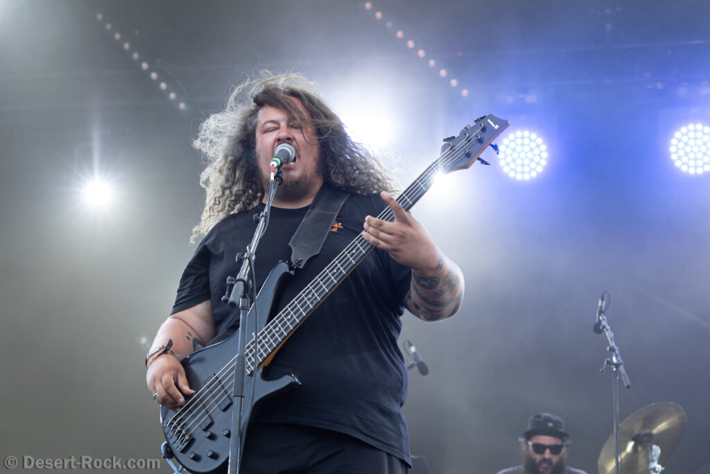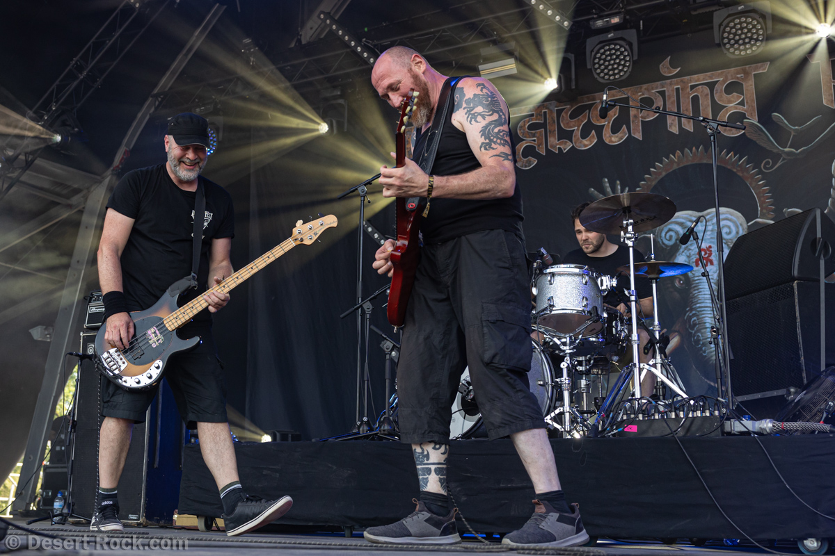 A priori, la perspective d’un énième concert de Conan ne sonne pas forcément pour vos serviteurs, un peu blasés et un peu usés, comme le point fort de la journée, en ce milieu d’après-midi. Pourtant, le trio anglais emmené par Jon Davis va délivrer sous nos yeux une excellente performance. Désormais épaulés par le vétéran David Ryley à la basse (discret mais impeccablement lourd), qui vient enrober la frappe de mule de Johnny King derrière ses futs, Conan lance les hostilités sur des extraits de son nouveau disque, puis bifurque assez vite vers ce qui ressemble à la recette d’un set solide et dévastateur : « Levitation Hoax », les classiques « Hawk as a Weapon », « Satsumo » et « Foehammer » tous enchaînés… les dégâts sur le public sont considérables. Bien armés par un son bulldozer, et par un Davis en bonne forme (on a parfois connu son chant moins assuré qu’aujourd’hui), la prestation du jour ne souffre d’aucune faiblesse, bien au contraire. Le final sur le terrible « Volt Thrower » vient achever les premiers rangs aux cervicales endolories, et on ne comprend pas trop ce qui s’est passé. Conan a été excellent aujourd’hui.