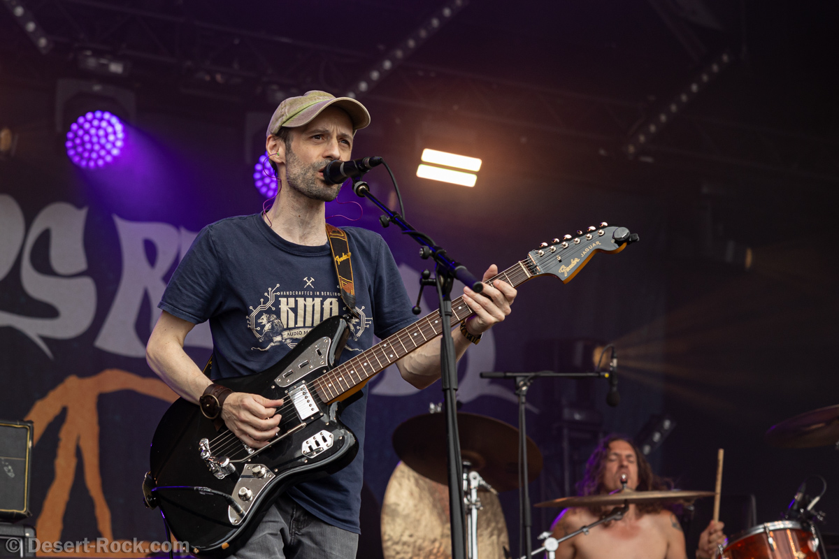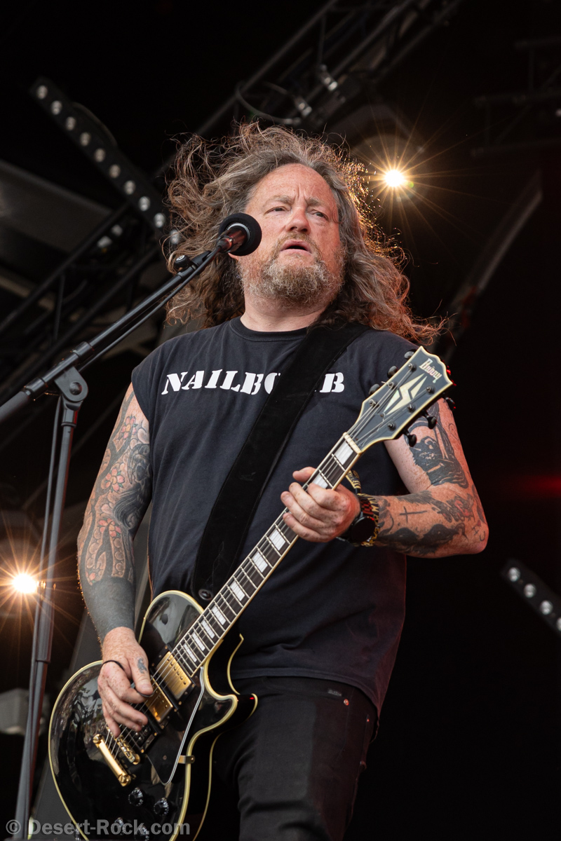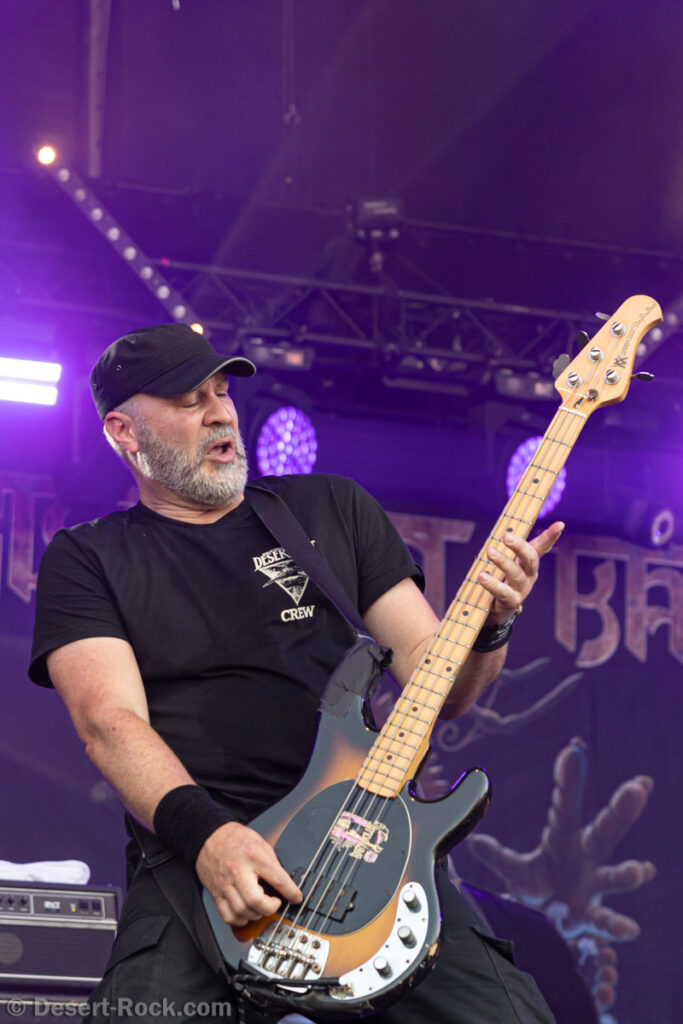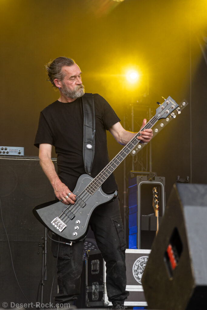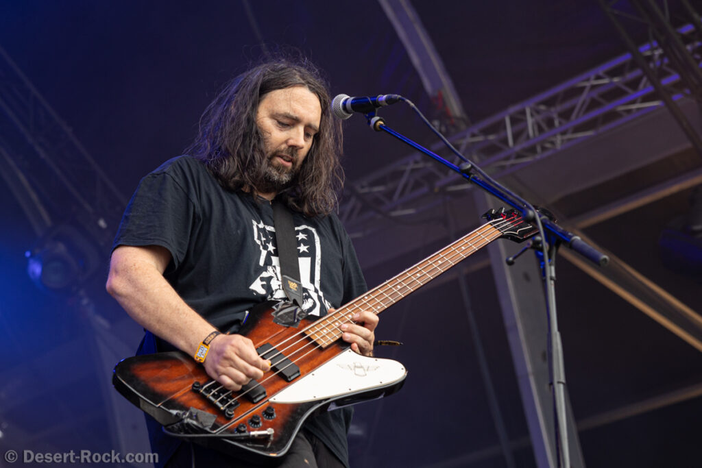S’il y a un groupe à la carrière chaotique, c’est bien The Midnight Ghost Train. Depuis une dizaine d’années, le groupe a connu diverses pauses (voire des arrêts « définitifs »), des mini tournées ou concerts ici ou là, évidemment des changements de personnel autour de Steve Moss, etc… Et pour 2025, cette mini-tournée européenne autour du Hellfest est annoncée comme (probablement) la dernière du groupe ! A l’heure du concert, Steve Moss arrive avec le sourire, mais… repart en coulisses immédiatement. Une corde cassée apparemment… Moins de deux minutes plus tard, il revient, sans impact donc, et nous aurons mis à profit ce temps de pause pour découvrir que la composition du groupe avait complètement changé, nouveau batteur et nouveau bassiste – ce dernier étant en fait Chuy Smit, le guitariste de Sons of Node, le groupe néérlandais qui accompagne TMGT sur cette tournée ! Bref, Moss fait vrombir le fuzz obèse de sa guitare et lance un furieux « Along the Chasm ». Enchaîné à ce rageur « Gladstone » cher à nos cœurs puis à ce glorieux « BC Trucker », on comprend vite que cette tournée hommage à l’album Cold Was the Ground qui fête ses 10 ans ne fait pas les choses à moitié, et toutes les compos originales du groupe aujourd’hui en seront issues ! Pas de quoi se plaindre, cet album étant probablement leur plus abouti et réussi. Les premières minutes nous font re-découvrir ce son de guitare glaireux et saturé emblématique qui porte des riffs taillés pour décorner des bœufs, le chant guttural et hargneux de Moss, et un sourire mi-satisfait, mi-nostalgique nous gagne. La section rythmique s’en sort avec les honneurs, et même si l’on regrette un peu les gigues de pachydermes qu’échangeaient Moss et Mike Boyne en faisant vibrer les planches à coups de pieds sur le sol, le trio sous sa forme du jour ne manque pas d’énergie. Pour finir sur une note un peu mitigée, le groupe bouffe complètement son créneau, empiétant de presque 10 minutes sur l’horaire de fin prévu (nos hommages aux techniciens qui doivent rattraper le retard ensuite…). Globalement toutefois, un retour gagnant de TMGT, et un vrai plaisir pour les spectateurs.