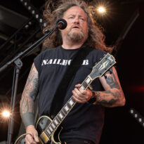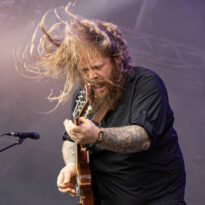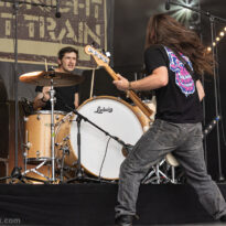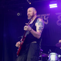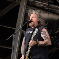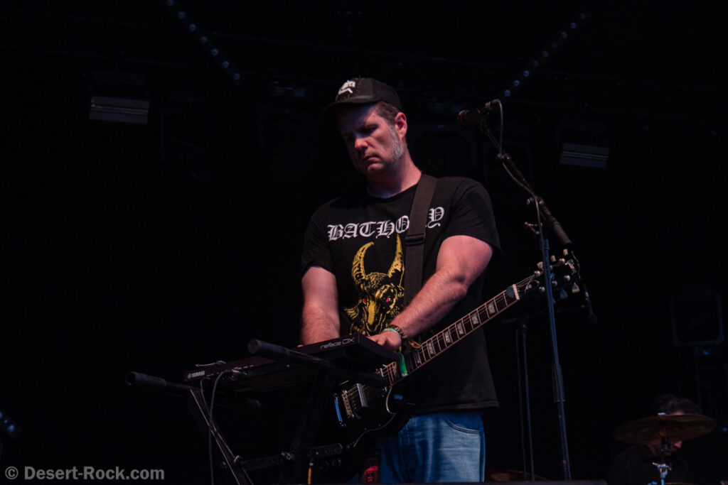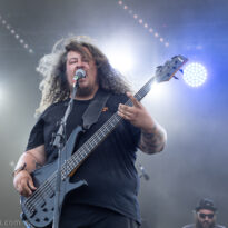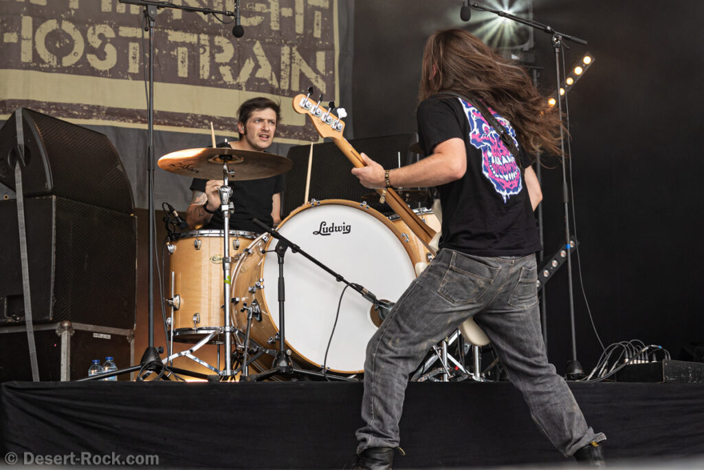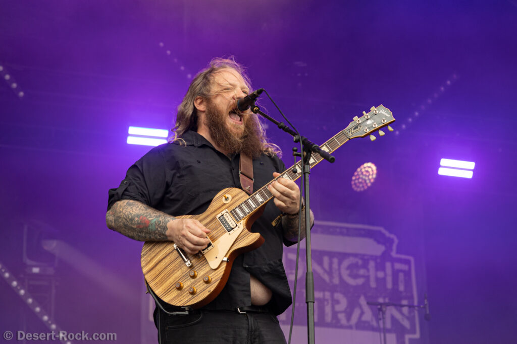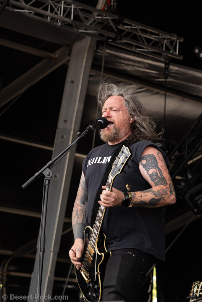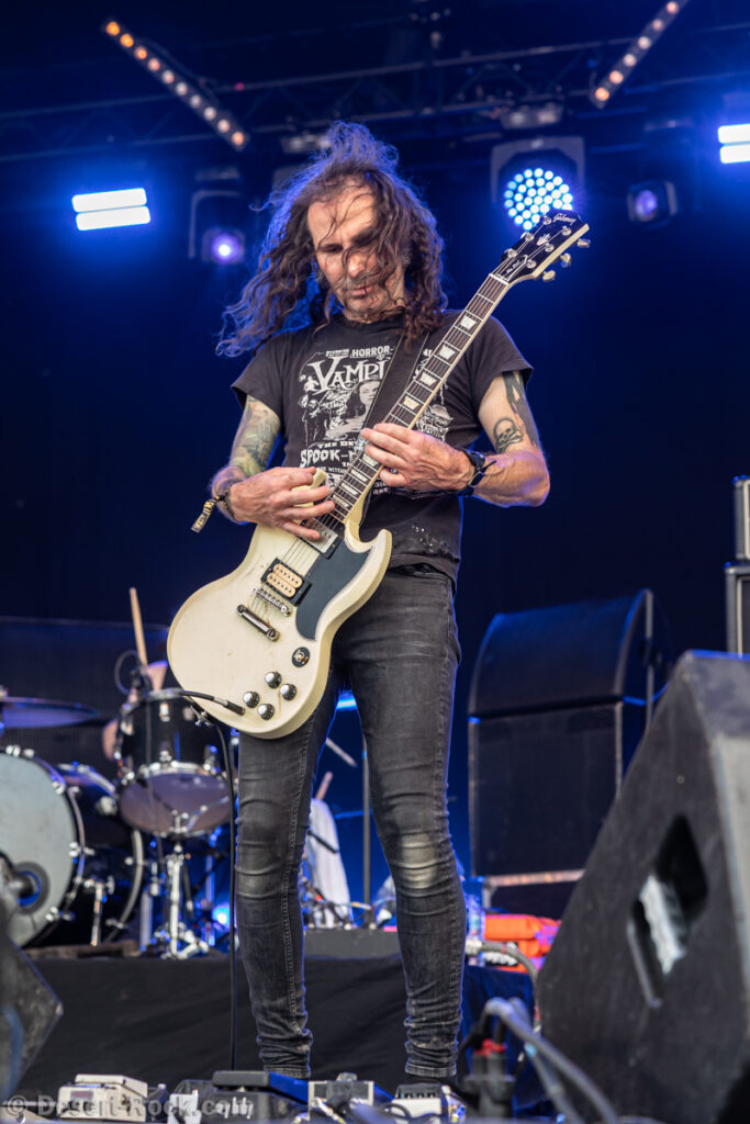 S’il y a un groupe à la carrière chaotique, c’est bien The Midnight Ghost Train. Depuis une dizaine d’années, le groupe a connu diverses pauses (voire des arrêts « définitifs »), des mini tournées ou concerts ici ou là, évidemment des changements de personnel autour de Steve Moss, etc… Et pour 2025, cette mini-tournée européenne autour du Hellfest est annoncée comme (probablement) la dernière du groupe ! A l’heure du concert, Steve Moss arrive avec le sourire, mais… repart en coulisses immédiatement. Une corde cassée apparemment… Moins de deux minutes plus tard, il revient, sans impact donc, et nous aurons mis à profit ce temps de pause pour découvrir que la composition du groupe avait complètement changé, nouveau batteur et nouveau bassiste – ce dernier étant en fait Chuy Smit, le guitariste de Sons of Node, le groupe néérlandais qui accompagne TMGT sur cette tournée ! Bref, Moss fait vrombir le fuzz obèse de sa guitare et lance un furieux « Along the Chasm ». Enchaîné à ce rageur « Gladstone » cher à nos cœurs puis à ce glorieux « BC Trucker », on comprend vite que cette tournée hommage à l’album Cold Was the Ground qui fête ses 10 ans ne fait pas les choses à moitié, et toutes les compos originales du groupe aujourd’hui en seront issues ! Pas de quoi se plaindre, cet album étant probablement leur plus abouti et réussi. Les premières minutes nous font re-découvrir ce son de guitare glaireux et saturé emblématique qui porte des riffs taillés pour décorner des bœufs, le chant guttural et hargneux de Moss, et un sourire mi-satisfait, mi-nostalgique nous gagne. La section rythmique s’en sort avec les honneurs, et même si l’on regrette un peu les gigues de pachydermes qu’échangeaient Moss et Mike Boyne en faisant vibrer les planches à coups de pieds sur le sol, le trio sous sa forme du jour ne manque pas d’énergie. Pour finir sur une note un peu mitigée, le groupe bouffe complètement son créneau, empiétant de presque 10 minutes sur l’horaire de fin prévu (nos hommages aux techniciens qui doivent rattraper le retard ensuite…). Globalement toutefois, un retour gagnant de TMGT, et un vrai plaisir pour les spectateurs.