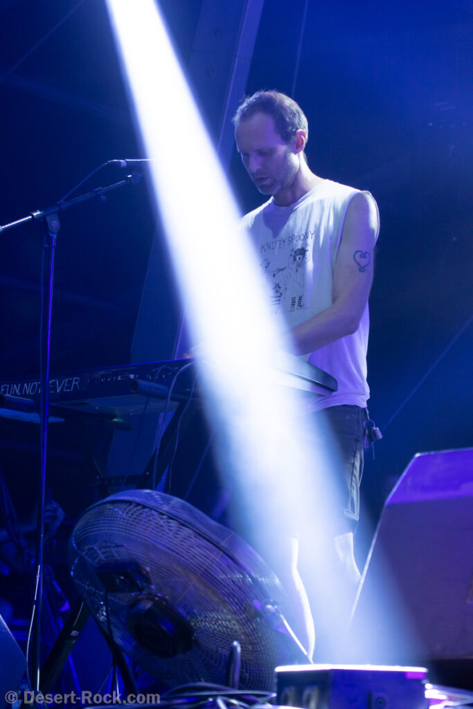 Le gang du Connecticut synthétise les années quatre-vingt pour en extraire un post-tout empreint de nappes synthétiques, de lignes de basse carrées, de bandes-son glauques, des passages EBM et des cris colériques lors de passages transpirants l’urgence. Le public est moins nombreux pour entamer ce virage stylistique à La Valley (on croise le public présent la veille pour Crippled Black Phœnix) qui va l’apporter jusqu’au milieu de la nuit. Échappant à notre style de prédilection, le set des Ricains appuyé par des lights aux petits oignons fait son effet auprès d’amateurs de sensations propices à se trémousser bercés dans leur enfance avec la trilogie mythique de The Cure, leur adolescence boutonneuse avec Michael Stipe dont la tessiture vocale est proche et leur trentaine avec les chants désespérés de Band Of Horses (on est loin du stoner). « Deep, deep » sera le point d’orgue de ce set avec l’intensité qu’apporte le frontman en vivant sa musique. Un final grandiose vient ponctuer ce dernier show de leur tournée européenne quand le groupe lâche toute son énergie sur une ligne de basse impeccable (clairement un atout de cette formation pour l’exercice live) rappelant « The Caterpillar » de la bande à Bob Smith.