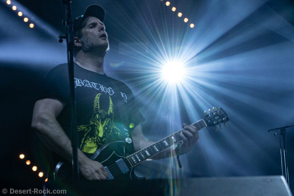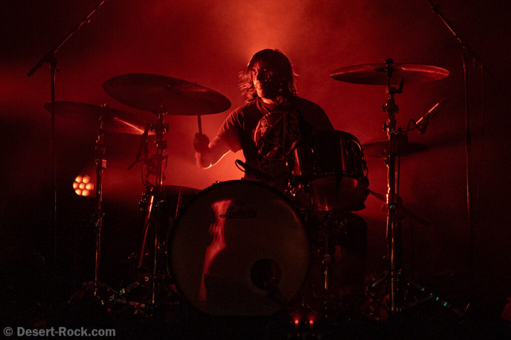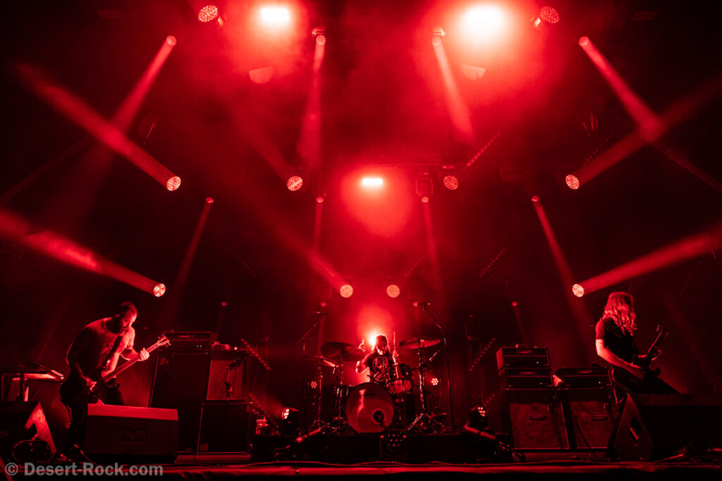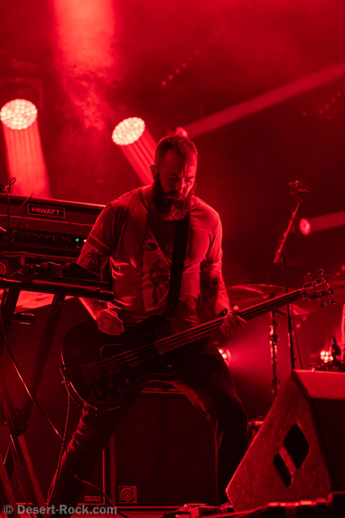 Le trio américain de post metal a copieusement tourné ces derniers mois, y compris via une salve de dates en France notamment ; il n’y a donc pas vraiment de parfum « événementiel » qui vient entourer cette prestation. De plus, le groupe est rodé et… assez prévisible, et l’on sait à peu près avant même que le concert commence ce que l’on va trouver : Mike Sullivan va interpréter ses parties de guitare statique, debout, l’air pénétré par sa musique, droit comme un I quasiment tout le concert, Dave Turncrantz va taper fort et de manière métronomique sur ses futs, et Brian Cook, empêché par ses matériels (pédales, claviers…) va rester dans son coin à gauche, à headbanguer comme un furieux. Le tout baignera dans un océan de lights sombres (!), si possible en contre jour. Guess what ? C’est exactement ce qu’on a eu ! Heureusement, la surprise est venue de la set list… ah ben non. Que des classiques ! L’enchaînement « 309 » / « Harper Lewis », puissant et efficace, nous fait déjà imaginer une set list sans surprise, ce qui se confirmera assez vite. Tout au plus les plus récents « Betrayal » et « Gnosis » qui viennent clôturer le set sont un peu moins connus, mais pour le reste, du classique, avec une mention particulière pour un efficace « Mota », mêlant mélodie et riffing massif en final. Le set défile ainsi sans déplaisir, efficace en diable, doté d’un son colossal au cœur de la nuit, mais, donc, sans surprise.