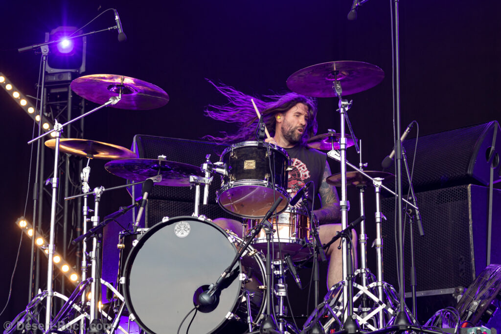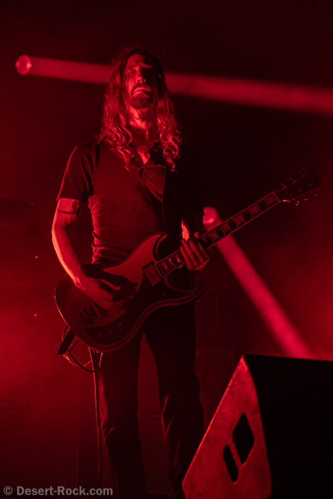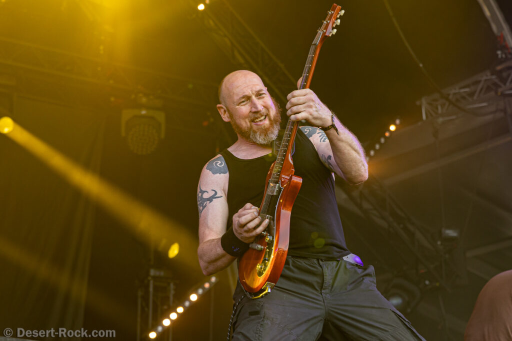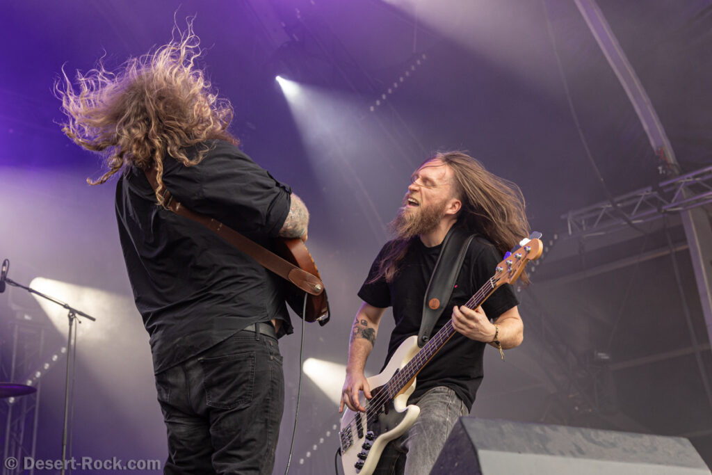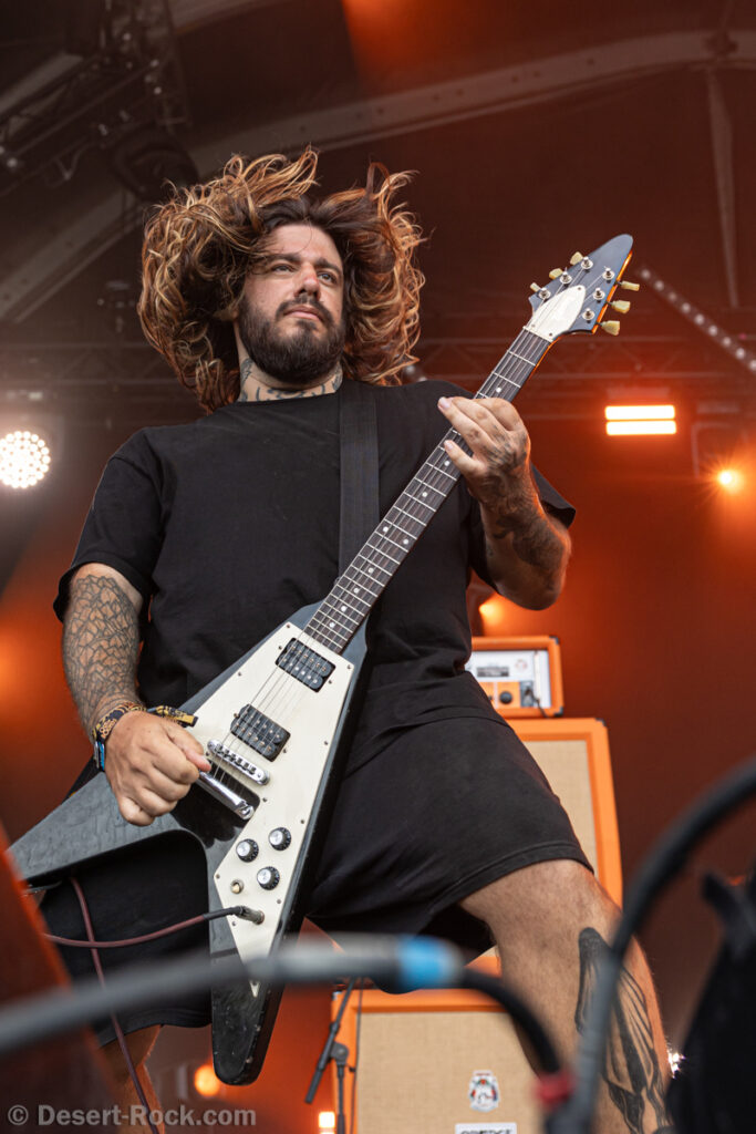 Le statut de Mars Red Sky depuis quelques années au sein de la scène française et européenne justifie des invitations régulières au Hellfest. En outre, le trio girondin est un habitué des tournées intensives et des concerts de tous ordres (clubs, grandes salles, festivals…), on n’est donc pas étonné de les voir prendre la scène avec leur aisance habituelle, sans pression apparente. Autre constante avec le groupe : on vient les voir pour se faire envoûter et écraser par leur musique, et pas pour les regarder danser la gigue. Ils savent occuper une scène, ils ne sont pas figés (il faut voir Mat derrière ses fûts qui tient difficilement en place…), Jimmy échange pas mal avec le public entre les morceaux (« Salut les Vieilles Charrues !« ) mais c’est la musique qui prime. Et côté musique, donc, on a affaire à un groupe en totale maîtrise de son sujet. Élaborer un set de 40 minutes quand on a 5 albums et plusieurs EPs dans sa discographie est compliqué. Mais ils parviennent à proposer un savant mélange de titres nouveaux (« The Final Round », le plus audacieux « Maps of Inferno », qui passe bien…) et de classiques (« Apex III » impeccable, « The Light Beyond », le final obligatoire sur « Strong Reflection »). Peu de risques de tomber à côté quand on a ce type de compos en rayon… Le public est bien dedans, bénéficiant encore une fois d’un son classieux. Nonchalant (les nuages sont appréciés, mais la chaleur est quand même là, ainsi que la fatigue), il ondule au gré des lignes de basse et se laisse bercer par les vocaux enivrants et les leads de Julien. Ce dernier est impeccable aujourd’hui, parfaitement juste dans son chant (on sait comme c’est un marqueur important de la musique de Mars Red Sky) et son jeu de guitare. Très bon concert.