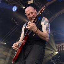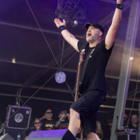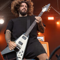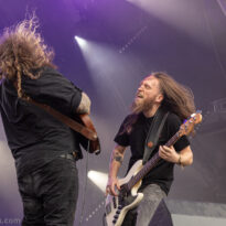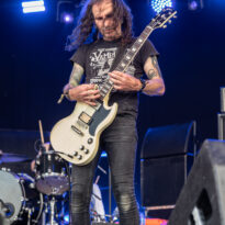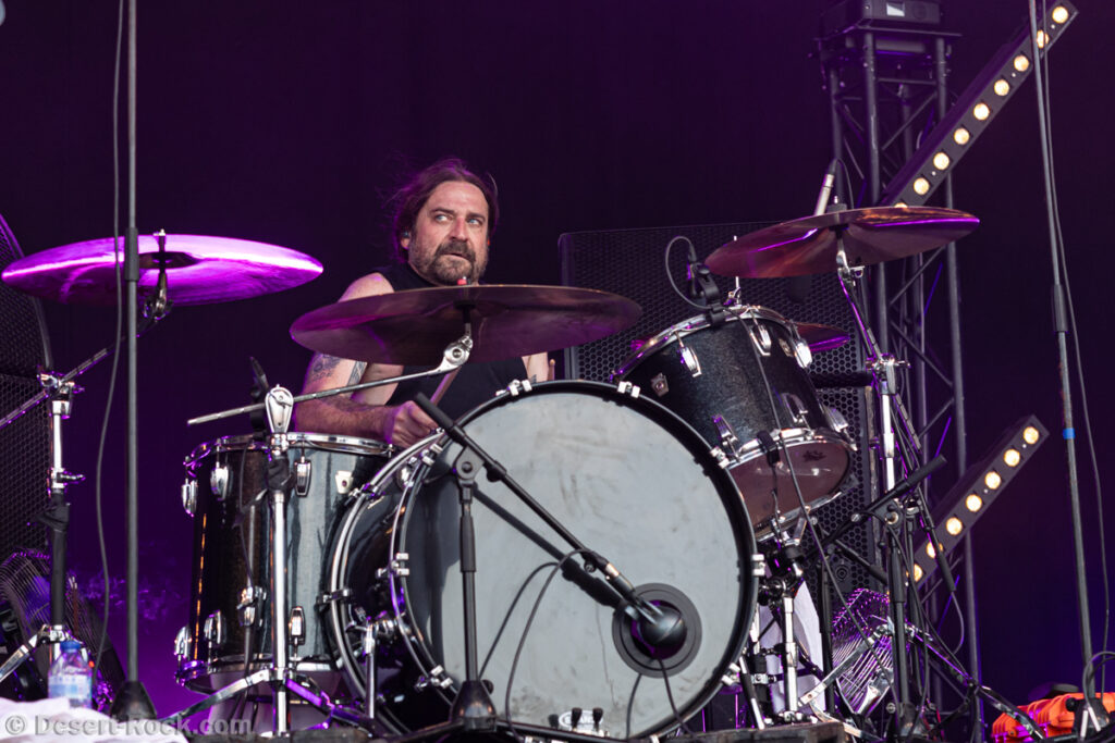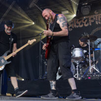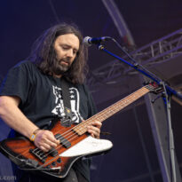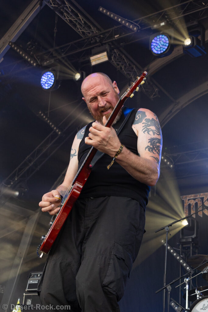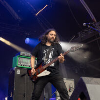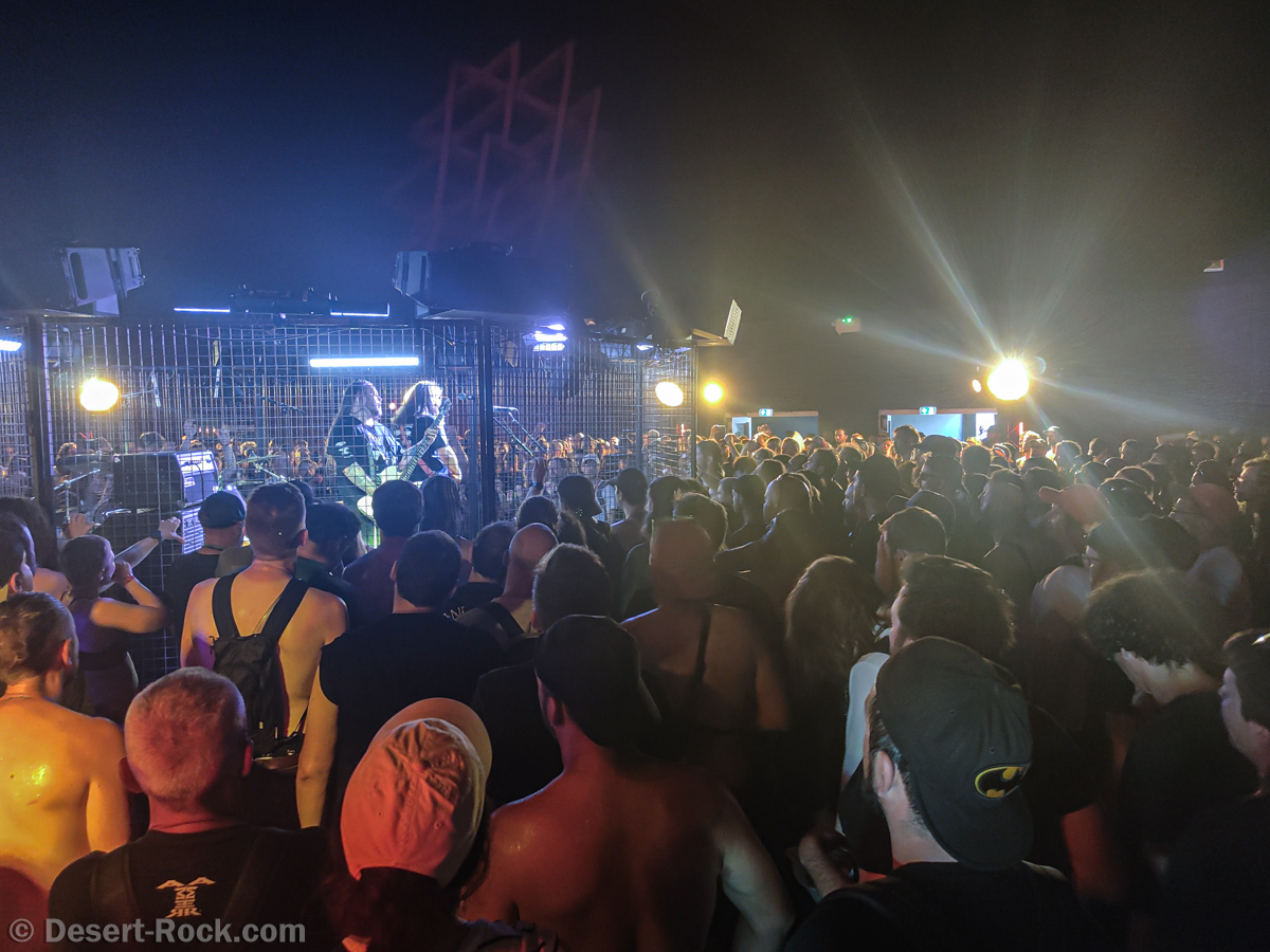 Le statut de Mars Red Sky depuis quelques années au sein de la scène française et européenne justifie des invitations régulières au Hellfest. En outre, le trio girondin est un habitué des tournées intensives et des concerts de tous ordres (clubs, grandes salles, festivals…), on n’est donc pas étonné de les voir prendre la scène avec leur aisance habituelle, sans pression apparente. Autre constante avec le groupe : on vient les voir pour se faire envoûter et écraser par leur musique, et pas pour les regarder danser la gigue. Ils savent occuper une scène, ils ne sont pas figés (il faut voir Mat derrière ses fûts qui tient difficilement en place…), Jimmy échange pas mal avec le public entre les morceaux (« Salut les Vieilles Charrues !« ) mais c’est la musique qui prime. Et côté musique, donc, on a affaire à un groupe en totale maîtrise de son sujet. Élaborer un set de 40 minutes quand on a 5 albums et plusieurs EPs dans sa discographie est compliqué. Mais ils parviennent à proposer un savant mélange de titres nouveaux (« The Final Round », le plus audacieux « Maps of Inferno », qui passe bien…) et de classiques (« Apex III » impeccable, « The Light Beyond », le final obligatoire sur « Strong Reflection »). Peu de risques de tomber à côté quand on a ce type de compos en rayon… Le public est bien dedans, bénéficiant encore une fois d’un son classieux. Nonchalant (les nuages sont appréciés, mais la chaleur est quand même là, ainsi que la fatigue), il ondule au gré des lignes de basse et se laisse bercer par les vocaux enivrants et les leads de Julien. Ce dernier est impeccable aujourd’hui, parfaitement juste dans son chant (on sait comme c’est un marqueur important de la musique de Mars Red Sky) et son jeu de guitare. Très bon concert.