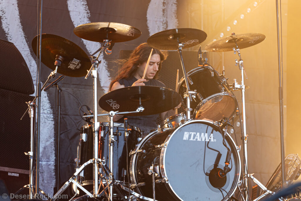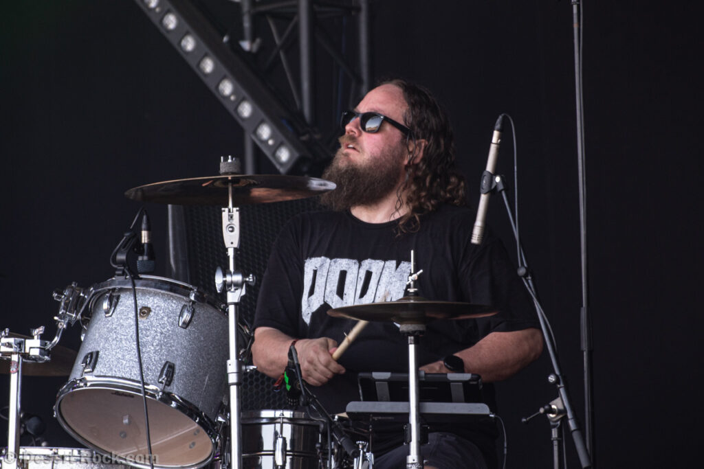Nouvelle découverte pour vos serviteurs, ce trio féminin se présente crânement sur la Valley en proposant une musique qui ratisse très large : post-rock, sludge mélodique, metal, doom… Elles appellent ça « doom de fées » et on ne trouvera pas meilleur qualificatif aujourd’hui ! Ari (guitare) et Jenna (basse) se passent le relais pour vocaliser, en mêlant chant crié, clair, hurlements gutturaux… A l’avenant, la musique propose des plans rock et mélodiques, puis passe à des assauts nerveux, bien servis par une batterie qui sait se faire furieuse au besoin. Même si ça peut sembler décousu parfois, on sent que les californiennes ont bien maturé leur style et l’ensemble se tient avec une belle cohérence et une efficacité certaine. Le public ne s’est pas déplacé en nombre pour l’apprécier, mais celles et ceux présents headbanguent de bon coeur en particulier sur les passages les plus lourds / doom. Une bonne découverte.