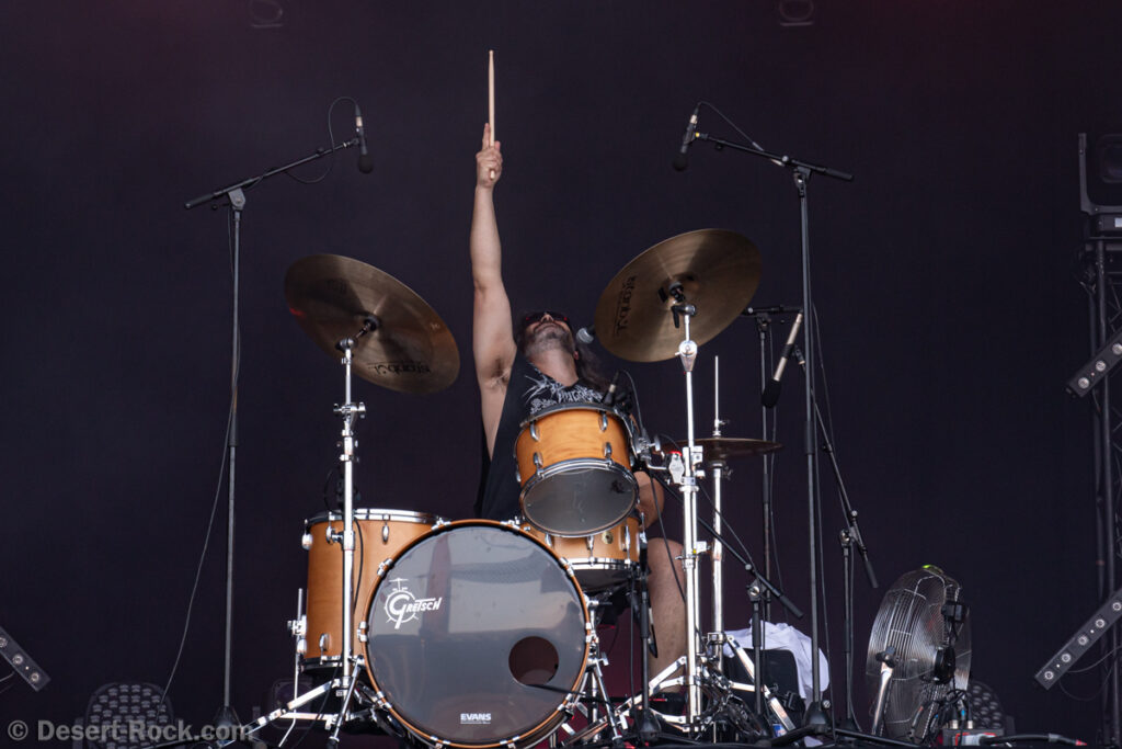 Powder for PigeonsPrésent fréquemment sur les débuts de sa carrière à bon nombre de festivals et plateaux stoner ou assimilés, le duo germano-australien a progressivement fait évoluer sa musique vers des contrées plus power-rock voire metal. La fuzz n’est jamais très loin, et le riff est systématiquement énergique. Rhys le guitariste chanteur s’est fait la buzz cut pour l’occasion de jouer au Hellfest. Mais la coupe de cheveux n’a pas grand chose à voir avec l’efficacité de leur musique. Meike violente les fûts comme à l’accoutumée tandis que sa moitié joue et chante fort. La conquête du public est totale et le duo d’artisans du rock peut repartir sur un petit nuage. |