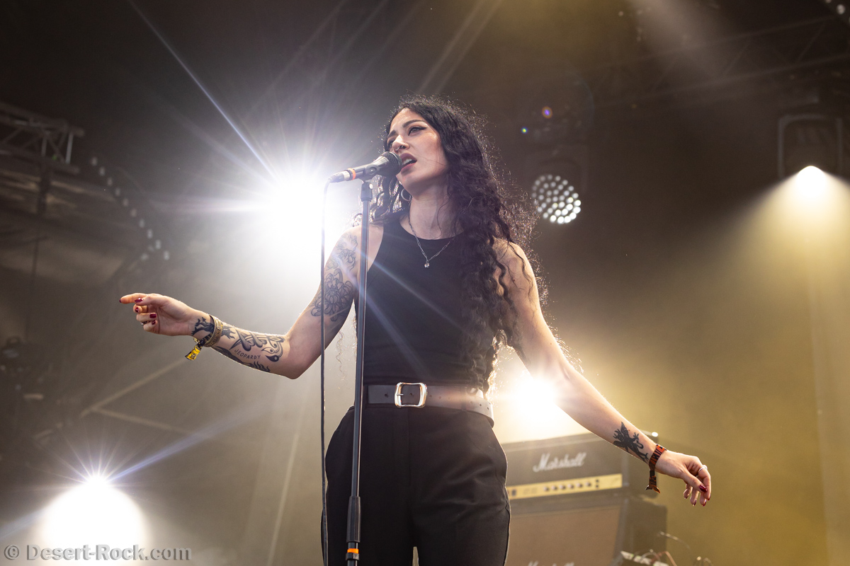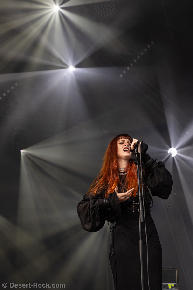 En voyant les musiciens de Messa monter sur scène, on prend la mesure de l’évolution opérée ces dernières années : pantalon de tailleur noir impeccable et escarpins pour Sara, chemise noire, pantalon à pince et talonnettes pour l’aquilin guitariste Alberto, tenue noire, cheveux gominés et lunettes de soleil design pour Marco… On peut dire adieu à la formation parfois presque timide de doom atmosphérique que l’on connaissait depuis plusieurs années. Musicalement, le virage vers une sorte de dark metal atmosphérique, tangible sur le discutable nouvel album The Spin, ne laisse plus aucun doute. Le quatuor transalpin a fait table rase du passé, jouant aujourd’hui rien moins que six titres (!) de son dernier disque ! Les anciens et les fans du groupe depuis ses jeunes années n’auront qu’un modeste « Rubedo » à se mettre sous la dent en souvenir du bon temps, un titre loin d’être le plus doom de leur carrière, qui finalement s’inscrit pas mal dans cette nouvelle mouvance. En toute objectivité, Messa est à l’aise dans son nouveau registre, Sara est impeccable au chant et scéniquement (quand on l’a connue prostrée derrière son micro pendant des sets entiers, on ne peut que prendre la mesure du changement) et musicalement l’ensemble est fort solide, et entraînant. On ne passe pas un mauvais moment. En revanche, ce n’est plus vraiment le même groupe – même si rien n’interdit d’aimer le nouveau Messa.