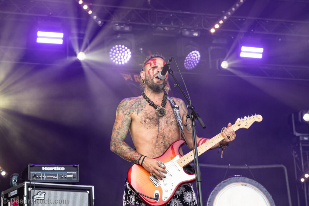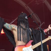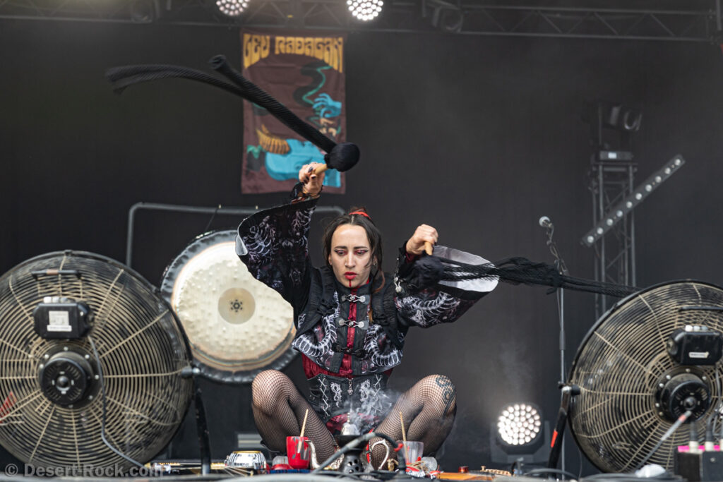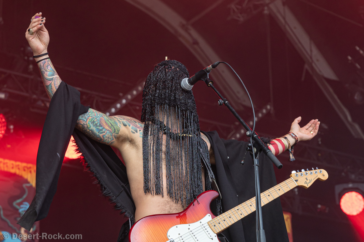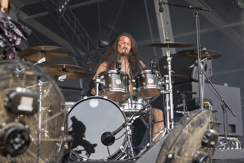 Hier, nous apprenions que Crows avait annulé sa participation au festival (sans que le motif de leur défection ne soit précisé), et c’est donc à nouveau du côté de la… Purple House, que l’organisation du Hellfest a été dégoter un remplaçant de dernière minute ! Le gagnant du jour est Lev Radagan. Inconnu de nos équipes (nous avions prévu de le découvrir sur la Purple House…), le duo se présente sur la Valley avec un dispositif scénique ambitieux (ils n’auraient jamais pu faire rentrer tout ce bazar dans la cage de la Purple House !) – exception faite de ces 3 petits drapeaux qui font office de backdrop… Autour d’une imagerie etno-indo-asiatico-hindou-ésotérique (!) le duo berlinois (d’origine sud-américaine) développe un rock psychédélique pas dénué d’intérêt. Scéniquement, outre quelques oripeaux fantasques et maquillage pour les musiciens, ils peuvent compter sur deux danseuses qui assurent le show : elles dansent, animent divers rituels, viennent à la rencontre du public pour le maquiller, lui envoient des pommes… et atterrissent même dans le public, pour organiser un saugrenu wall of death, et stimuler une sorte de circle pit / pogo géant ! Bref, on ne s’ennuie pas. Le qualificatif de « skate board slide guitar » dont le groupe se dote souvent reste un peu abusif et cliché, Sxantana Radagan ne s’emparant de sa guitare skateboard que pour une reprise du « Voodoo Chile » de Jimi Hendrix. Mais la prestation globale est remarquable et remarquée, même si le spectacle l’a un peu trop emporté sur la musique.