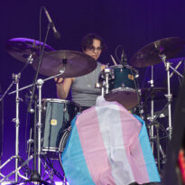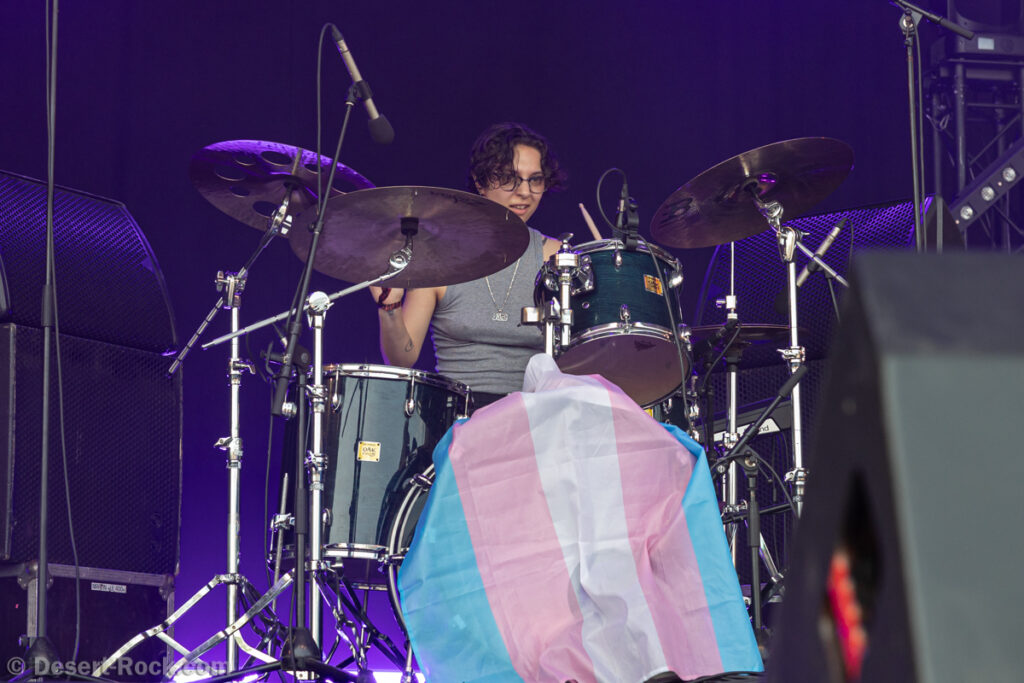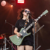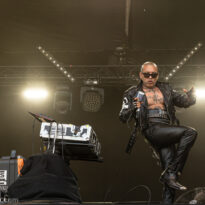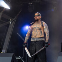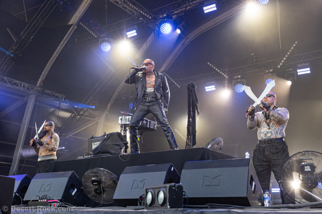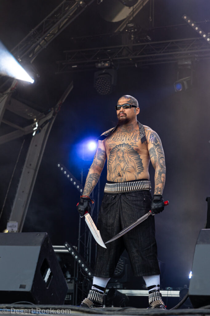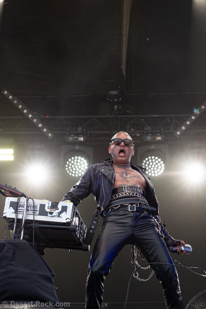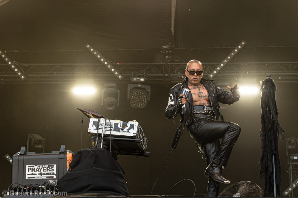 On vous avoue qu’avec la programmation de la journée depuis ce matin sur la Valley, on voyait se dessiner une tendance très intéressante, visant à afficher et affirmer la présence de femmes dans des formations de nos styles musicaux… Cette perspective vole littéralement en éclats au début du site de Prayers, où on assiste littéralement à un déferlement indécent de testostérone : un Chicano cholo-style tout de cuir et d’accessoires clinquants vêtu, qui gesticule en chantant sur une estrade au milieu de la scène, avec deux colosses baraqués torses nus, armés de sabres, immobiles en mode statue, flanqués sur les côtés. Rafael Reyes (monsieur Kat Von D à la ville) se déhanche ostensiblement avec son micro, chante des plans beat dance voire hip hop, et lance des sons et séquences via son petit clavier / sampler. Duo sur disque, Prayers se décline en solo uniquement sur scène, où Reyes mène seul la barque. En termes de programmation, on est dans le décalage, clairement, voire la parenthèse dans la journée (et le week-end). Hormis une trentaine de fans au premier rang, le public présent, pas en très grand nombre, dansouille gentiment au rythme des beats nerveux, reste 5 min, continue sa balade… On est dans l’expérimentation, ce n’est pas désagréable et personne ne passe un mauvais moment. Une expérience intéressante à vivre, mais le décalage musical et stylistique (on parle de l’image aussi) est assez confusant – peut-être un peu trop.