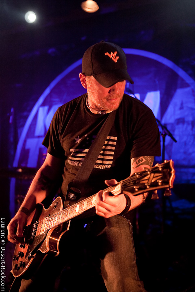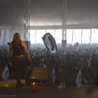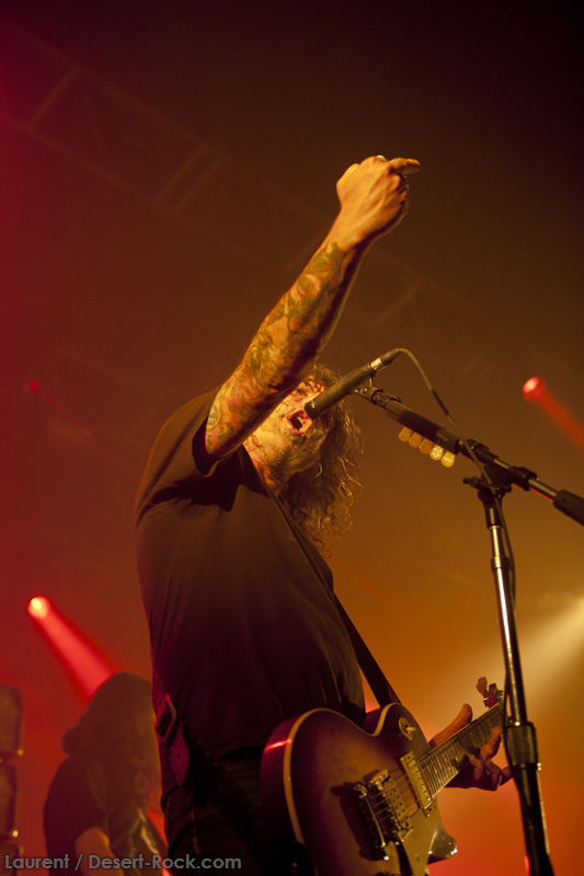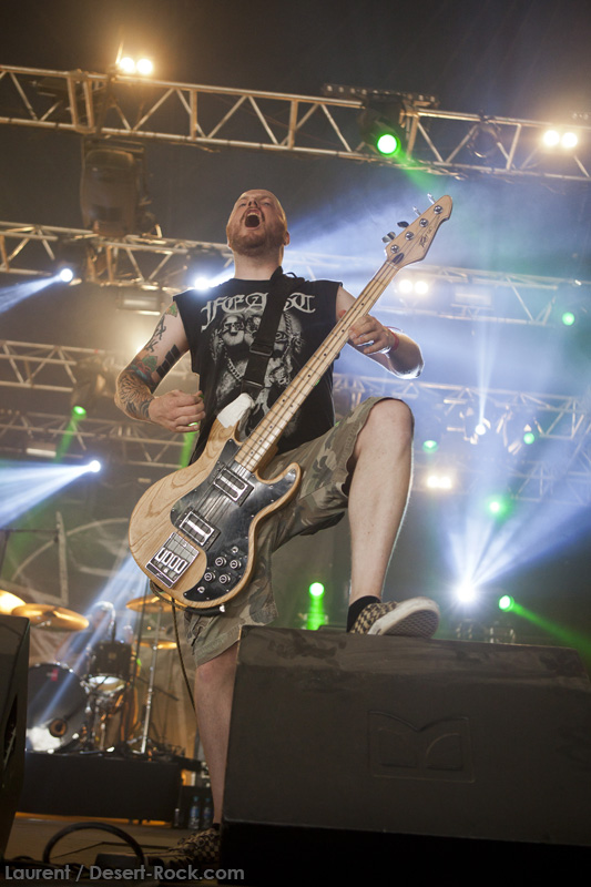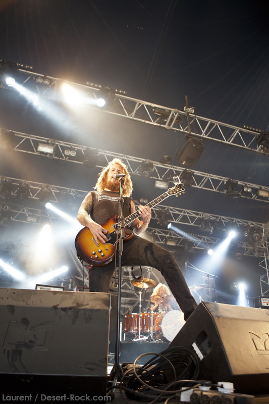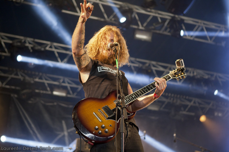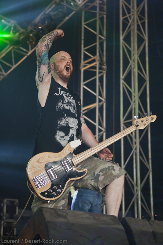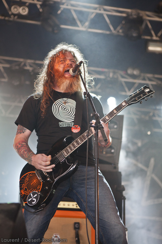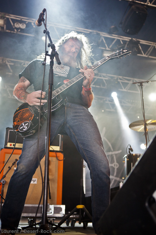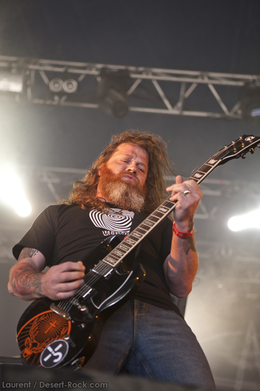 De manière a priori inexplicable, la tension ambiante est palpable alors que l’heure du set de CLUTCH se rapproche. Il faut voir aussi la tente se remplir petit à petit, et le public continuer à se rapprocher et se masser inexorablement, entassés jusqu’à largement hors des limites de la tente. Et même sur le côté de la scène, on sent que « quelque chose se passe » en voyant les musiciens de Monster Magnet, Acid King, Witch Mountain, la paire Nick Oliveri / Joey Castillo (anciens de QOTSA, les deux lascars se retrouvaient avec Bl’ast !, un combo hardcore punkoïde qui jouait l’après-midi sous la Warzone), etc… se masser avec le sourire pour essayer de voir un bout de la performance ! Il y a une électricité et une tension remarquables dans l’air au moment où le combo monte sur scène sur le rythme funky de Chuck Brown qui leur sert d’intro depuis quelques années. De manière assez frustrante, Clutch a moins d’une heure de set ce soir. Le quatuor en a pleinement conscience, et devra faire dans la dentelle niveau set list. En engageant les hostilités sur « The Mob Goes Wild », enchaînée à deux titres de « Earth Rocker », ils passent un message clair au public, qui l’entendait bien de cette oreille : ce soir, des culs vont être bottés, par milliers. En calant « Gravel Road » en milieu de set, ils rappellent inéluctablement cet événement qui (je le pense) fut décisif dans leur lancement de carrière « tardif » en France, à savoir leur passage il y a cinq ans sur la mainstage où, alors quasi inconnus, ils entamaient leur set par ce même titre, l’un des plus audacieux de leur répertoire, bluffant (et embarquant) un public qui s’attendait à du hard rock classique. Même effet ce soir, mais devant un public qui les regarde avec la bave aux lèvres… Parce que le groupe est humain, ils se plantent un peu sur la transition « The Regulator » / « Mice and Gods »… Est-ce que ça diminue l’efficacité de ces petites bombes ? Je vous laisse imaginer la réponse, tandis qu’un parterre de fans à perte de vue saute dans tous les sens, slamme et chante les paroles le sourire aux lèvres… Le son, et on ne l’a pas assez souligné jusqu’ici (alors que ce fut une constante sous la Valley) est d’excellente facture, net, quasi cristallin, pointu… On a du mal à se réaliser qu’on est (presque) en open air ! Dans ses petits souliers, Neil Fallon reste sous tension sur toute la longueur du set, qu’il s’agisse de ses lignes vocales puissantes et toujours percutantes, de son jeu de scène énergique, ou de ses nombreuses interventions « instrumentales » (slide, électro-acoustique, « cloche », etc…). Le reste du combo, comme d’hab’, reste surtout concentré sur ses parties, mais n’est encore une fois à aucun moment pris à défaut. Solide. Parce qu’il n’aura jamais été dit que Clutch se la joue facile, ils glissent même en milieu de set un inédit, un titre plutôt rapide et punchy qui cartonne sur un public qui n’en demandait pas tant. Le final sur « Electric Worry » et « The Wolf Man Kindly requests… » est juste impeccable, et achève une tente qui a vécu un rêve éveillé pendant une petite heure. Pour beaucoup, ce set de Clutch fut le point d’orgue du Hellfest. J’aurais bien du mal à trouver beaucoup d’arguments contradictoires.