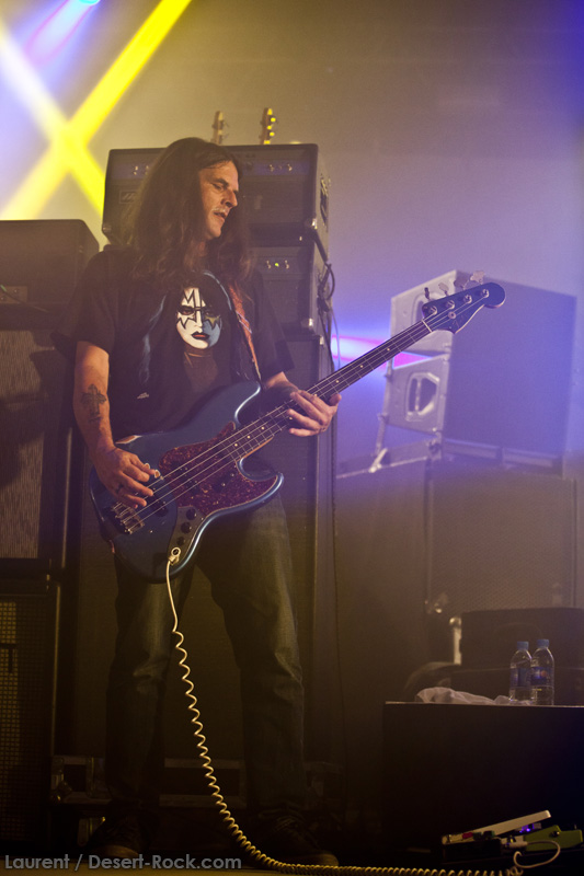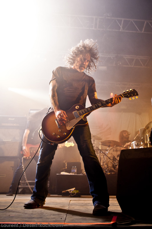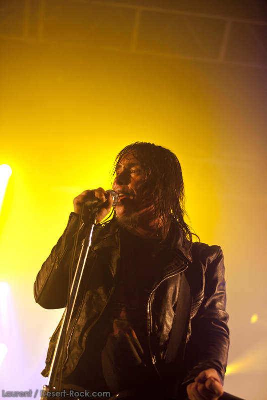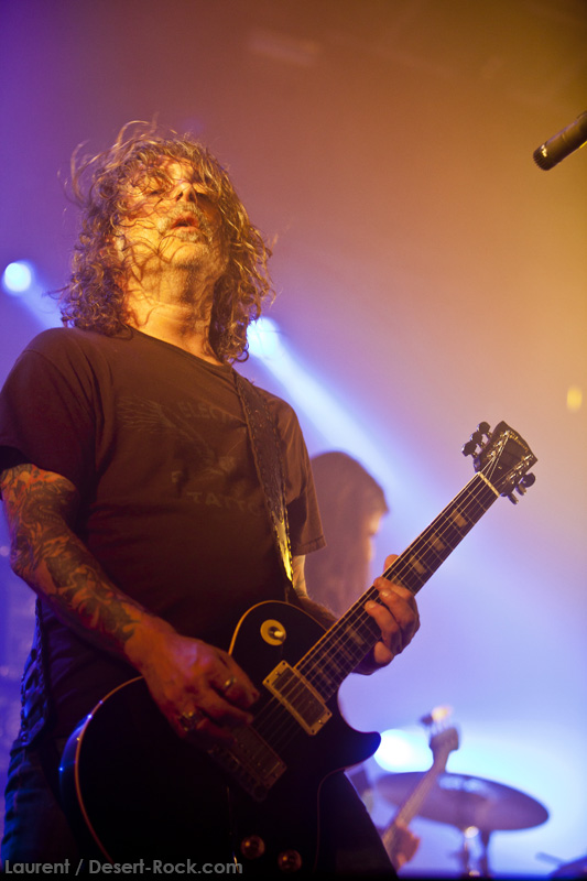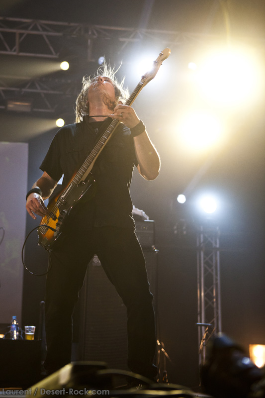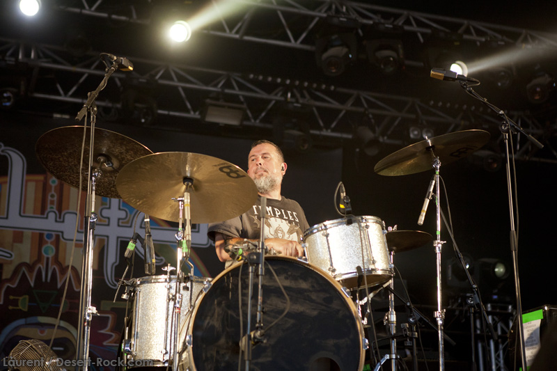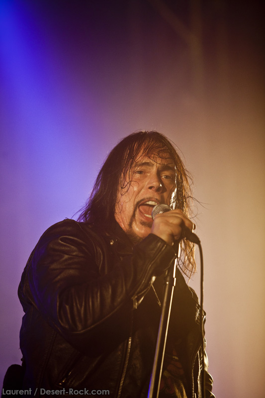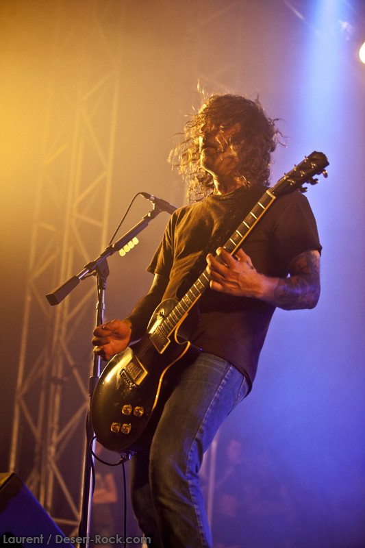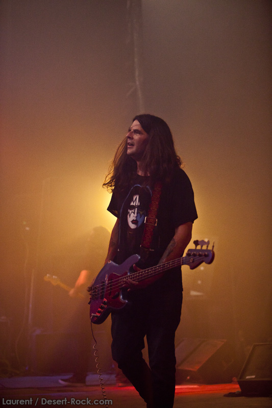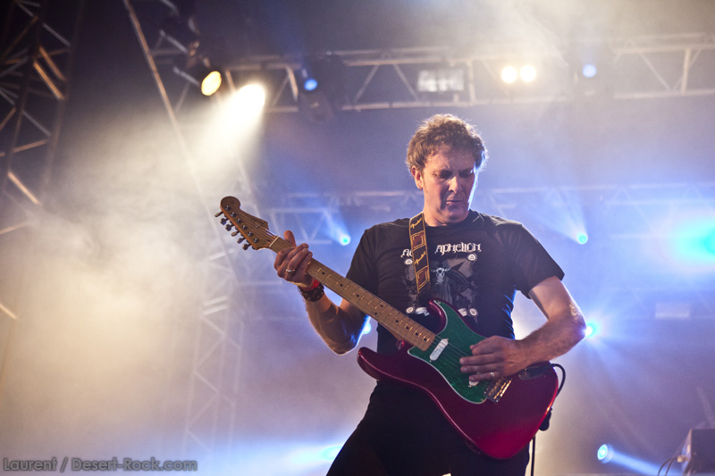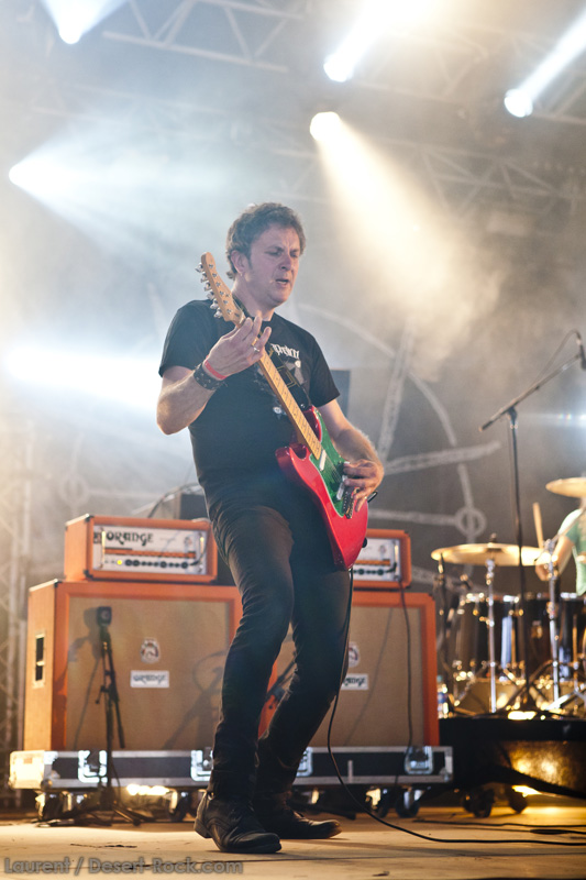Disons-le tout net, la notoriété de MONSTER MAGNET n’atteint pas celle de Clutch vis-à-vis d’un large public rock / hard rock. Le quintette Est-Américain voit donc une ambiance plus apaisée installée dans son public, dans une tente néanmoins bien garnie. Et là aussi, s’il est dit quelque part dans les Dix Commandements du concert rock que le premier morceau donne la tonalité d’un set, alors en balançant « Superjudge » en intro, l’aimant monstrueux ne joue pas la facilité et laisse présager une ambiance space rock affirmée. Ambiance confirmée par le voluptueux mais épais brouillard qui envahit la scène sur toute la durée du set, fumée dans laquelle se distinguent à peine les silhouettes de nos cinq lascars. On se prend à détecter les prémices d’une set list de puristes alors que suivent « Medicine » et le classieux et trippant « Nod Scene ». Frissons, alors que s’enchaînent encore quelques vieux classiques (« Dopes… », « Twin Earth »…). Scéniquement, on peut le dire, le groupe est « at the top of their game », tout le monde est impeccable, et Wyndorf est impérial : vocaux sans failles, posture de frontman assumée, il est en forme et même souriant ! Les autres sont impeccables d’interprétation et de prestance, rien à redire, y compris Garrett Sweeny, qui confirme tout le bien que l’on pense de lui, qu’il s’agisse de ses leads incandescentes ou de ses rythmiques robustes. On était plus curieux de voir le remplaçant du puissant Jim Baglino à la basse, qui en son temps transmettait une énergie scénique appréciable. Son successeur est Chris Kosnik, le bassiste de… The Atomic Bitchwax (ça devient limite incestueux leurs conneries…). Sur scène, c’est le jour et la nuit : Kosnik est calé en fond de scène contre son ampli, et joue ses parties (impeccablement) en regardant ses collègues ou le bord de scène. Heureusement les autres maintiennent l’attention d’un public en état de semi-hypnose. Les surprises continuent à défiler sur scène, avec maintenant le puissant « Look to your Orb for the Warning ». Le set est immersif, efficace, et ne laisse pas au public l’occasion d’atterrir pour reprendre ses esprits même quelques minutes… Pris du même vertige, on s’aperçoit petit à petit qu’aucun des titres joués jusqu’ici n’a moins de… dix-huit ans ! N’étaient-ils pas supposés promouvoir leur dernier album, le superbe « Last Patrol » sorti il y a quelques mois à peine ? Quelle démarche commercialement suicidaire ! Pas stupides non plus, le groupe enquille en conclusion les traditionnels « Powertrip » et « Spacelord » (qui ont quand même plus de seize ans, pas non plus des titres très récents !). Succès garanti sur ces morceaux, qui laissent un public d’afficionados et de nouveaux convaincus exsangues, béats, qui planent un petit moment encore après le set dans une Valley qui prend quelques minutes pour atterrir et reprendre ses esprits… En voyant Dave Wyndorf quitter la scène fier comme un pape et avec un sourire jusqu’aux oreilles, on peut confirmer que ce sentiment du devoir (bien) accompli est assez unanimement partagé ce soir.