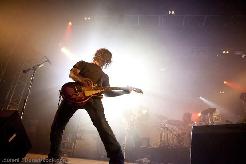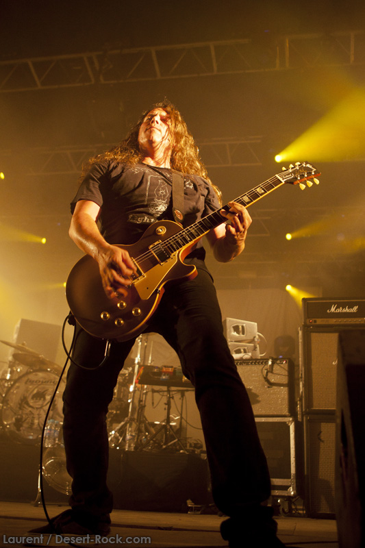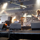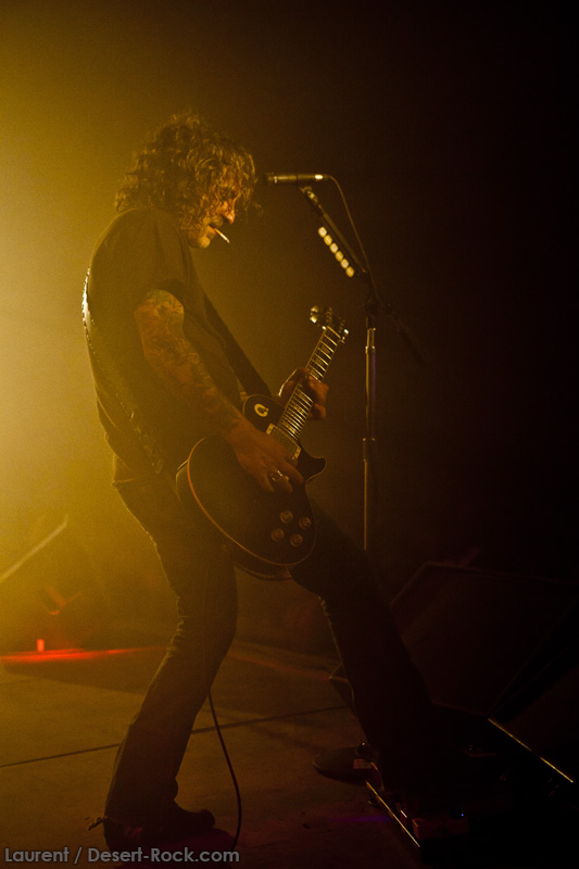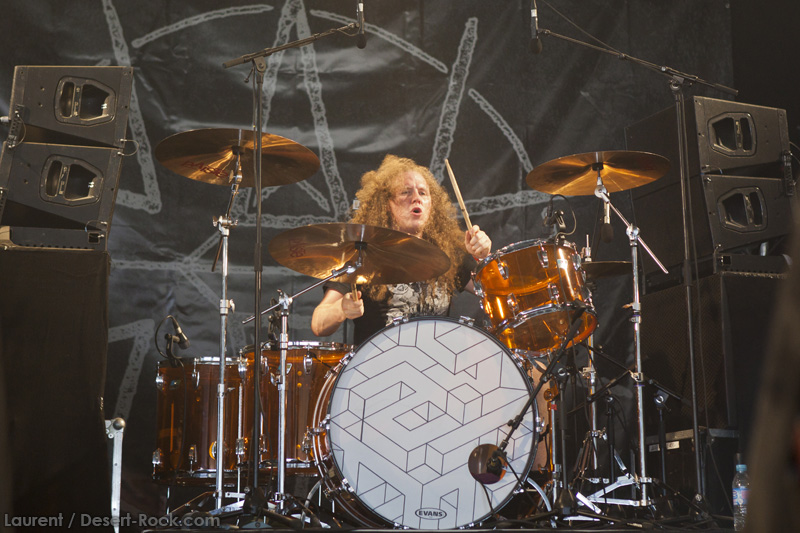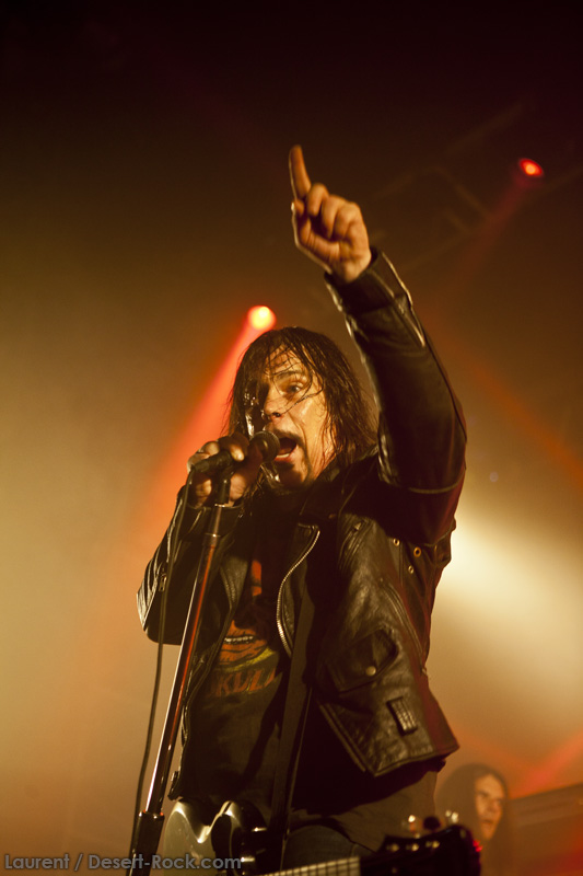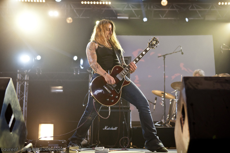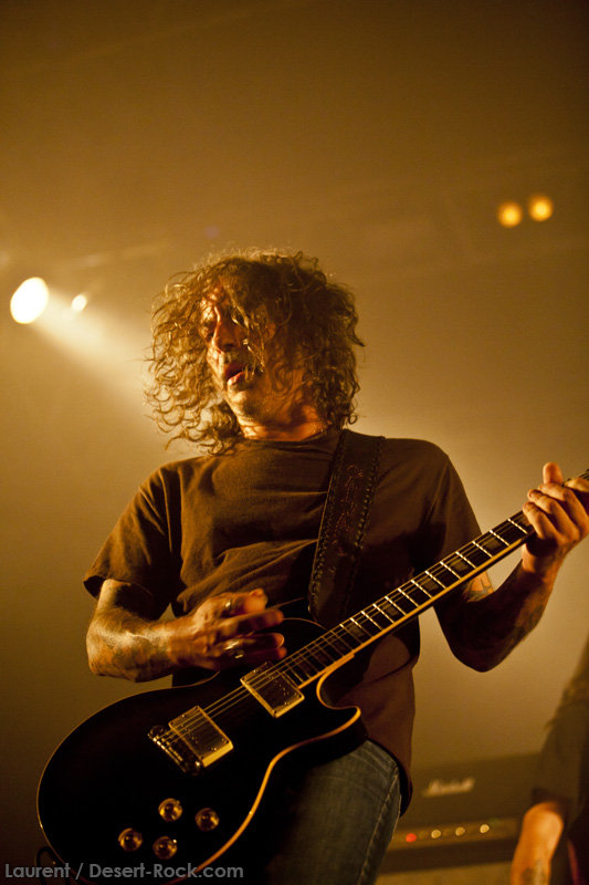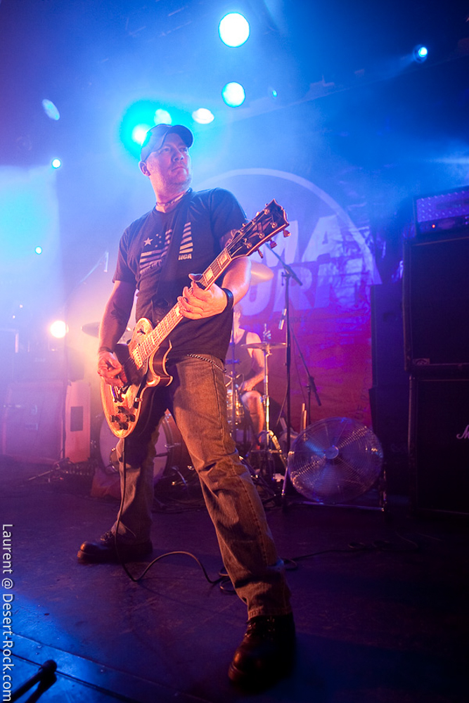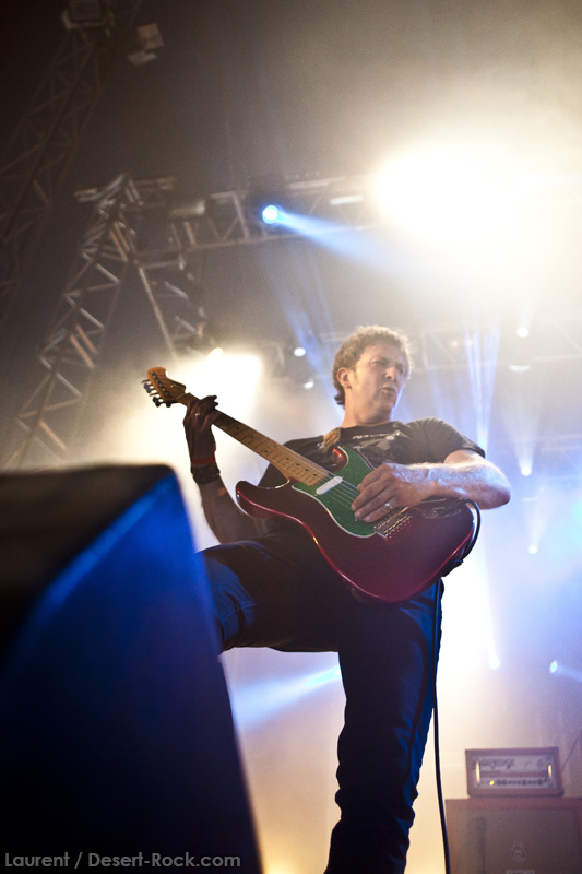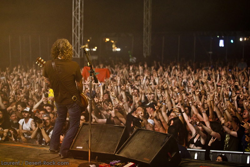 Disons-le tout net, la notoriété de MONSTER MAGNET n’atteint pas celle de Clutch vis-à-vis d’un large public rock / hard rock. Le quintette Est-Américain voit donc une ambiance plus apaisée installée dans son public, dans une tente néanmoins bien garnie. Et là aussi, s’il est dit quelque part dans les Dix Commandements du concert rock que le premier morceau donne la tonalité d’un set, alors en balançant « Superjudge » en intro, l’aimant monstrueux ne joue pas la facilité et laisse présager une ambiance space rock affirmée. Ambiance confirmée par le voluptueux mais épais brouillard qui envahit la scène sur toute la durée du set, fumée dans laquelle se distinguent à peine les silhouettes de nos cinq lascars. On se prend à détecter les prémices d’une set list de puristes alors que suivent « Medicine » et le classieux et trippant « Nod Scene ». Frissons, alors que s’enchaînent encore quelques vieux classiques (« Dopes… », « Twin Earth »…). Scéniquement, on peut le dire, le groupe est « at the top of their game », tout le monde est impeccable, et Wyndorf est impérial : vocaux sans failles, posture de frontman assumée, il est en forme et même souriant ! Les autres sont impeccables d’interprétation et de prestance, rien à redire, y compris Garrett Sweeny, qui confirme tout le bien que l’on pense de lui, qu’il s’agisse de ses leads incandescentes ou de ses rythmiques robustes. On était plus curieux de voir le remplaçant du puissant Jim Baglino à la basse, qui en son temps transmettait une énergie scénique appréciable. Son successeur est Chris Kosnik, le bassiste de… The Atomic Bitchwax (ça devient limite incestueux leurs conneries…). Sur scène, c’est le jour et la nuit : Kosnik est calé en fond de scène contre son ampli, et joue ses parties (impeccablement) en regardant ses collègues ou le bord de scène. Heureusement les autres maintiennent l’attention d’un public en état de semi-hypnose. Les surprises continuent à défiler sur scène, avec maintenant le puissant « Look to your Orb for the Warning ». Le set est immersif, efficace, et ne laisse pas au public l’occasion d’atterrir pour reprendre ses esprits même quelques minutes… Pris du même vertige, on s’aperçoit petit à petit qu’aucun des titres joués jusqu’ici n’a moins de… dix-huit ans ! N’étaient-ils pas supposés promouvoir leur dernier album, le superbe « Last Patrol » sorti il y a quelques mois à peine ? Quelle démarche commercialement suicidaire ! Pas stupides non plus, le groupe enquille en conclusion les traditionnels « Powertrip » et « Spacelord » (qui ont quand même plus de seize ans, pas non plus des titres très récents !). Succès garanti sur ces morceaux, qui laissent un public d’afficionados et de nouveaux convaincus exsangues, béats, qui planent un petit moment encore après le set dans une Valley qui prend quelques minutes pour atterrir et reprendre ses esprits… En voyant Dave Wyndorf quitter la scène fier comme un pape et avec un sourire jusqu’aux oreilles, on peut confirmer que ce sentiment du devoir (bien) accompli est assez unanimement partagé ce soir.