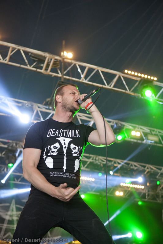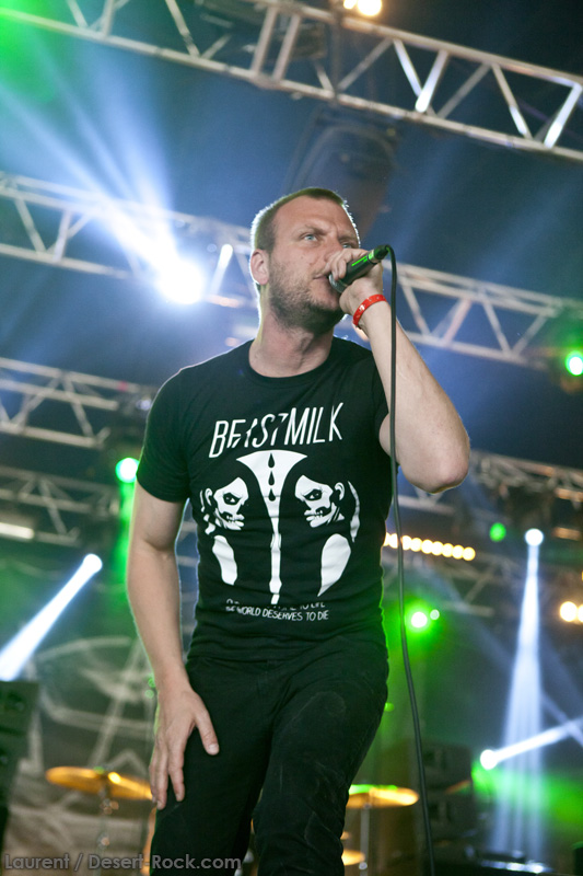 Vient alors le tour des hollandais de HERDER qui déboulent le couteau entre les dents pour une demi-heure de gros sludge tendance metal, voire hardcore parfois, ou post-core même comme disent les jeunes, occasionnellement baigné de quelques vapeurs doom. Venus défendre leur récent dernier album, « Gods », ils n’en joueront finalement que trois ou quatre extraits (dont le dévastateur morceau titre) sur un set d’une grosse dizaine de morceaux joués à cent à l’heure. De temps en temps, leur vocaliste adressera quelques mots au public, en français notamment, mais le reste du temps est mis à profit pour développer leur petit commerce de charcuterie fine. Et là-dessus, vous pouvez compter sur le vocaliste Ché Snelting pour mettre du cœur à l’ouvrage : le bonhomme vomit ses tripes avec une vigueur qui force le respect : il beugle fort, certes, mais le batave hurlant possède aussi un coffre singulier, apportant quelque profondeur à ses vocalises. Un point commun qu’il partage avec l’ancien beugleur du combo, Nico, invité sur scène pour interpréter le terrifiant « Feet Eager To Run To Evil » avec ses anciens acolytes. Bon esprit ! Au final, un concert qui déboîte bien, mais peut-être pas ce que mon cerveau était prêt à digérer à ce moment-là de la journée…