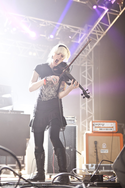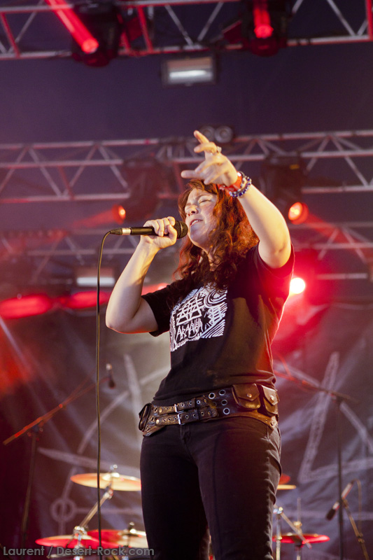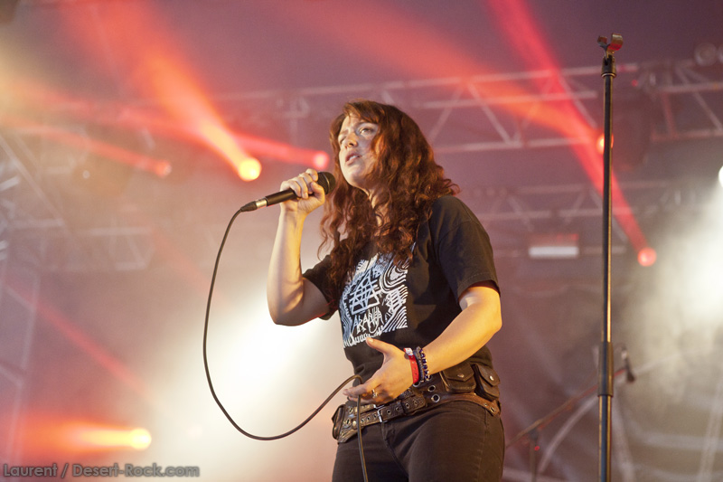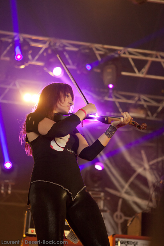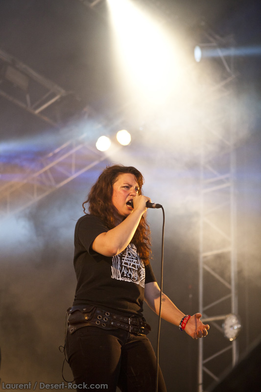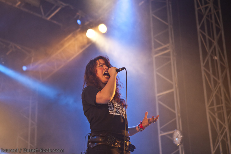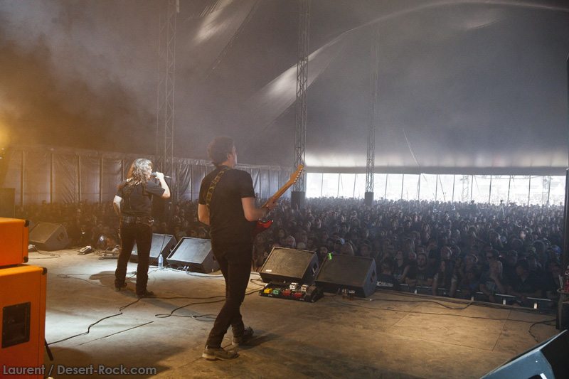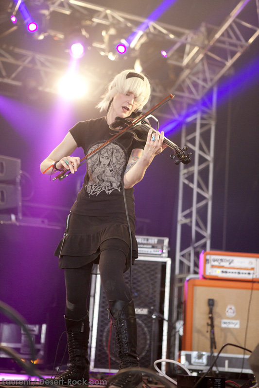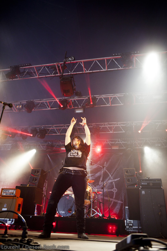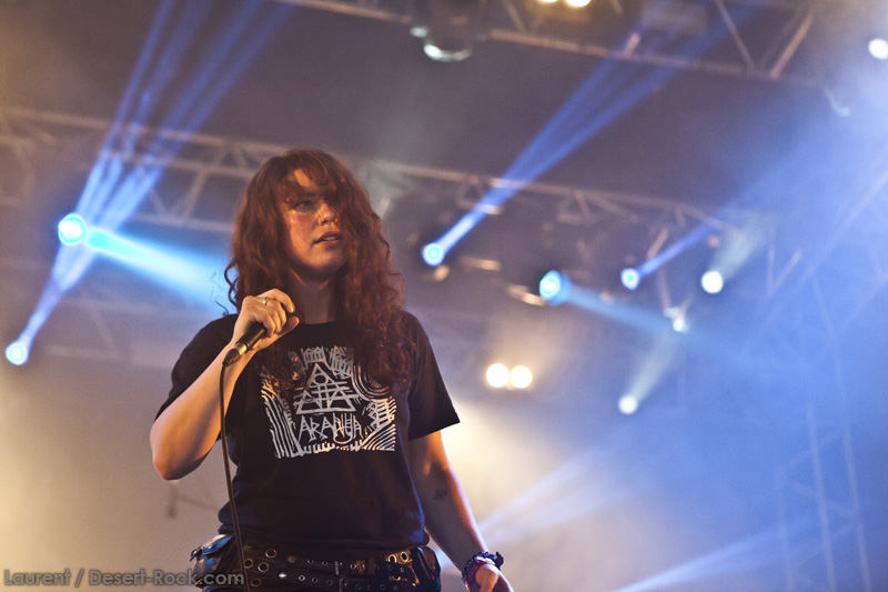 Le contraste musical avec SUBROSA qui passe juste après fait un peu mal, avouons-le. Le doom-metal quasi-lyrique du combo largement féminin est par essence plus froid, plus policé et parfois même « synthétique » (ah, cette paire de violons électriques, c’est un peu comme des synthétiseurs… faut aimer !). Pourtant, le combo ne démérite pas et jette toutes ses armes dans la bataille : l’énergie est là et l’ambiance développée sur album est bien restituée (voir l’épique « The Usher » issu de leur dernier album). On pourra avoir des réserves sur les vocaux de Rebecca Vernon, dont les passages les plus graves sonnent presque faux, mais c’est une question d’oreille (la mienne est visiblement plus habituée au sable et au son de gratte craspec). Reste que l’expérience musicale délivrée par le quintette est assez inédite : le genre musical adopté est original, composé de longues séquences où Rebecca à la gratte et Levi à la basse font tourner de gros riffs lancinants, laissant à la paire de violonistes l’occasion de s’engager dans des envolées en harmonie généralement bien amenées. Ca se laisse écouter sans déplaisir, et force est de constater que le public est bien dedans, headbanguant au rythme (lent) des morceaux, et applaudissant copieusement la fin du set des américains (terminé cinq minutes plus tôt, ce qui s’avère piégeux pour un groupe dont la durée moyenne des chansons est au dessus des dix minutes…). Sympa, mais pas complètement enthousiasmant.