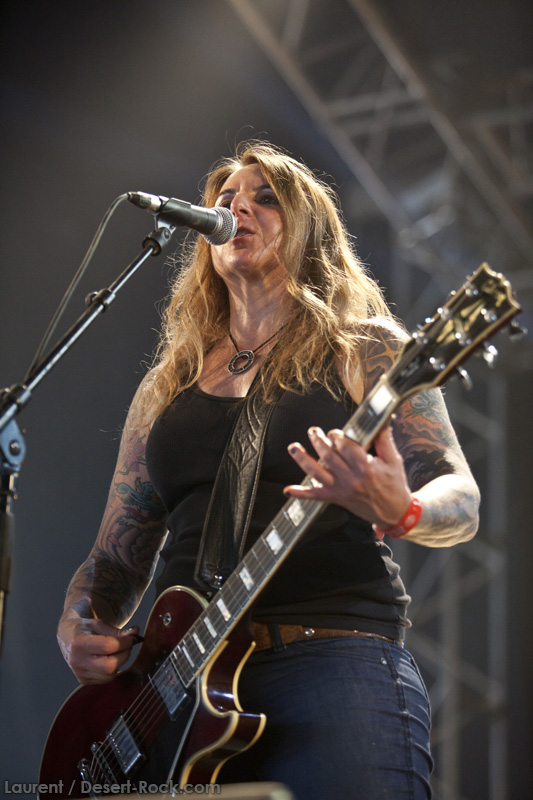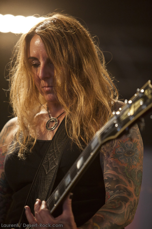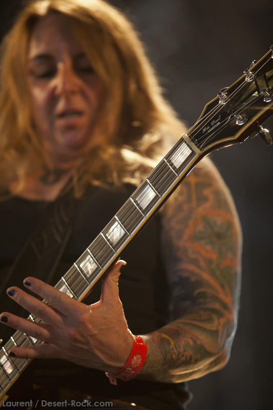Lori et ses copains d’ACID KING traînent sur le site du Hellfest depuis la veille, l’occasion de mater quelques concerts et de prendre la température du lieu… Ils ont donc eu tout le temps de se préparer. Et pourtant, à l’heure précise du début de leur set… il n’y a personne sur scène ! Joey Osbourne se calle derrière sa batterie, Mark Lamb s’empare de sa basse, et tout le monde regarde backstage pour chercher Lori du regard ! Petit mouvement de panique donc, avant que Lori, se précipitant sur scène, n’engage l’intro de « Busse Woods ». Mais ce petit aléa devient vite anecdotique alors que la blonde guitariste enquille les riffs patauds de ce classique instrumental. A partir de ce moment, la démonstration doom peut commencer. Faut dire que le trio a soufflé ses vingt printemps récemment, et même si sa carrière avance au même tempo que ses rythmiques anémiques, leur expérience scénique et la robustesse de leur interprétation ne souffrent simplement aucune critique. Alors que le combo enchaîne avec le superbe riff de « 2 Wheel Nation », les nuques commencent à onduler nonchalamment dans le public, de manière presque incontrôlée… Lori est alors bien calée derrière son pied de micro, alternant lignes de chant hypnotiques et attaques de cordes lourdes et viscérales. Elle n’est pas Joe Satriani et elle le sait ; mais en enchaînant une poignée d’accords par chanson, au bon rythme et avec la bonne énergie, elle parvient en quelques minutes à convaincre un public qui prend là sa troisième rasade doom de l’après-midi. Faut voir ledit public enchaîner les slams sur toute la durée du set, propices à se laisser voguer sur la mer de mains créée par une Valley en transe… Osbourne est toujours efficace derrière les fûts, caressant crash et ride entre des frappes lourdes sur ses fûts, tandis que Mark Lamb est complètement immergé dans son set, efficace pour dresser des rythmiques plombées, et agrémentant son jeu de basse solide de quelques effets type Wah-Wah parfaitement bienvenus. Au final, le groupe ne jouera que des extraits de « Busse Woods » et « III », et glisse dans son set un ou deux inédits (du pur Acid King, si les fans ont besoin d’être rassurés…). Pas une claque énorme pour qui connaît Acid King, mais encore une performance solide et efficace à mettre à leur actif.