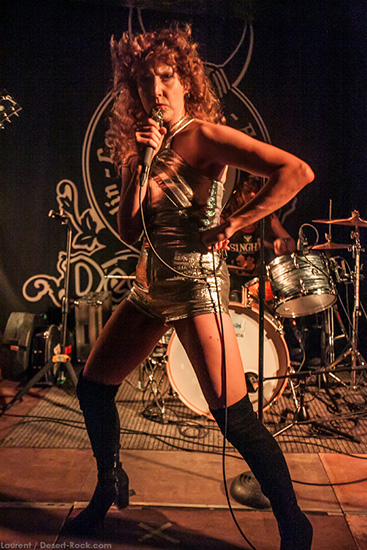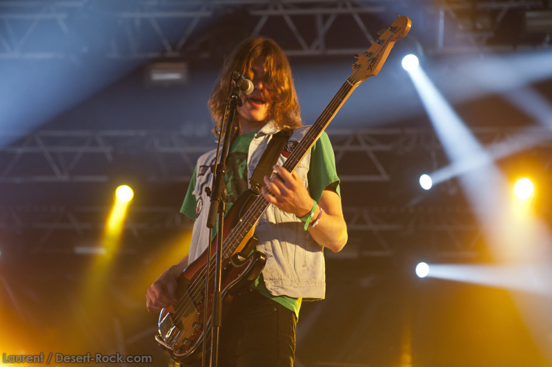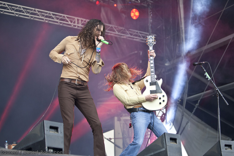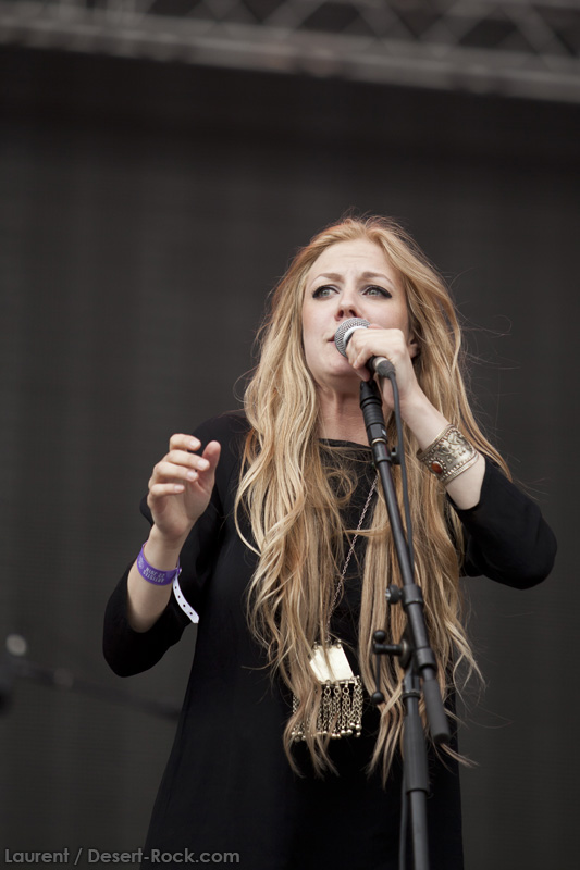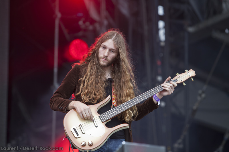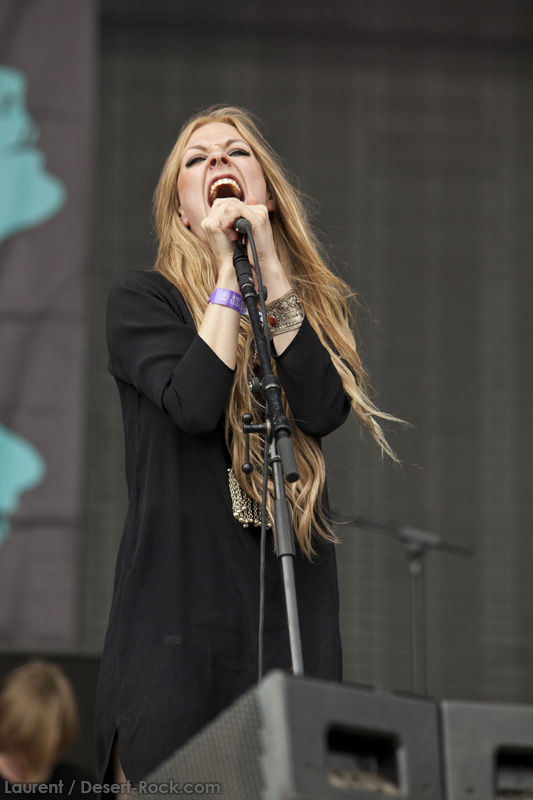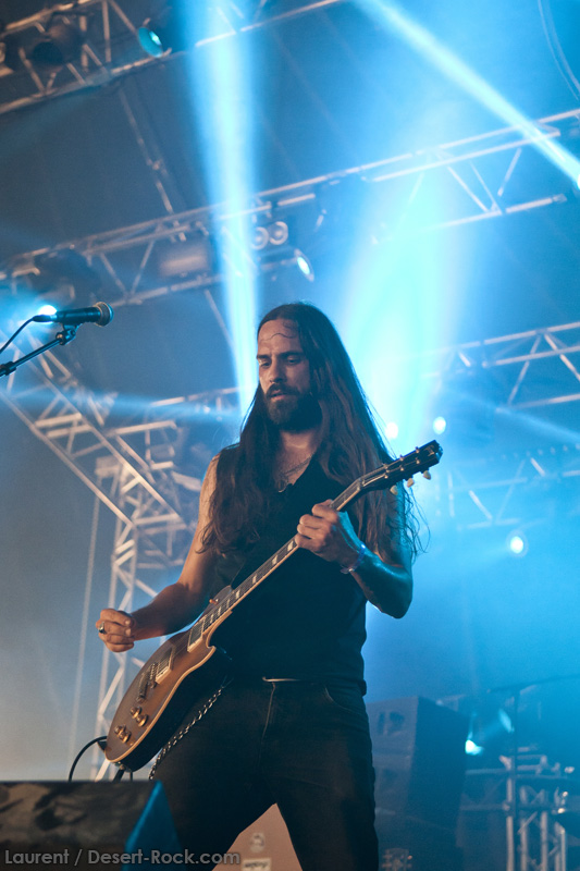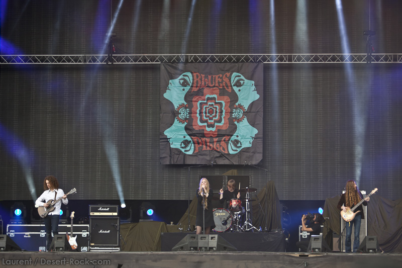 Par contre, mauvais départ, on rate Year Of The Goat sur la Main stage n°2 en « début de matinée » (10h30)… Damned ! On rattrape ce faux pas en assistant au concert des suédois (OK, moitié suédois) de BLUES PILLS sur… la Main stage n°1 !! On savait le groupe en phase de carrière ascendante, et sa récente tournée (prévisionnelle car interrompue au milieu), très ambitieuse, montrait leur envie d’accélérer cet état de fait. Mais nous faire regarder un concert à la lumière du jour, alors qu’on a passé deux jours sous une tente, c’est cruel ! Toujours est-il que Blues Pills… fait du Blues Pills ! Le quatuor d’émanation très 60’s/70’s tendance psyche et blues, déroule des titres carrés, assez longs, à l’exécution impeccable. Difficile donc d’opposer des critiques objectives par rapport à leur musique : obligés de constater que les zicos assurent (ce jeune soliste frenchie est quand même doué), obligés aussi de reconnaître qu’Elin a une voix absolument remarquable. Notons aussi que pour commencer un festival à onze heures du mat, leur musique accompagne parfaitement une montée en pression assez tranquille. Merci pour tout ça, respect. Mais pour le reste, et même si le public semble apprécier (enfin, c’est pas comme si ça pogotait non plus, hein… le public reste assez cool et clairsemé à cette heure…), tout ça manque cruellement d’énergie et de gras : les tempi s’emballent bien trop rarement, le son de gratte est désespérément clair… Allez, même si ce n’est pas très politiquement correct de le dire ouvertement tandis que tous les médias commencent à encenser le groupe, mais on n’a jamais eu peur d’être à contre-courant : on s’ennuie !…