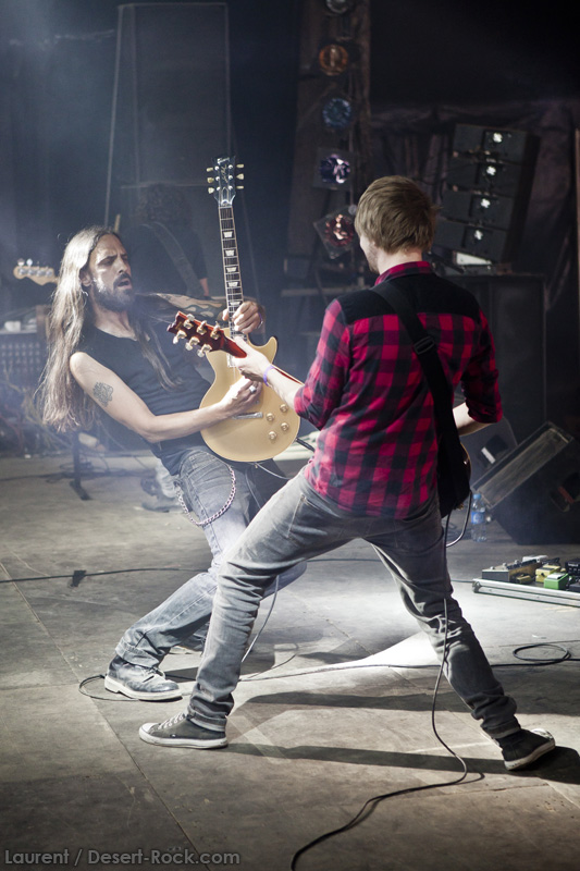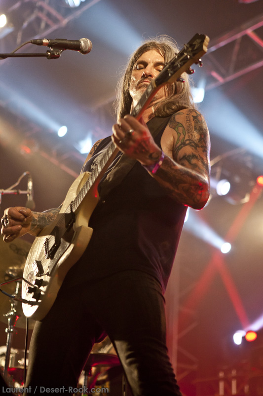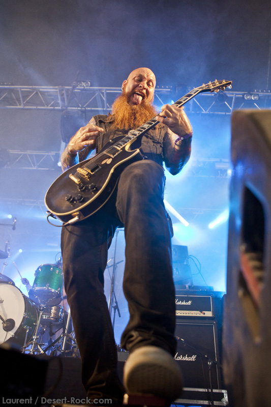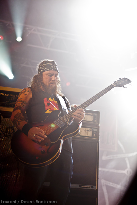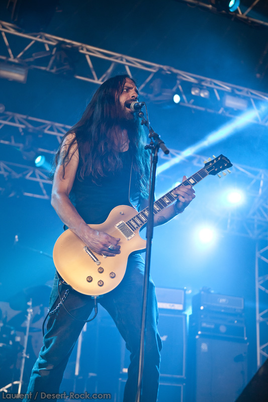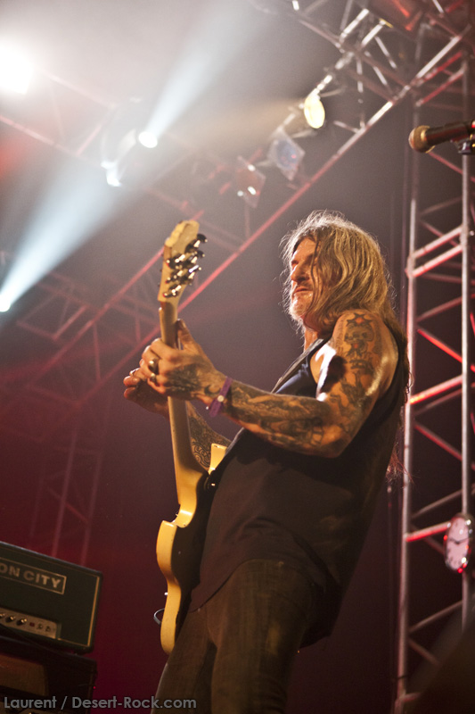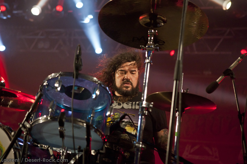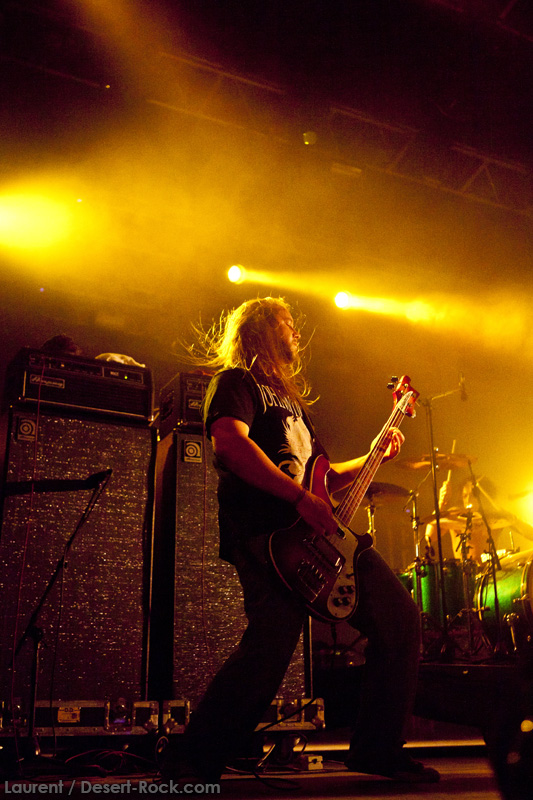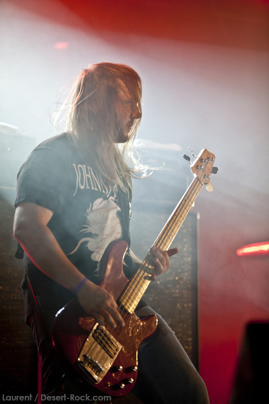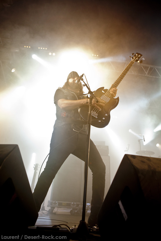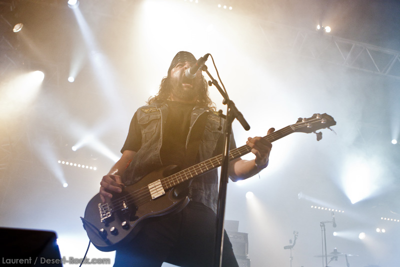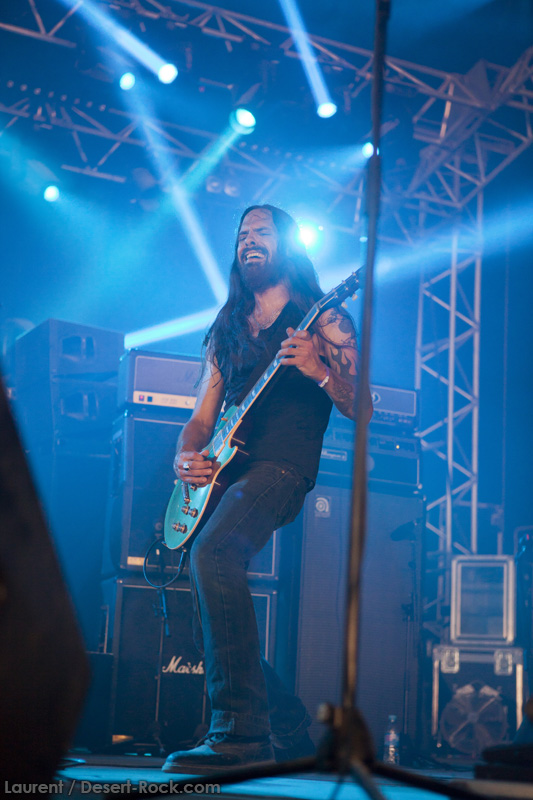 Après le set « over the top » des ricains, on sait par avance que la deuxième livraison suédoise de la soirée sera scéniquement un peu plus austère. On a papoté un peu avec Tommi, le leader de DOZER un peu avant leur set aujourd’hui, un gars posé, calme, gentil… Alors quand on le voit monter sur scène complètement déchaîné, faisant voler sa traditionnelle casquette dès le premier headbang de « Feelgood Formula » qui introduit le concert, on comprend quand même que les scandinaves ne sont pas venus que pour se détendre non plus. A son habitude, la prestation de Dozer sera aujourd’hui encore impeccable : une set list de tueur, une interprétation sans faille, des musiciens en ordre de bataille… La set list, parlons-en : encore une fois le paquet est mis sur l’album « Through The Eyes of Heathens » avec notamment des interprétations énormes de classiques comme « Big Sky Theory », l’aérien « Until Man Exists No More » ou le brutal « From Fire Fell ». Mais tous les albums seront honorés de quelques extraits (avec un seul extrait de leur dernière production), une sorte de petit best of. Faut dire que le groupe sait ce pour quoi il est attendu, et à ce titre il fait montre d’une belle générosité envers son public. Sur scène, Fredrik assume pleinement son rôle de frontman : même si ses vocaux n’ont pas la profondeur qu’elles ont sur disque, il n’est jamais en difficulté et assure impeccablement toutes ses lig « Fishermnes vocales (est-ce dû au fait que le bonhomme se gave de bonbons « Fisherman’s Wharf »… pendant tout le concert ?!). Rien à dire sur ses rythmiques, épaulées par les lignes de basse robustes de Johan. Quant à Tommi, il est juste à fond, il headbangue come un furieux, virevolte, harangue le public… Bref, le groupe fait tout ce qu’il faut pour assurer un concert impeccable, et mettre à l’honneur la qualité de leurs compos plutôt qu’eux-mêmes en tant qu’individus, se mettant au service d’un collectif parfaitement rôdé. Encore et toujours une machine scénique impressionnante, qui ne laisse rien au hasard. Tandis que le combo termine son set par le vieux classique « Supersoul », on se dit quand même que la trop rare activité scénique du combo représente un vrai gâchis. On se félicite d’autant d’avoir pu revoir les suédois sur un concert de cette qualité.