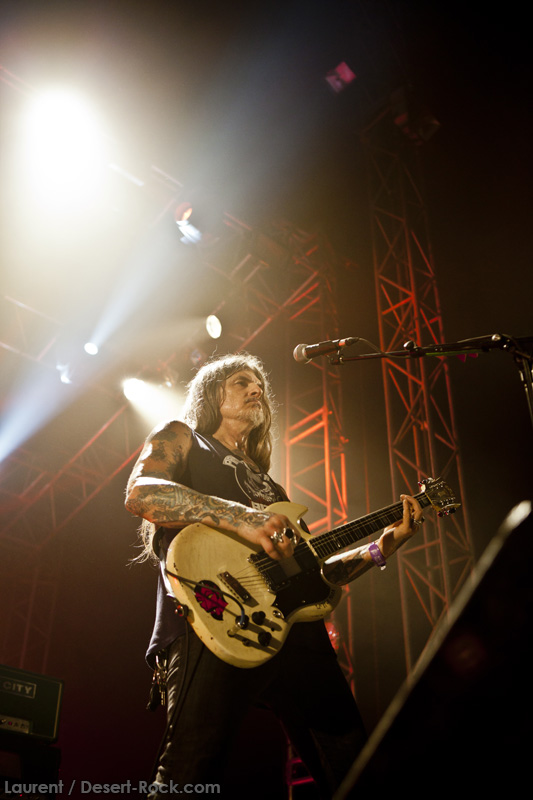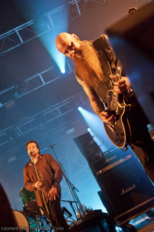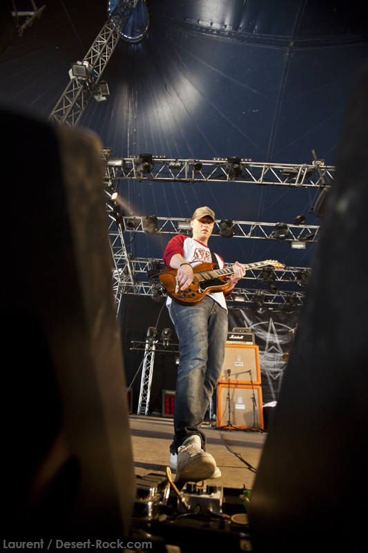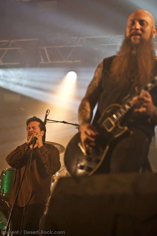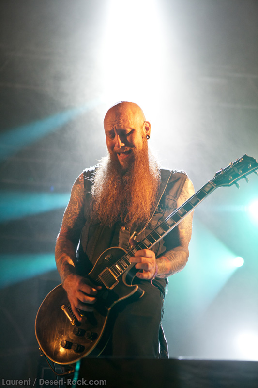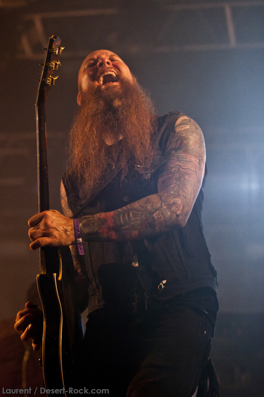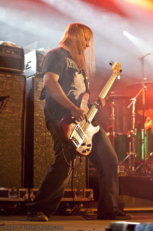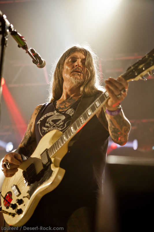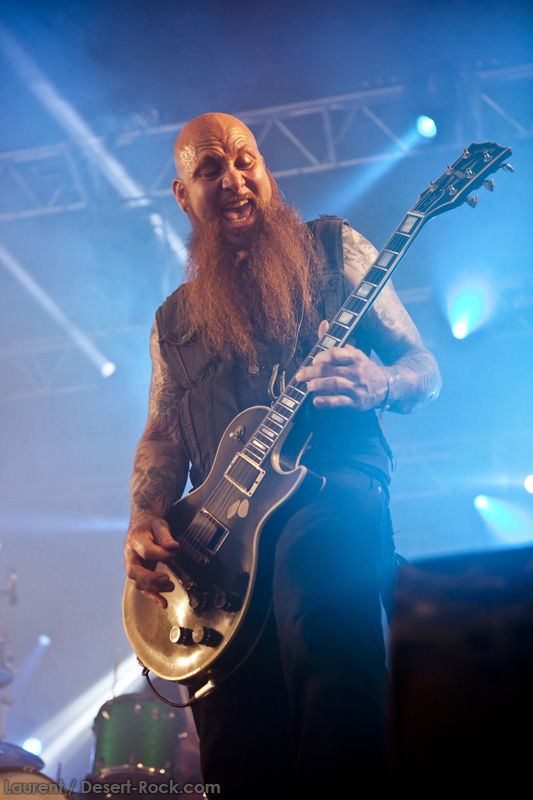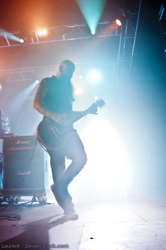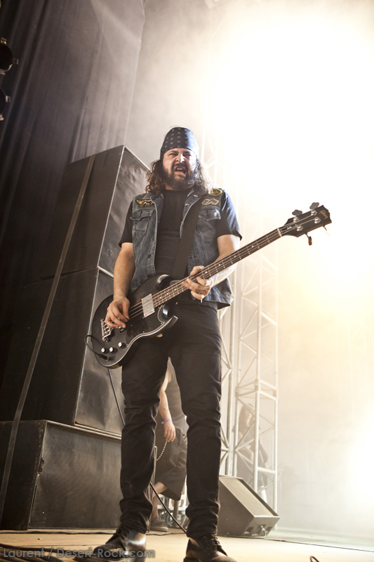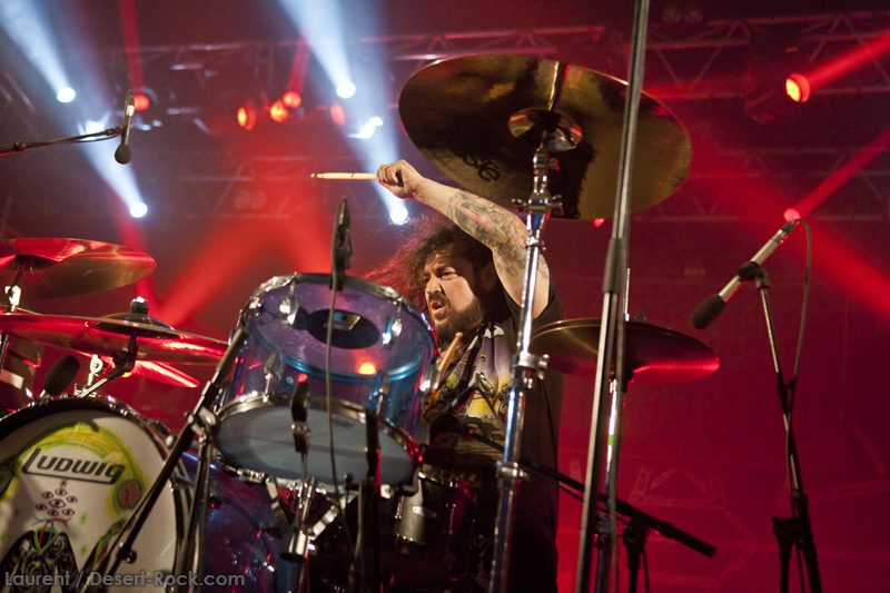 Après le set « over the top » des ricains, on sait par avance que la deuxième livraison suédoise de la soirée sera scéniquement un peu plus austère. On a papoté un peu avec Tommi, le leader de DOZER un peu avant leur set aujourd’hui, un gars posé, calme, gentil… Alors quand on le voit monter sur scène complètement déchaîné, faisant voler sa traditionnelle casquette dès le premier headbang de « Feelgood Formula » qui introduit le concert, on comprend quand même que les scandinaves ne sont pas venus que pour se détendre non plus. A son habitude, la prestation de Dozer sera aujourd’hui encore impeccable : une set list de tueur, une interprétation sans faille, des musiciens en ordre de bataille… La set list, parlons-en : encore une fois le paquet est mis sur l’album « Through The Eyes of Heathens » avec notamment des interprétations énormes de classiques comme « Big Sky Theory », l’aérien « Until Man Exists No More » ou le brutal « From Fire Fell ». Mais tous les albums seront honorés de quelques extraits (avec un seul extrait de leur dernière production), une sorte de petit best of. Faut dire que le groupe sait ce pour quoi il est attendu, et à ce titre il fait montre d’une belle générosité envers son public. Sur scène, Fredrik assume pleinement son rôle de frontman : même si ses vocaux n’ont pas la profondeur qu’elles ont sur disque, il n’est jamais en difficulté et assure impeccablement toutes ses lig « Fishermnes vocales (est-ce dû au fait que le bonhomme se gave de bonbons « Fisherman’s Wharf »… pendant tout le concert ?!). Rien à dire sur ses rythmiques, épaulées par les lignes de basse robustes de Johan. Quant à Tommi, il est juste à fond, il headbangue come un furieux, virevolte, harangue le public… Bref, le groupe fait tout ce qu’il faut pour assurer un concert impeccable, et mettre à l’honneur la qualité de leurs compos plutôt qu’eux-mêmes en tant qu’individus, se mettant au service d’un collectif parfaitement rôdé. Encore et toujours une machine scénique impressionnante, qui ne laisse rien au hasard. Tandis que le combo termine son set par le vieux classique « Supersoul », on se dit quand même que la trop rare activité scénique du combo représente un vrai gâchis. On se félicite d’autant d’avoir pu revoir les suédois sur un concert de cette qualité.