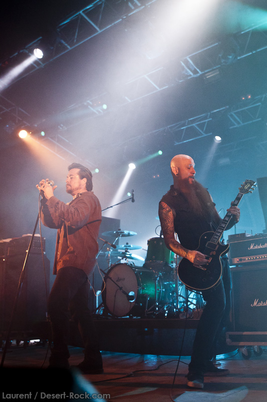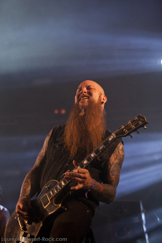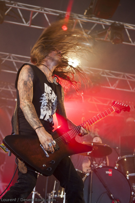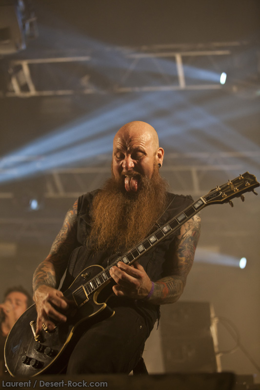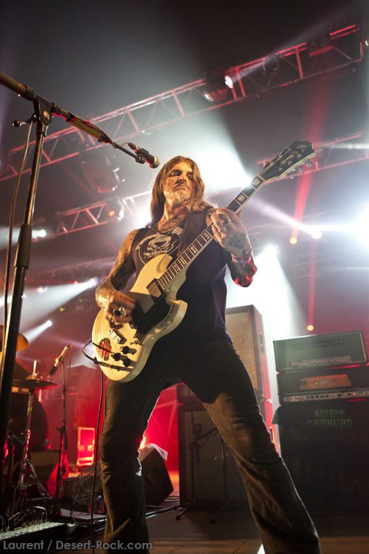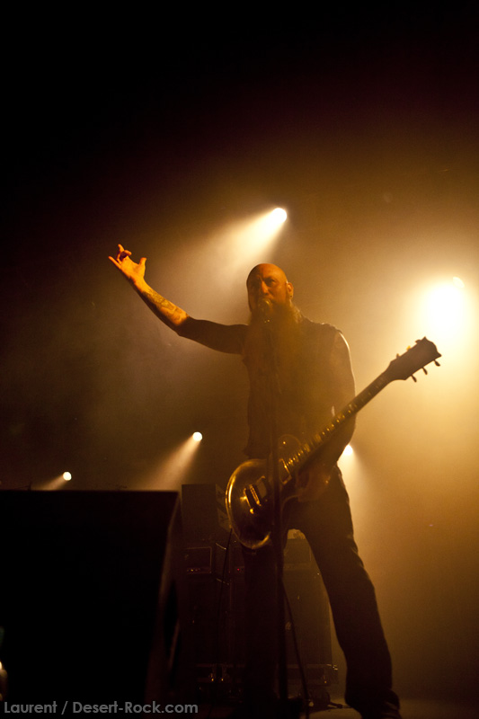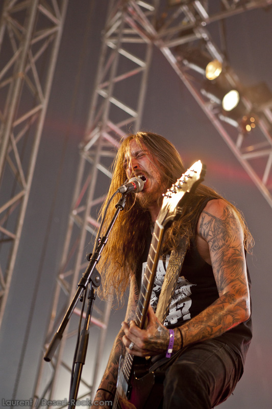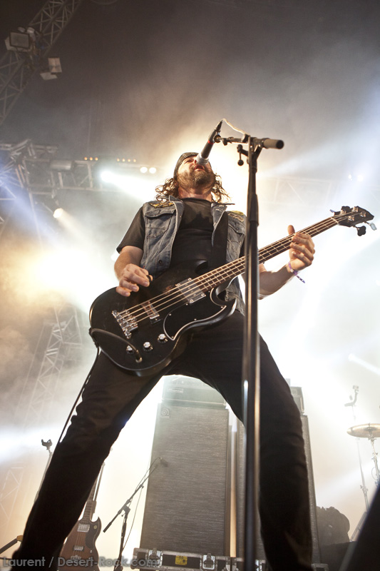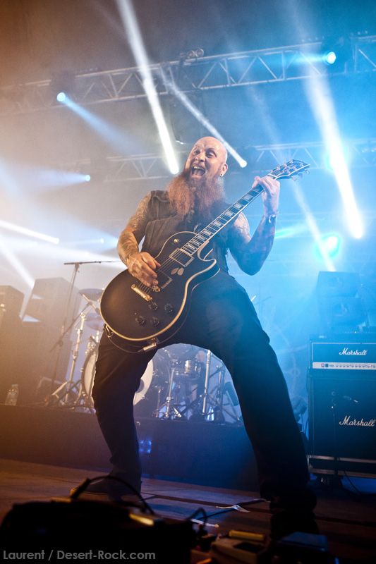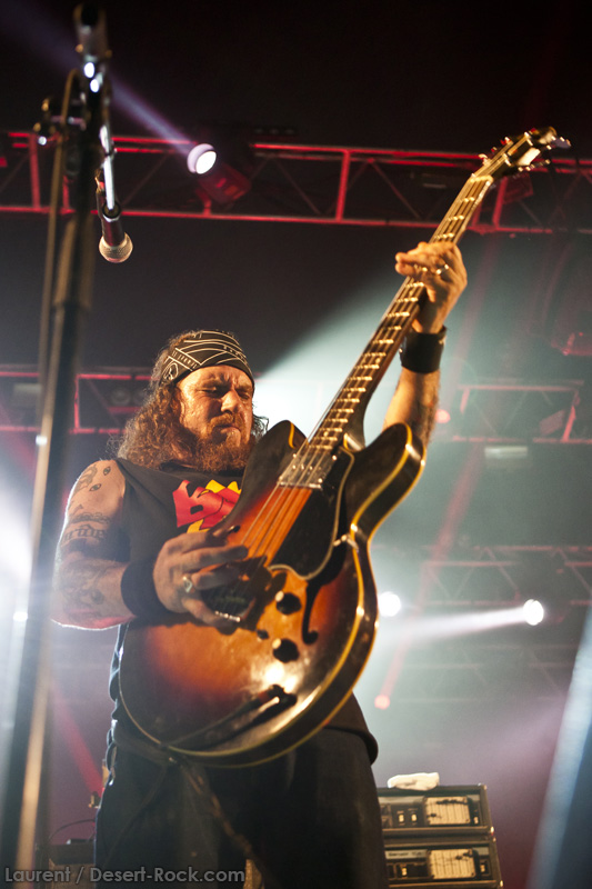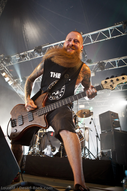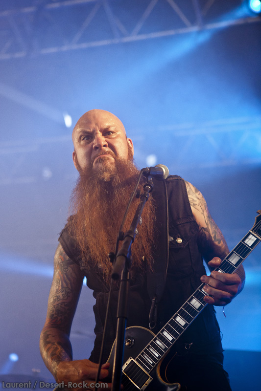 Après le set « over the top » des ricains, on sait par avance que la deuxième livraison suédoise de la soirée sera scéniquement un peu plus austère. On a papoté un peu avec Tommi, le leader de DOZER un peu avant leur set aujourd’hui, un gars posé, calme, gentil… Alors quand on le voit monter sur scène complètement déchaîné, faisant voler sa traditionnelle casquette dès le premier headbang de « Feelgood Formula » qui introduit le concert, on comprend quand même que les scandinaves ne sont pas venus que pour se détendre non plus. A son habitude, la prestation de Dozer sera aujourd’hui encore impeccable : une set list de tueur, une interprétation sans faille, des musiciens en ordre de bataille… La set list, parlons-en : encore une fois le paquet est mis sur l’album « Through The Eyes of Heathens » avec notamment des interprétations énormes de classiques comme « Big Sky Theory », l’aérien « Until Man Exists No More » ou le brutal « From Fire Fell ». Mais tous les albums seront honorés de quelques extraits (avec un seul extrait de leur dernière production), une sorte de petit best of. Faut dire que le groupe sait ce pour quoi il est attendu, et à ce titre il fait montre d’une belle générosité envers son public. Sur scène, Fredrik assume pleinement son rôle de frontman : même si ses vocaux n’ont pas la profondeur qu’elles ont sur disque, il n’est jamais en difficulté et assure impeccablement toutes ses lig « Fishermnes vocales (est-ce dû au fait que le bonhomme se gave de bonbons « Fisherman’s Wharf »… pendant tout le concert ?!). Rien à dire sur ses rythmiques, épaulées par les lignes de basse robustes de Johan. Quant à Tommi, il est juste à fond, il headbangue come un furieux, virevolte, harangue le public… Bref, le groupe fait tout ce qu’il faut pour assurer un concert impeccable, et mettre à l’honneur la qualité de leurs compos plutôt qu’eux-mêmes en tant qu’individus, se mettant au service d’un collectif parfaitement rôdé. Encore et toujours une machine scénique impressionnante, qui ne laisse rien au hasard. Tandis que le combo termine son set par le vieux classique « Supersoul », on se dit quand même que la trop rare activité scénique du combo représente un vrai gâchis. On se félicite d’autant d’avoir pu revoir les suédois sur un concert de cette qualité.