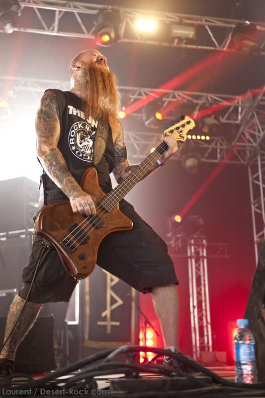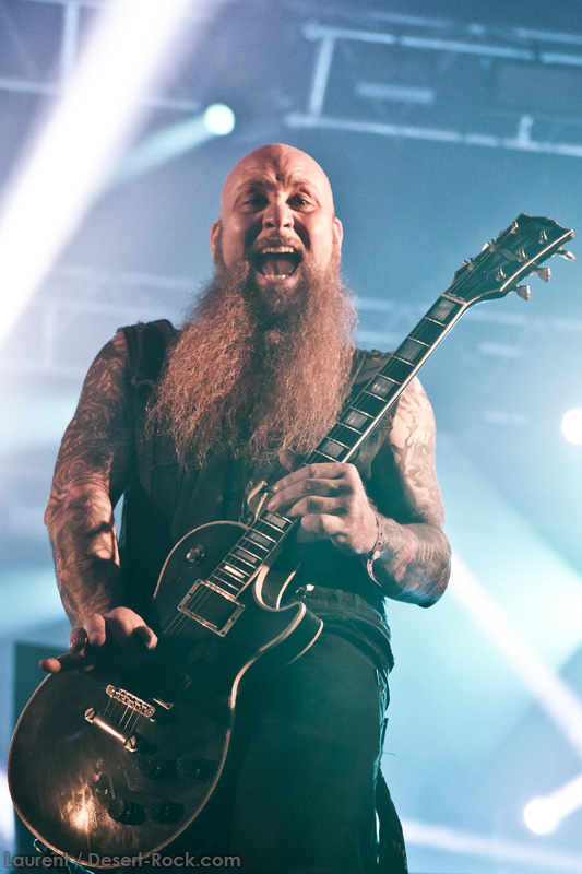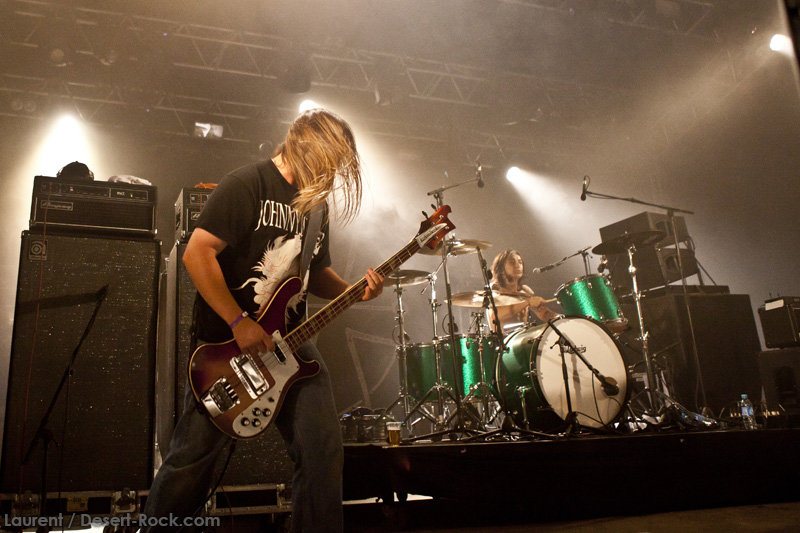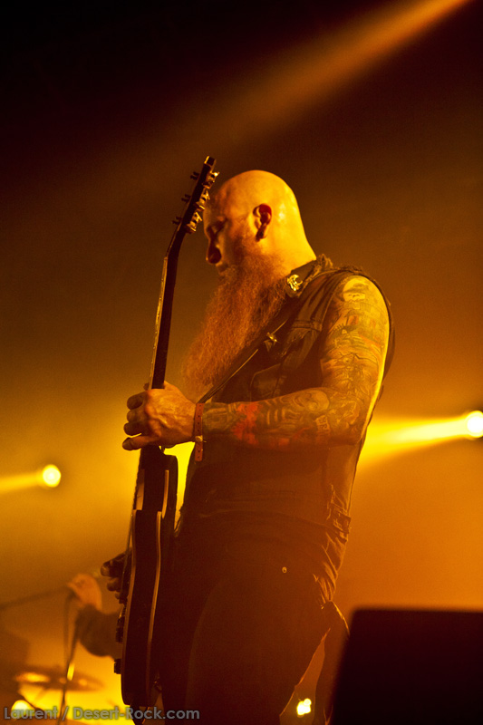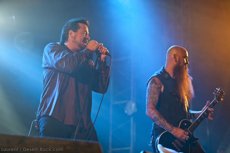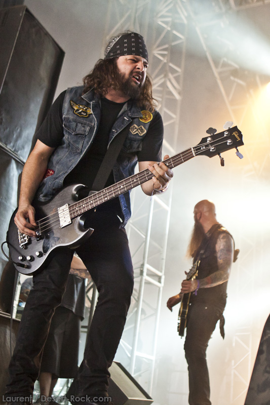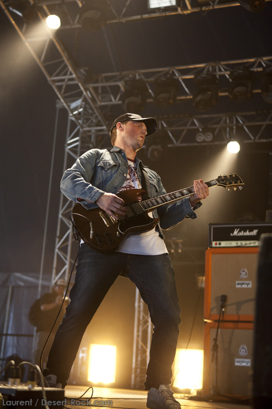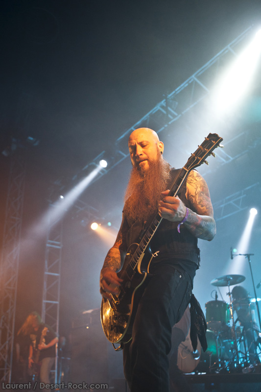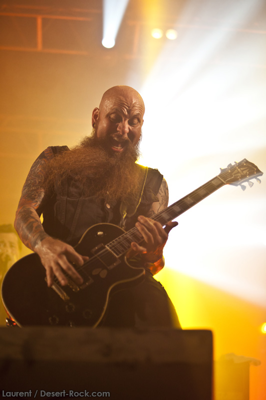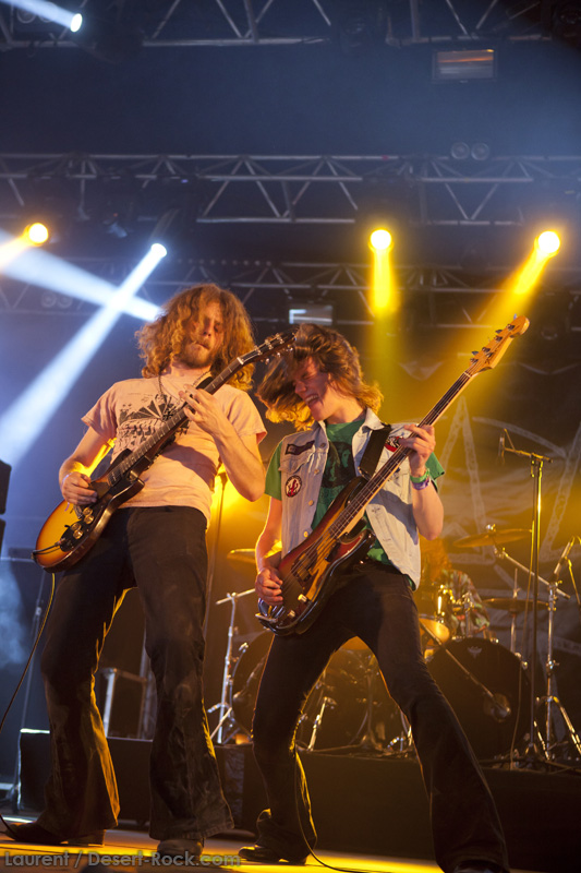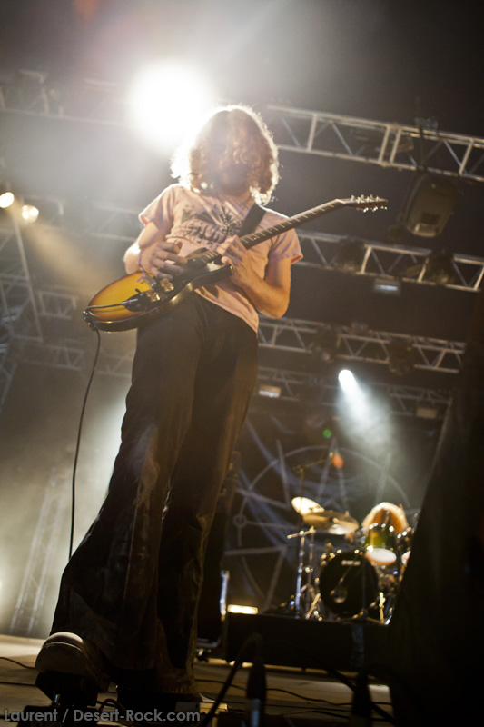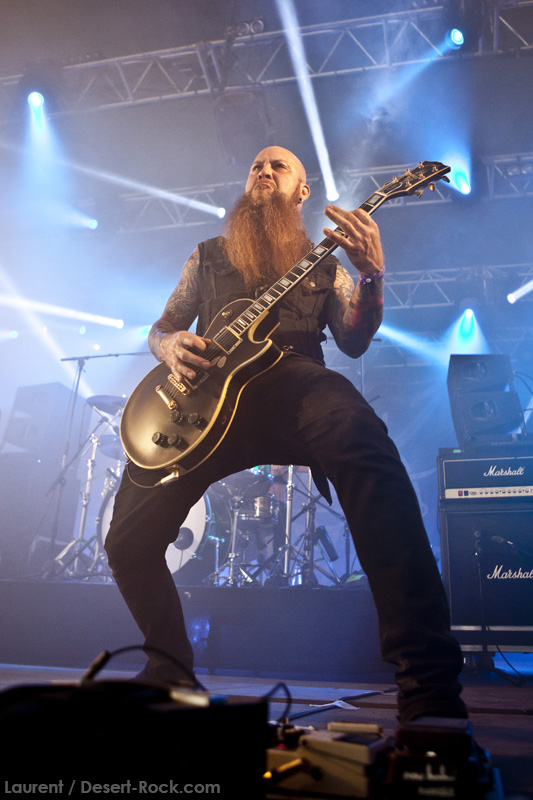 Après le set « over the top » des ricains, on sait par avance que la deuxième livraison suédoise de la soirée sera scéniquement un peu plus austère. On a papoté un peu avec Tommi, le leader de DOZER un peu avant leur set aujourd’hui, un gars posé, calme, gentil… Alors quand on le voit monter sur scène complètement déchaîné, faisant voler sa traditionnelle casquette dès le premier headbang de « Feelgood Formula » qui introduit le concert, on comprend quand même que les scandinaves ne sont pas venus que pour se détendre non plus. A son habitude, la prestation de Dozer sera aujourd’hui encore impeccable : une set list de tueur, une interprétation sans faille, des musiciens en ordre de bataille… La set list, parlons-en : encore une fois le paquet est mis sur l’album « Through The Eyes of Heathens » avec notamment des interprétations énormes de classiques comme « Big Sky Theory », l’aérien « Until Man Exists No More » ou le brutal « From Fire Fell ». Mais tous les albums seront honorés de quelques extraits (avec un seul extrait de leur dernière production), une sorte de petit best of. Faut dire que le groupe sait ce pour quoi il est attendu, et à ce titre il fait montre d’une belle générosité envers son public. Sur scène, Fredrik assume pleinement son rôle de frontman : même si ses vocaux n’ont pas la profondeur qu’elles ont sur disque, il n’est jamais en difficulté et assure impeccablement toutes ses lig « Fishermnes vocales (est-ce dû au fait que le bonhomme se gave de bonbons « Fisherman’s Wharf »… pendant tout le concert ?!). Rien à dire sur ses rythmiques, épaulées par les lignes de basse robustes de Johan. Quant à Tommi, il est juste à fond, il headbangue come un furieux, virevolte, harangue le public… Bref, le groupe fait tout ce qu’il faut pour assurer un concert impeccable, et mettre à l’honneur la qualité de leurs compos plutôt qu’eux-mêmes en tant qu’individus, se mettant au service d’un collectif parfaitement rôdé. Encore et toujours une machine scénique impressionnante, qui ne laisse rien au hasard. Tandis que le combo termine son set par le vieux classique « Supersoul », on se dit quand même que la trop rare activité scénique du combo représente un vrai gâchis. On se félicite d’autant d’avoir pu revoir les suédois sur un concert de cette qualité.