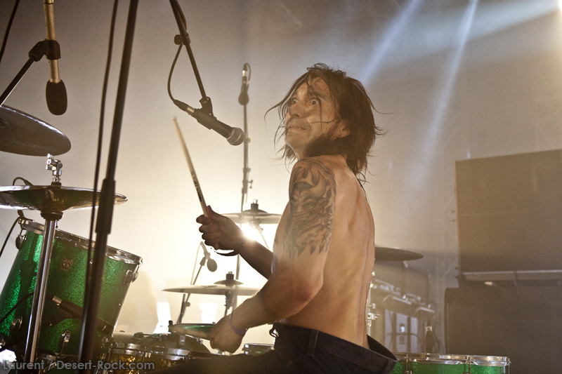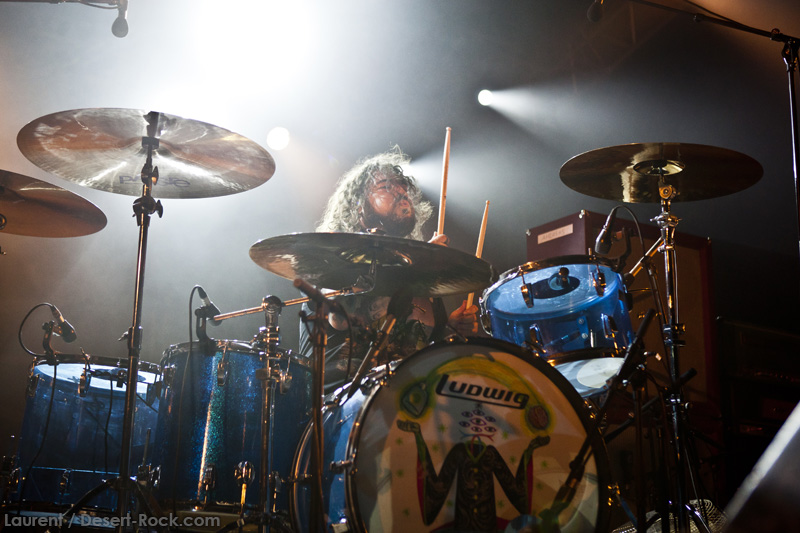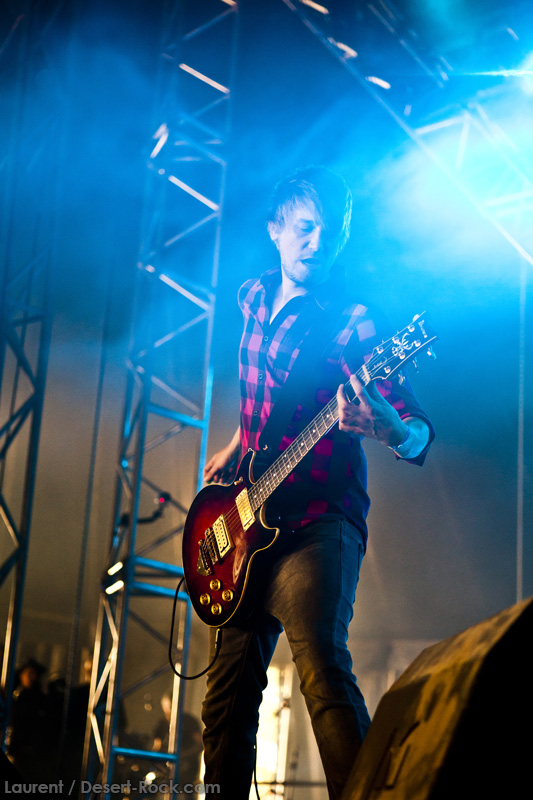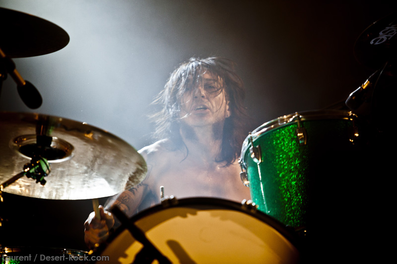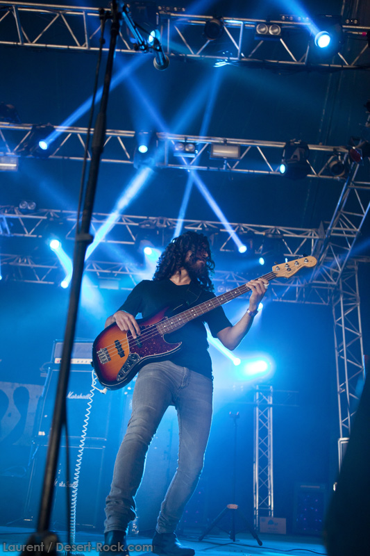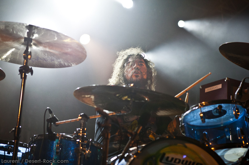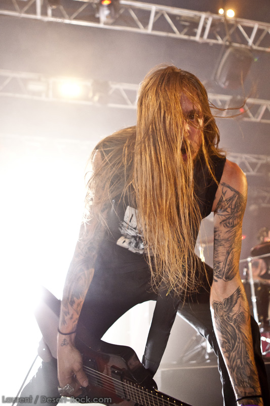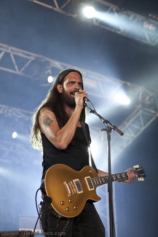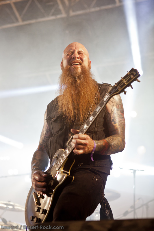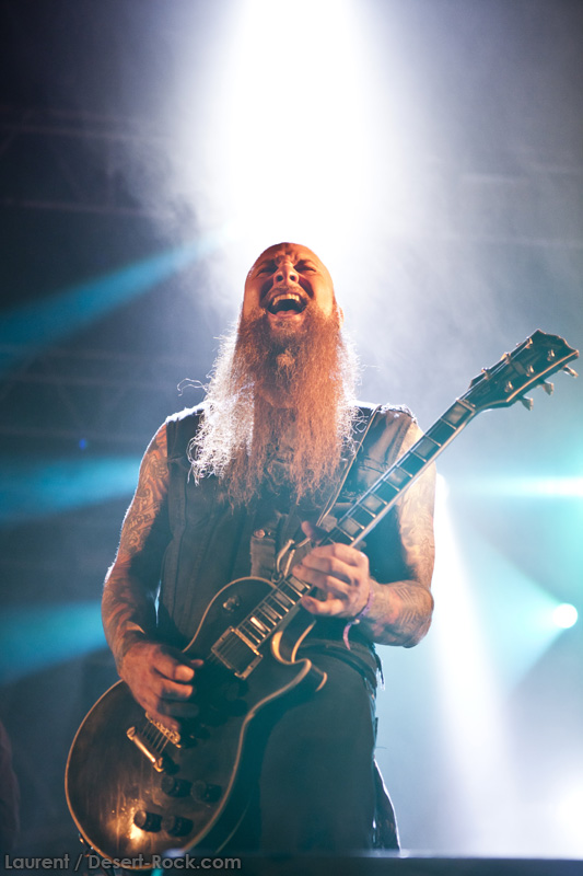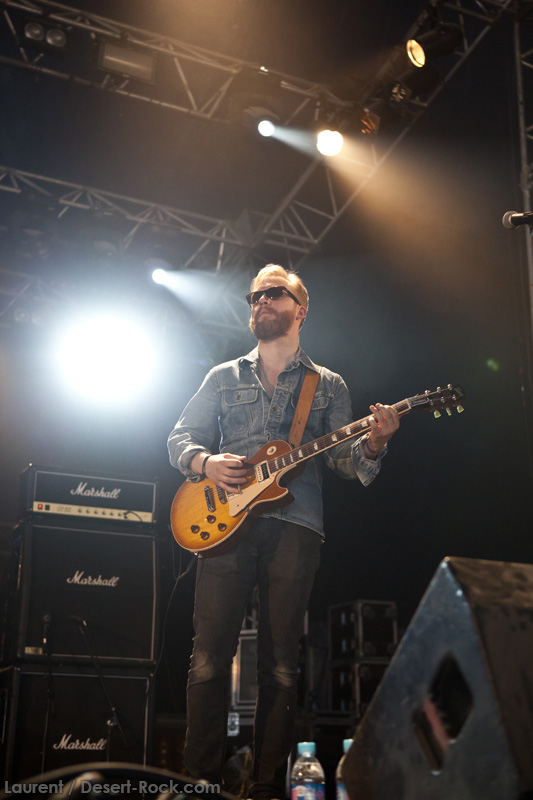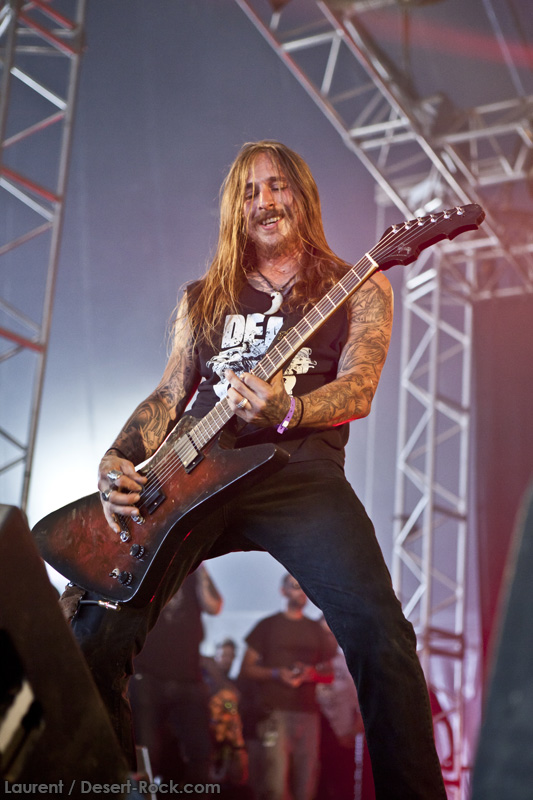 Après le set « over the top » des ricains, on sait par avance que la deuxième livraison suédoise de la soirée sera scéniquement un peu plus austère. On a papoté un peu avec Tommi, le leader de DOZER un peu avant leur set aujourd’hui, un gars posé, calme, gentil… Alors quand on le voit monter sur scène complètement déchaîné, faisant voler sa traditionnelle casquette dès le premier headbang de « Feelgood Formula » qui introduit le concert, on comprend quand même que les scandinaves ne sont pas venus que pour se détendre non plus. A son habitude, la prestation de Dozer sera aujourd’hui encore impeccable : une set list de tueur, une interprétation sans faille, des musiciens en ordre de bataille… La set list, parlons-en : encore une fois le paquet est mis sur l’album « Through The Eyes of Heathens » avec notamment des interprétations énormes de classiques comme « Big Sky Theory », l’aérien « Until Man Exists No More » ou le brutal « From Fire Fell ». Mais tous les albums seront honorés de quelques extraits (avec un seul extrait de leur dernière production), une sorte de petit best of. Faut dire que le groupe sait ce pour quoi il est attendu, et à ce titre il fait montre d’une belle générosité envers son public. Sur scène, Fredrik assume pleinement son rôle de frontman : même si ses vocaux n’ont pas la profondeur qu’elles ont sur disque, il n’est jamais en difficulté et assure impeccablement toutes ses lig « Fishermnes vocales (est-ce dû au fait que le bonhomme se gave de bonbons « Fisherman’s Wharf »… pendant tout le concert ?!). Rien à dire sur ses rythmiques, épaulées par les lignes de basse robustes de Johan. Quant à Tommi, il est juste à fond, il headbangue come un furieux, virevolte, harangue le public… Bref, le groupe fait tout ce qu’il faut pour assurer un concert impeccable, et mettre à l’honneur la qualité de leurs compos plutôt qu’eux-mêmes en tant qu’individus, se mettant au service d’un collectif parfaitement rôdé. Encore et toujours une machine scénique impressionnante, qui ne laisse rien au hasard. Tandis que le combo termine son set par le vieux classique « Supersoul », on se dit quand même que la trop rare activité scénique du combo représente un vrai gâchis. On se félicite d’autant d’avoir pu revoir les suédois sur un concert de cette qualité.