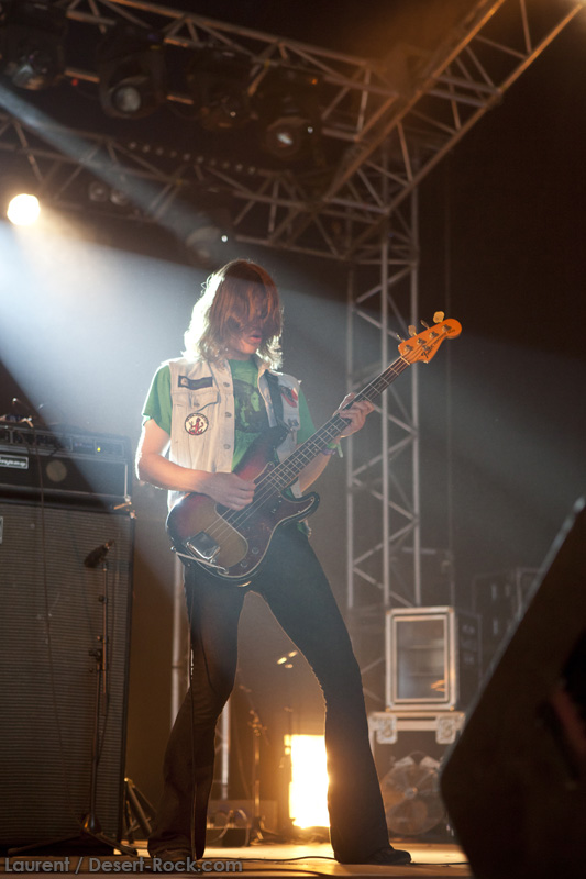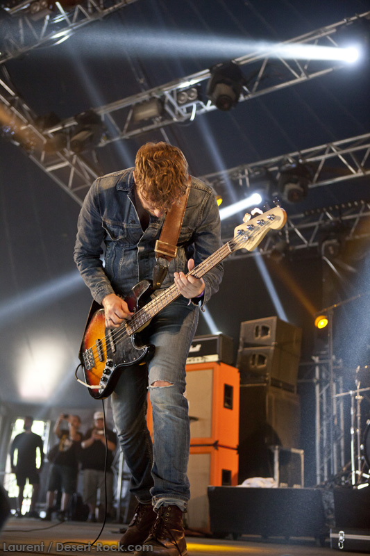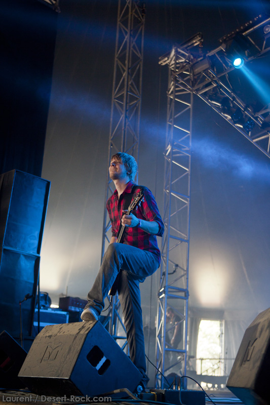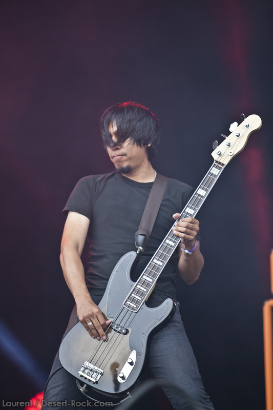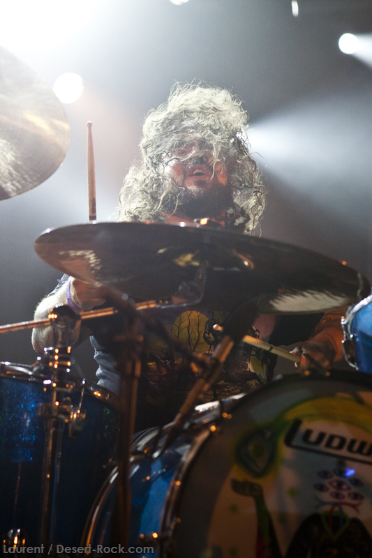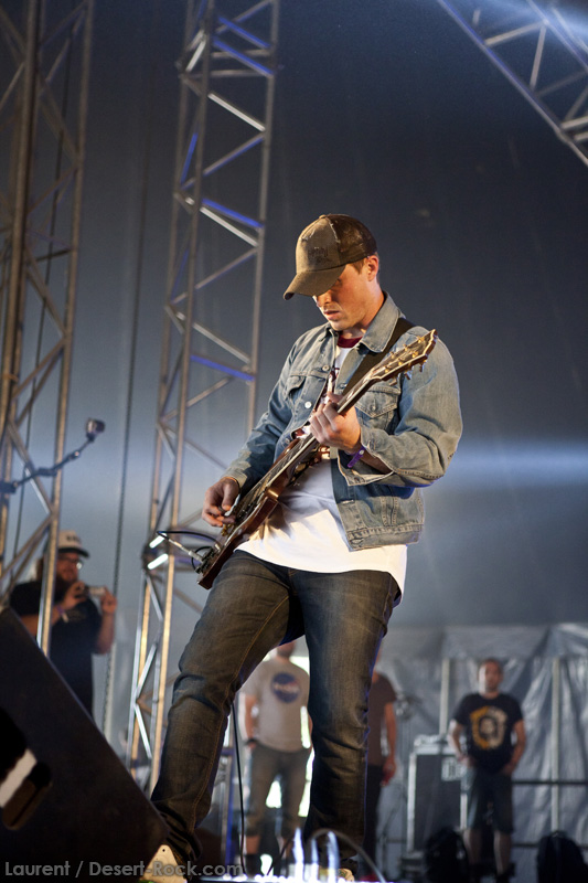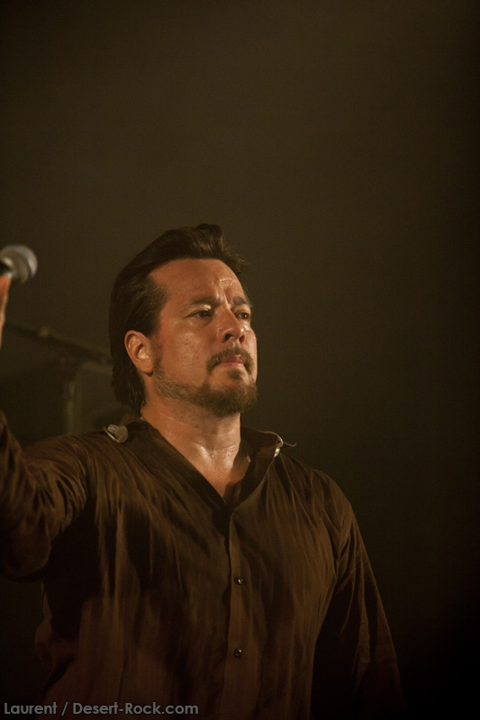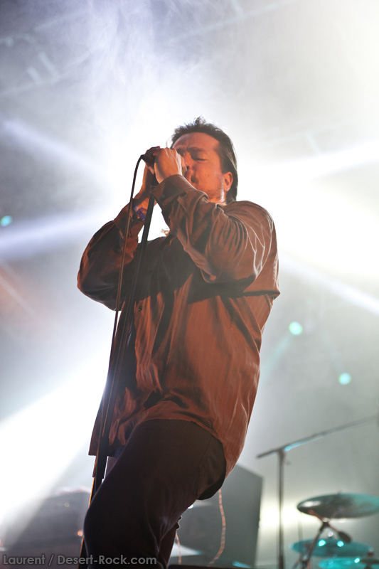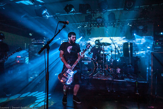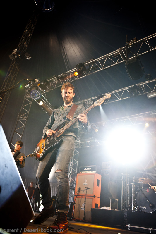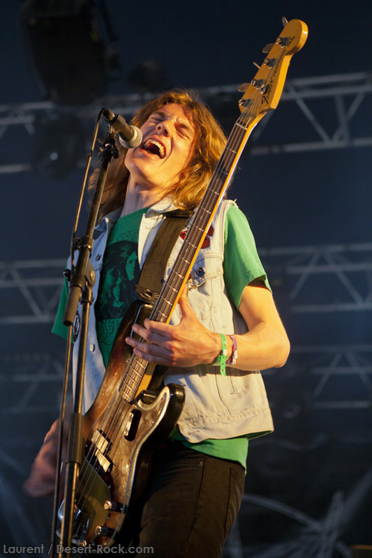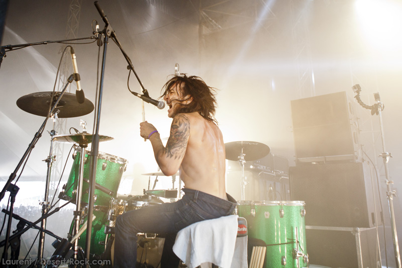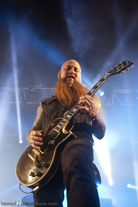 Après le set « over the top » des ricains, on sait par avance que la deuxième livraison suédoise de la soirée sera scéniquement un peu plus austère. On a papoté un peu avec Tommi, le leader de DOZER un peu avant leur set aujourd’hui, un gars posé, calme, gentil… Alors quand on le voit monter sur scène complètement déchaîné, faisant voler sa traditionnelle casquette dès le premier headbang de « Feelgood Formula » qui introduit le concert, on comprend quand même que les scandinaves ne sont pas venus que pour se détendre non plus. A son habitude, la prestation de Dozer sera aujourd’hui encore impeccable : une set list de tueur, une interprétation sans faille, des musiciens en ordre de bataille… La set list, parlons-en : encore une fois le paquet est mis sur l’album « Through The Eyes of Heathens » avec notamment des interprétations énormes de classiques comme « Big Sky Theory », l’aérien « Until Man Exists No More » ou le brutal « From Fire Fell ». Mais tous les albums seront honorés de quelques extraits (avec un seul extrait de leur dernière production), une sorte de petit best of. Faut dire que le groupe sait ce pour quoi il est attendu, et à ce titre il fait montre d’une belle générosité envers son public. Sur scène, Fredrik assume pleinement son rôle de frontman : même si ses vocaux n’ont pas la profondeur qu’elles ont sur disque, il n’est jamais en difficulté et assure impeccablement toutes ses lig « Fishermnes vocales (est-ce dû au fait que le bonhomme se gave de bonbons « Fisherman’s Wharf »… pendant tout le concert ?!). Rien à dire sur ses rythmiques, épaulées par les lignes de basse robustes de Johan. Quant à Tommi, il est juste à fond, il headbangue come un furieux, virevolte, harangue le public… Bref, le groupe fait tout ce qu’il faut pour assurer un concert impeccable, et mettre à l’honneur la qualité de leurs compos plutôt qu’eux-mêmes en tant qu’individus, se mettant au service d’un collectif parfaitement rôdé. Encore et toujours une machine scénique impressionnante, qui ne laisse rien au hasard. Tandis que le combo termine son set par le vieux classique « Supersoul », on se dit quand même que la trop rare activité scénique du combo représente un vrai gâchis. On se félicite d’autant d’avoir pu revoir les suédois sur un concert de cette qualité.