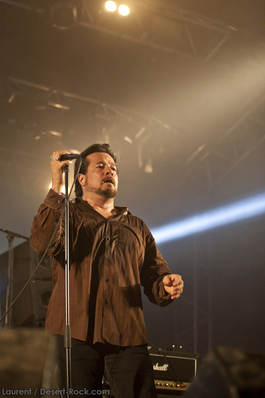 L’annonce de UNIDA en tête d’affiche de la journée (et, disons-le entre nous, un peu la tête d’affiche de la Valley sur le week end pour beaucoup d’entre nous…) en a motivé plus d’un à prendre leur ticket pour le festival de l’Enfer cette année. Les voir calés dans le Running Order en synchro parfaite avec Black Sabbath pouvait faire grincer quelques dents… Et alors que l’on traverse une Valley désertique (oui, c’est un peu sa raison d’être, c’est vrai…) à quelques dizaines de minutes du début du set, on se dit que niveau affluence, ça sera pas gagné ce soir… Heureusement, pas mal de monde a fait comme nous, et après quelques titres de Sabbath, le public rejoint progressivement une Valley qui se gonfle d’expectative… A l’heure prévue, les zicos montent sur scène pour lancer le riff jubilatoire de « Wet Pussycat », ce qui fait vite arriver un John Garcia vers qui, inévitablement, tous les regards se tournent. Faut dire que Cancino et Seay, en purs team players, adoptent une posture bien plus posée et en retrait que durant House Of Broken Promises. C’est Curt Christenson, le bassiste de Dixie Witch, qui prend en charge la quatre-cordes sur cette tournée, et c’est un foutrement bon casting : le bassiste a du groove à revendre, et rappelle furieusement le type de jeu rond et organique de Scott Reeder. Garcia, en revanche, n’est pas à fond dans le set au démarrage. Il part chercher ses lunettes au milieu du premier titre (la chanson continue sans lui !), il bugge sur un couplet de « Thorn » (confronté à un « trou », il s’interrompt sur une mesure ou deux, reprend en cours de route)… On l’a vu plus à l’aise que sur ce début de concert : même si son professionnalisme cache son inconfort, le gars n’est pas encore bien dedans… Mais petit à petit, il rentre dans le set et les titres suivants sont impeccables. On peut d’ailleurs le remarquer : il se permet des petites impros ou nouveaux aménagements de certaines lignes vocales généralement bien sentis, signe d’un confort grandissant de sa part. La set list enchaîne les perles, pour une large part issues de l’album « fantôme » du groupe, avec toujours vis-à-vis d’un public bouillantissime la même efficacité. Se détacheront de nos souvenirs enfumés « Human Tornado » et son riff redoutable, le langoureux « Summer », mais aussi les plus anciens « Red », super efficace, et « Nervous », propice à une démo riff-esque de Arthur Seay cette fois encore, MVP de la journée. Étonnamment, les titres les plus percutants du « dernier » album, que sont « MFNO » ou « Puppet Man / Coffee Song » ne sont pas ceux qui fonctionnent le mieux sur scène (ils n’ont objectivement ni la même pêche que sur disque, ni le même son non plus, pas de secret…). Tout ça est chaleureux, et alors que le rugissant « Dwarf it » vient amorcer la dernière partie du set, tout le monde est incandescent. A la fin de « Hangman’s Daughter » qui le suit, petit moment surréaliste : Garcia vient voir Arthur Seay et lui dit d’improviser un instrumental, avant de s’échapper discrètement sur le bord de scène. Ni une ni deux, Seay échange deux mots avec Cancino et Christenson, et s’engagent dans une jam au début un peu balbutiante, à base de blues rock classique pour commencer, qui va vite prendre son essor et permettre notamment au guitariste de montrer l’étendue de son potentiel. Cette jam épique dure bien une petite dizaine de minutes, pendant lesquelles Garcia regarde ses copains en fumant une cigarette (si si, mauvaises langues !) sur le bord de scène. A ce moment-là, le public (qui croit que tout ça est prévu !) est complètement rentré dans cette jam complètement hallucinée, et le groupe a emplafonné depuis longtemps le créneau horaire qui lui était attribué (sans conséquence, étant donné qu’ils étaient les derniers à jouer ce soir). Garcia revient enfin sur scène et s’empare du micro devant ce parterre mi béat mi médusé, pour se lancer dans un « Black Woman » absolument jouissif, qui finit de mettre la Valley sur les genoux. On n’aurait pu imaginer meilleure fin de set et de journée…