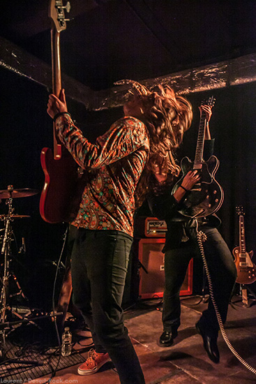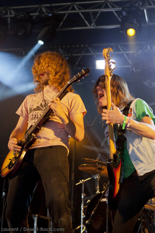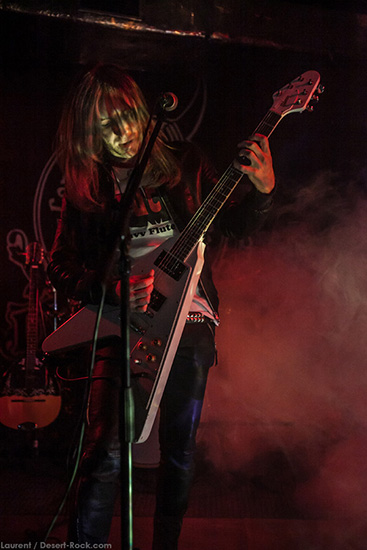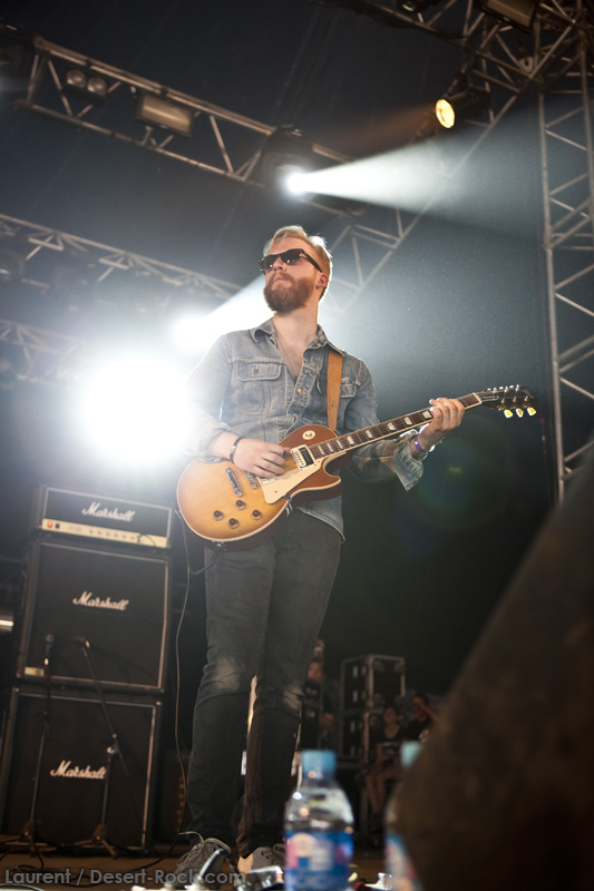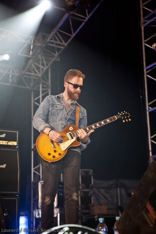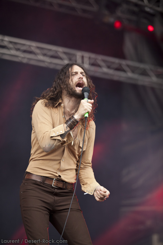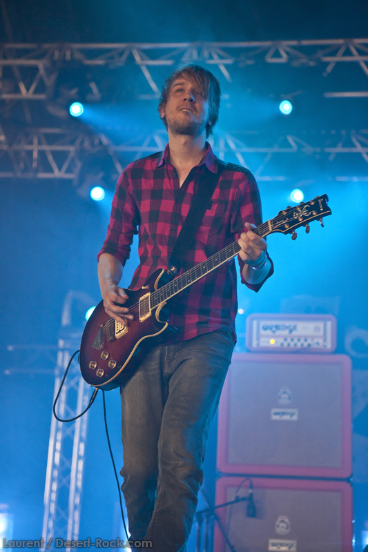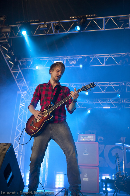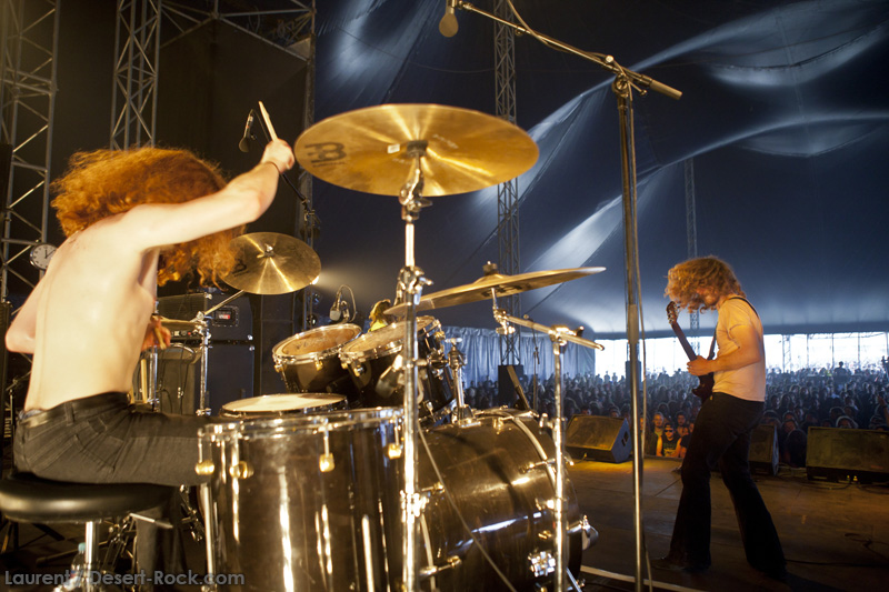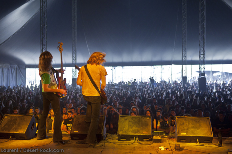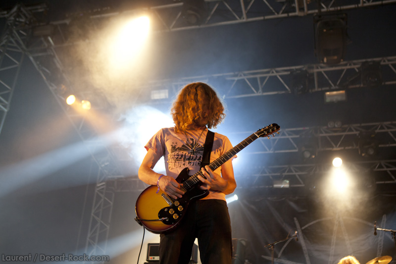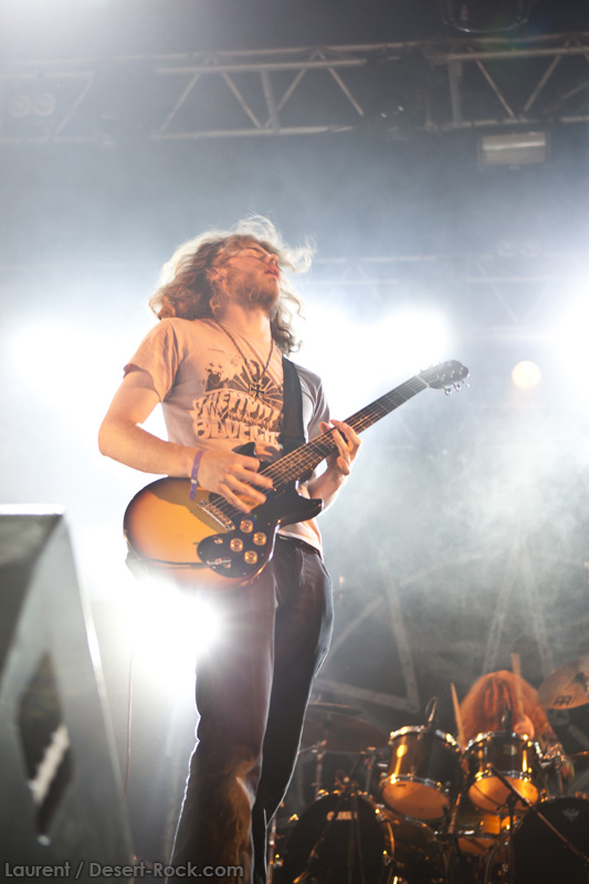 Apparemment on est bien enfoncés dans le trip vintage, puisque c’est maintenant aux allemands de ZODIAC de monter sur scène. Et là aussi, c’est du sérieux : ils ont beau avoir l’air souriants, ils sont pas là pour la déconne, ils sont venus pour rentabiliser ces quarante petites minutes en mettant tout ce qu’ils ont sur la table. Du coup le concert est dense, énergique, diversifié… Sacré professionnalisme, on ne s’ennuie pas une minute. Faut dire que sur scène, on n’a pas des guignolos qui se regardent les godasses pendant trois quarts d’heure : menés par un parfait leader charismatique en la personne de Nick van Delft, le groupe est complètement en harmonie et dispense la même énergie, avec une unité qui force le respect. Toutes les facettes du combo y passent, les titres les plus énergiques, les balades bluesy (une bonne version de « Cortez the killer », le titre de Neil Young, avec quelques soli bien sentis et une belle performance vocale de Van Delft, qui fait montre ici d’une chaleur dans son chant tout à fait remarquable) ou les jams boogie à rallonge, avec quelques connotations sudistes occasionnelles : ainsi, lorsqu’à quelques minutes de la fin du set ils annoncent « this is our last song… but we’re gonna make this fucker long », on est contents de les voir se lancer dans l’épique « Coming Home », presque leur « Freebird » à eux en live, un titre lent puis mid tempo qui se termine en machine à jams sur fond de basse ronflante… Carton plein.