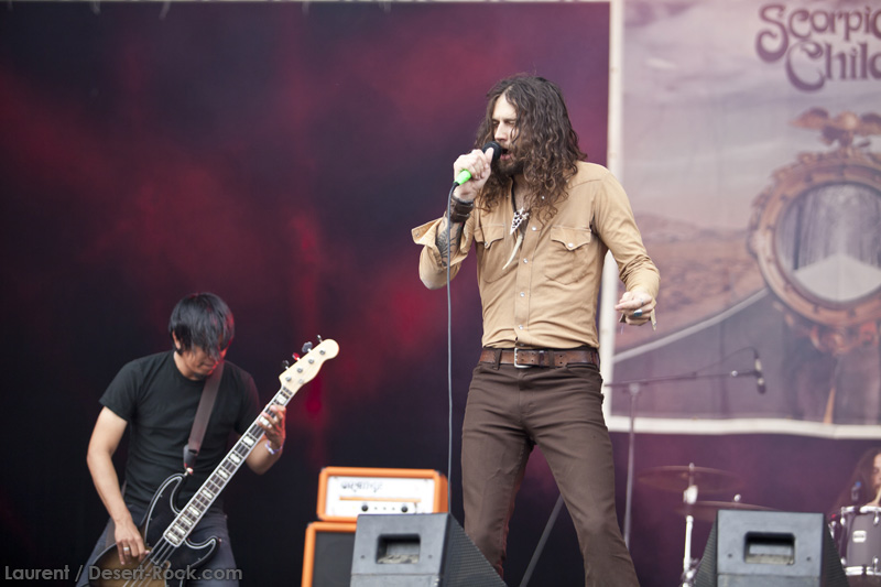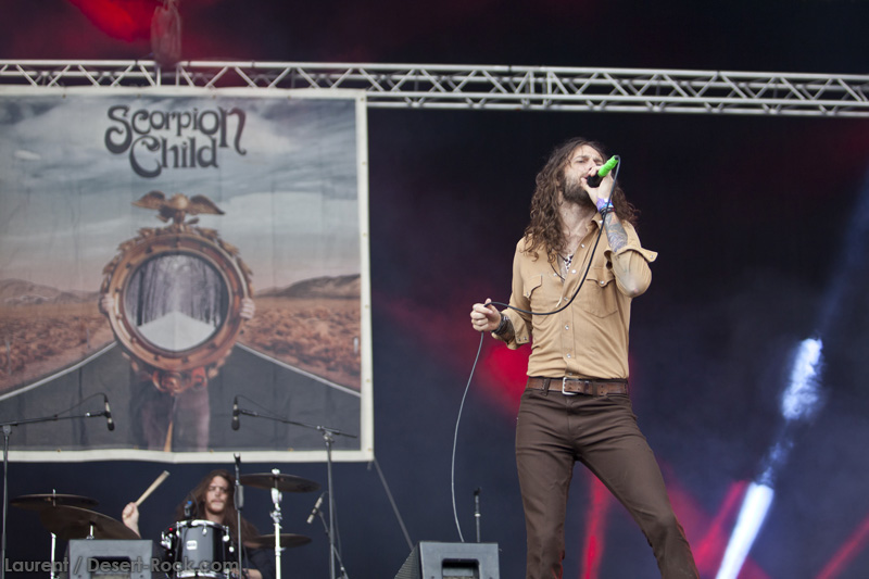 On se translate de quelques dizaines de mètres sur la Main Stage n°2 (mais qu’est-ce qu’ils ont aujourd’hui avec ces Main stages ?!) pour assister au set de SCORPION CHILD. Bon, on gagne peut-être une petite décennie dans le flash back, par rapport à Blues Pills, mais on est bien en plein dans un trip 100% vintage là aussi. Y’a beaucoup de Led Zep, un peu de Purple et de Free, et une dose de Uriah Heep / Blue Cheer pour le pendant subtilement psyche de tout ça. Rien de mal à ça. Le chanteur aussi sonne un peu comme un ersatz de Plant, les mecs sont dedans, le public apprécie nonchalamment… Mais on ne va pas se voiler la face, c’est pas non plus le feu sacré ! Pas super original, pas le coup de pied au cul attendu (espéré ?), et en plus ce petit crachin et ce ciel nuageux ne fait rien pour améliorer notre humeur… On décide de retourner à la « maison », notre Valley chérie, après deux titres…