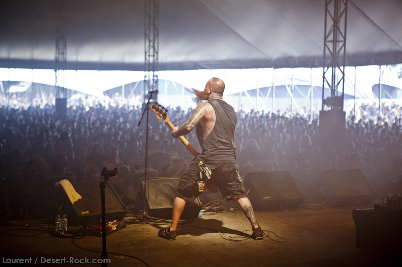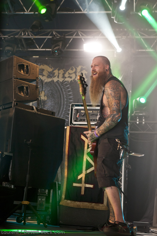 Les mecs de BLACK TUSK se sont chauffés au Whisky bas de gamme tout ce début d’aprem backstage, on commençait à les sentir chauds comme la braise avant leur montée sur scène. Apparemment c’est un bon combustible, parce que le groupe n’a pas fait de quartier durant ses cinquante minutes de set. Une vraie boucherie. Pour ceux qui ne connaissent pas le trio ricain, c’est une sorte de sludge aux rythmiques plutôt rapides, un truc au croisement du thrash et du stoner. Les trois zicos se partagent les vocaux, ce qui est toujours impressionnant en tout cas pour un batteur. Au niveau du public, disons que placer Black Tusk entre l’heure de la digestion et l’heure du thé est sans doute un choix de programmation assez judicieux – ça évite le coup de mou ! Les musiciens sont au taquet, tout sourires, ils sont clairement là pour s’éclater, et ceci décuple l’énergie de leur set, qui se transmet par mimétisme au public, déchaîné. Les premiers (et rares) pogos naissent d’ailleurs sous la Valley durant leur set. Andrew et Jonathan sont complètement dedans, arpentent la scène sans répit, et abattent des riffs cinglants par dizaines. Étonnant d’ailleurs de voir deux musiciens aussi en phase « scéniquement », ils sont tous les deux souriants, interagissent, vont voir le public… On notera par ailleurs l’efficacité confirmée des titres du dernier album, avec en particulier un doublon « Enemy Of Reason » / « In Days Of Woe » pour conclure un set brutal mais efficace. Exactement ce qu’il fallait pour faire monter la tension dans cette tente jusqu’ici emplie de « cool vibes »… Une tuerie.