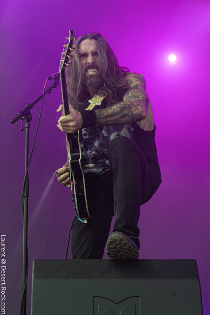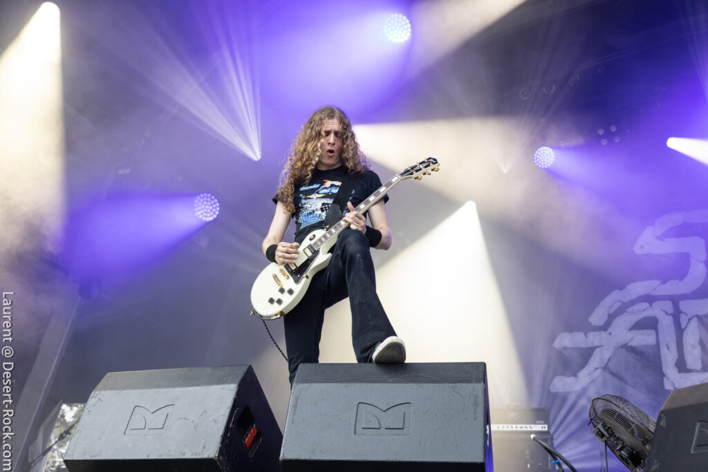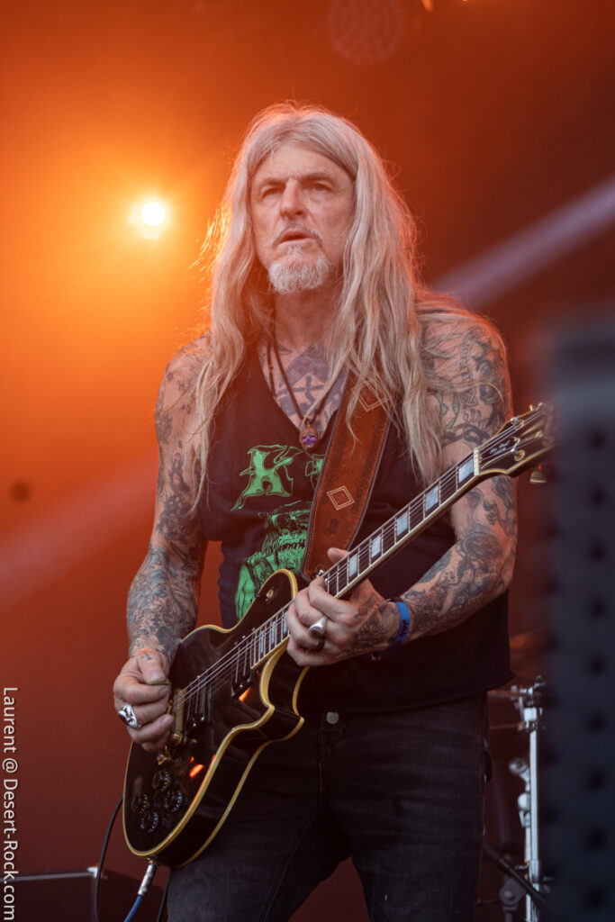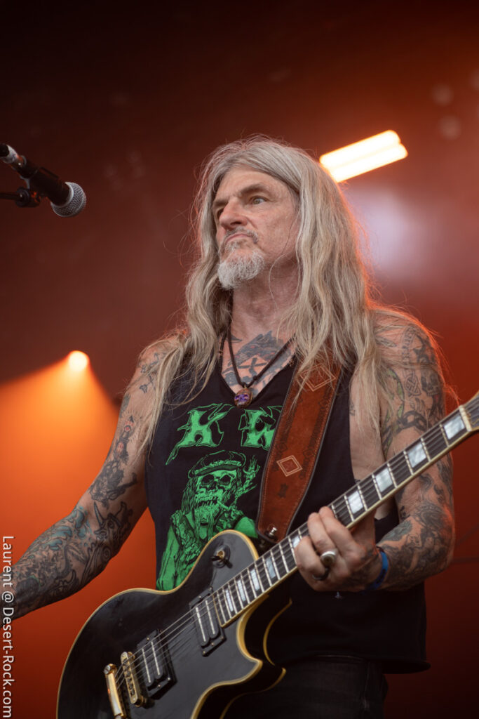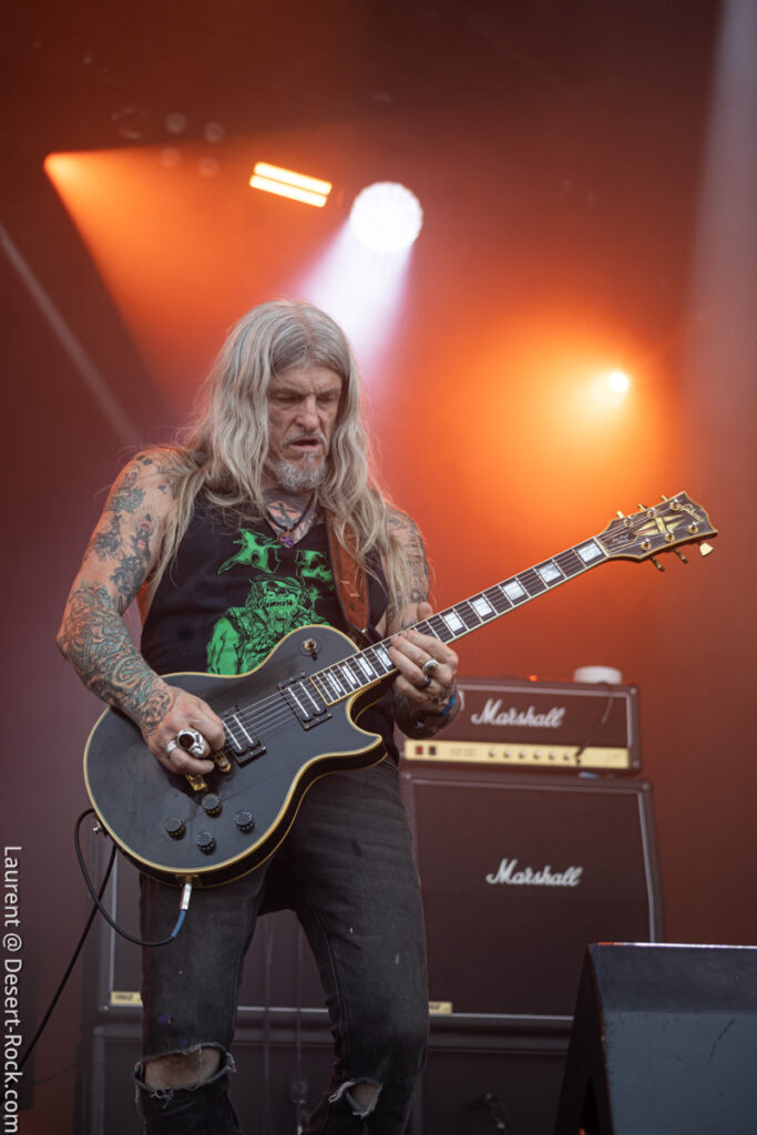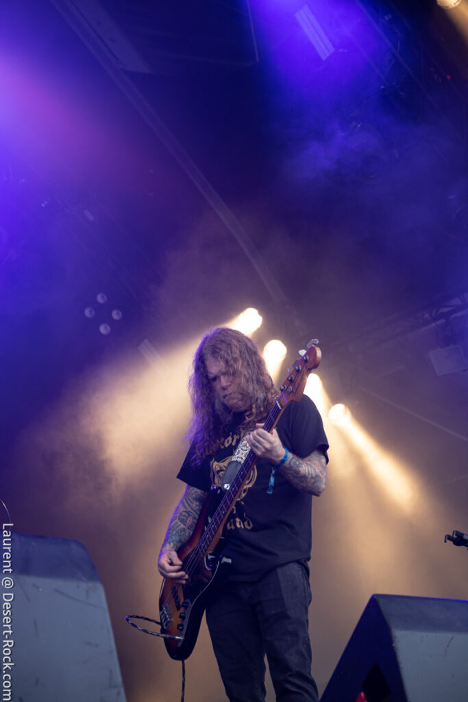 Old school as well, Spirit Adrift porte son heavy metal vintage jusque dans la façon des gratteux de poser leurs accords, d’un geste finissant médiator brandi vers le ciel. Le public lui aussi brandit le poing et les cornes sous cette avalanche de riffs féroces et précis enfoncés à coups de cymbale crash. Se félicitant d’ouvrir la voie aux guitaristes de prestige qui se succèderont ici ce jour, et auxquels il rend un hommage sincère, le groupe monté et emmené par Nathan Garett se paie même le luxe de passer au banc d’essai du live son titre sorti le jour même. Déviant ostensiblement depuis quelques mois/années de leur doom metal des débuts, le groupe développe désormais des ambiances plus proches du heavy metal. La chorégraphie datée, les pieds sur les retours, a fait mouche quand bien même le registre musical était plus en lien avec ce qui allait se déployer dans la journée sur les main stages.