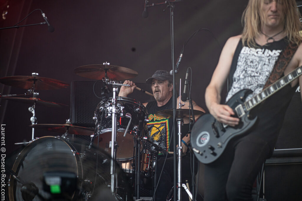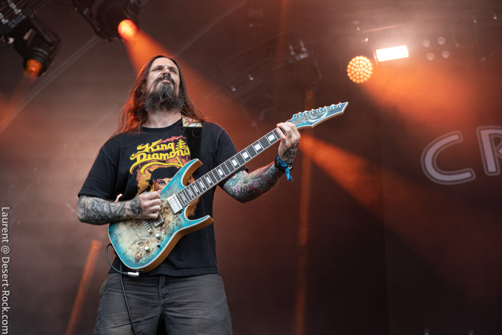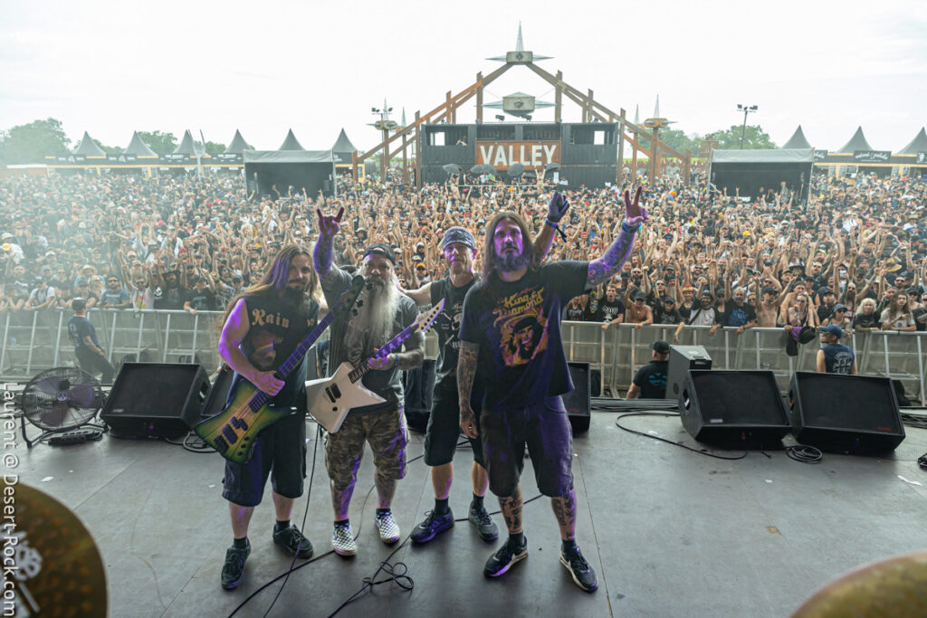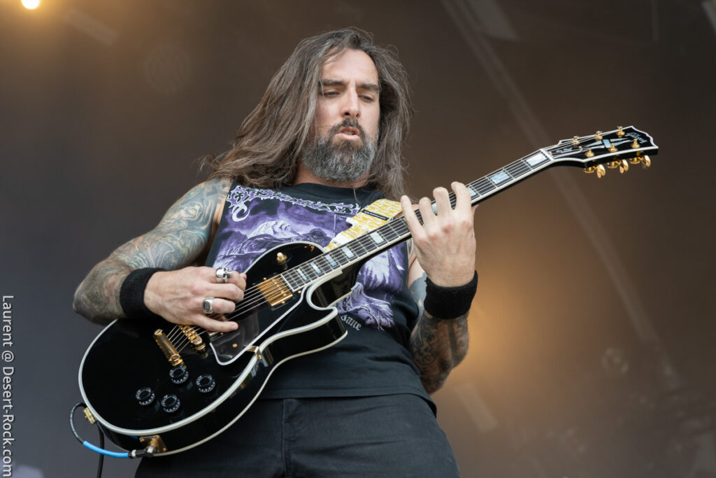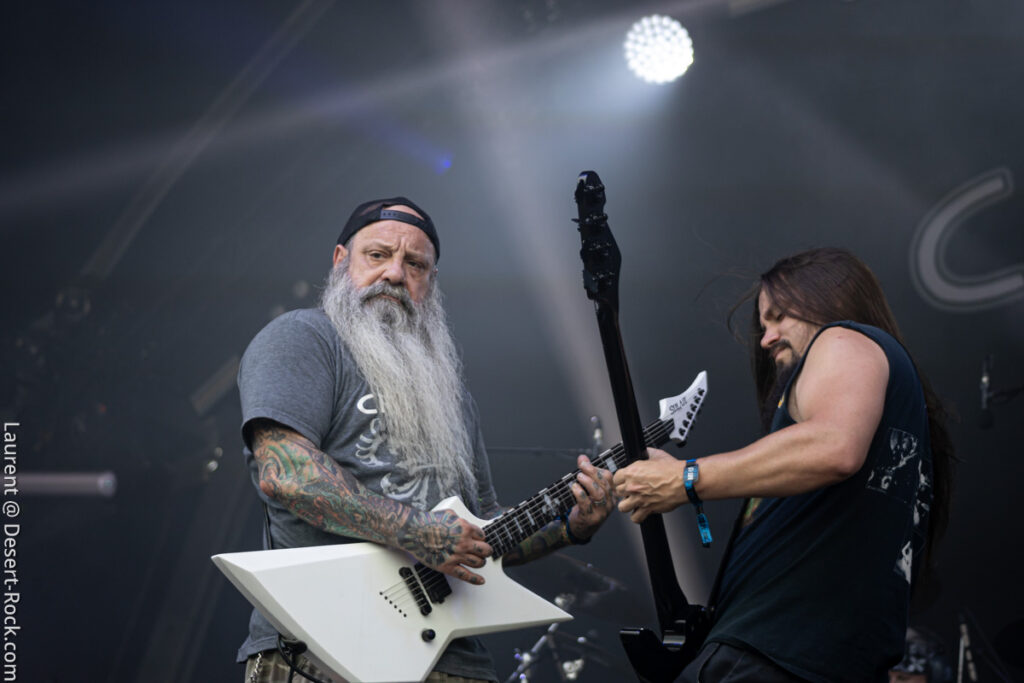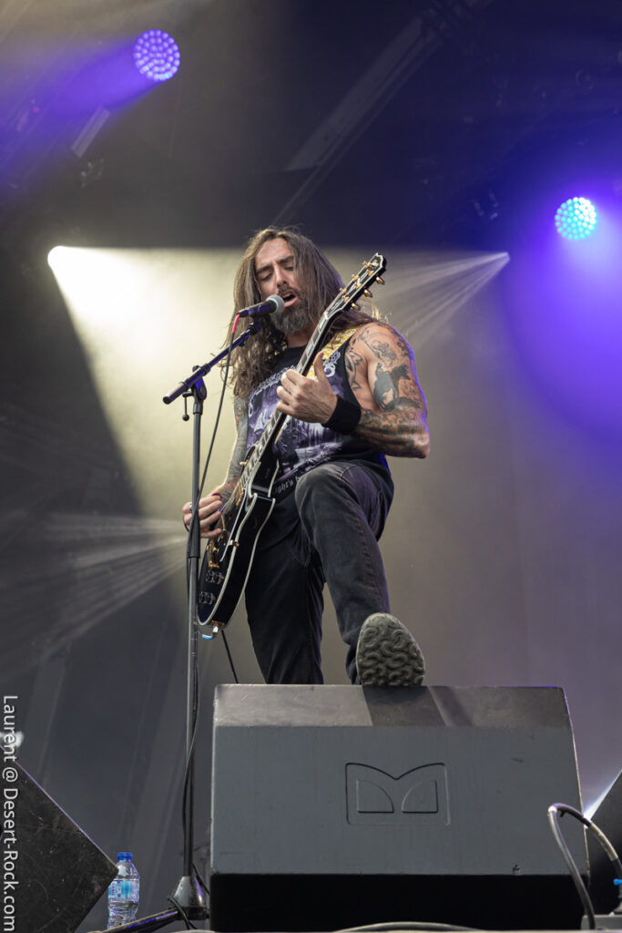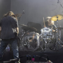 Old school as well, Spirit Adrift porte son heavy metal vintage jusque dans la façon des gratteux de poser leurs accords, d’un geste finissant médiator brandi vers le ciel. Le public lui aussi brandit le poing et les cornes sous cette avalanche de riffs féroces et précis enfoncés à coups de cymbale crash. Se félicitant d’ouvrir la voie aux guitaristes de prestige qui se succèderont ici ce jour, et auxquels il rend un hommage sincère, le groupe monté et emmené par Nathan Garett se paie même le luxe de passer au banc d’essai du live son titre sorti le jour même. Déviant ostensiblement depuis quelques mois/années de leur doom metal des débuts, le groupe développe désormais des ambiances plus proches du heavy metal. La chorégraphie datée, les pieds sur les retours, a fait mouche quand bien même le registre musical était plus en lien avec ce qui allait se déployer dans la journée sur les main stages.